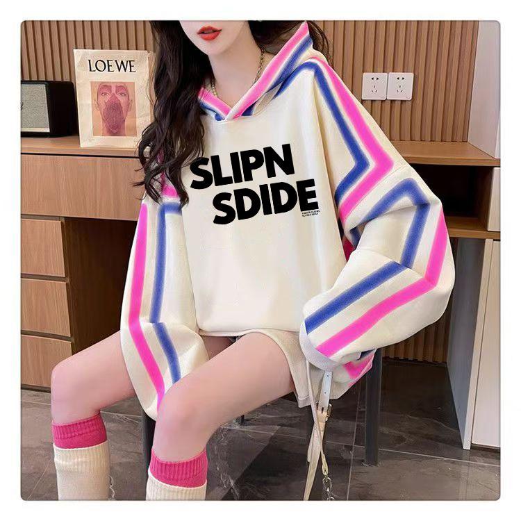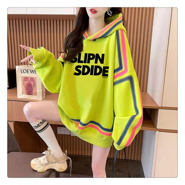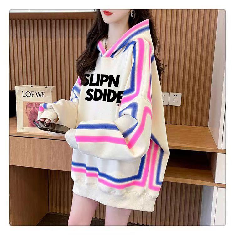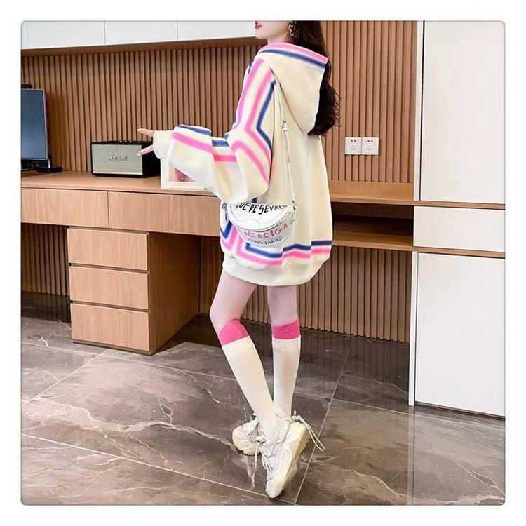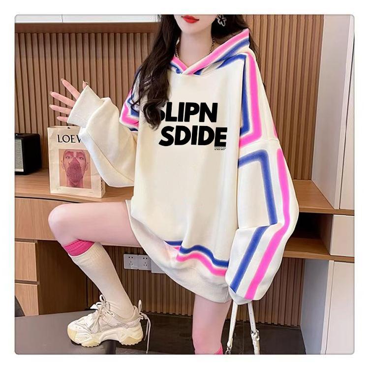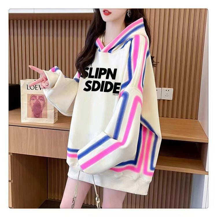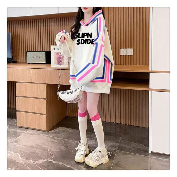 Sudadera con Capucha Gruesa con Forro Polar Estilo Holgazán con Estampado de Letras Otoño e Invierno Diseño de Líneas con Bloque de Color Estilo Japonés y Coreano