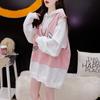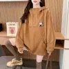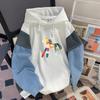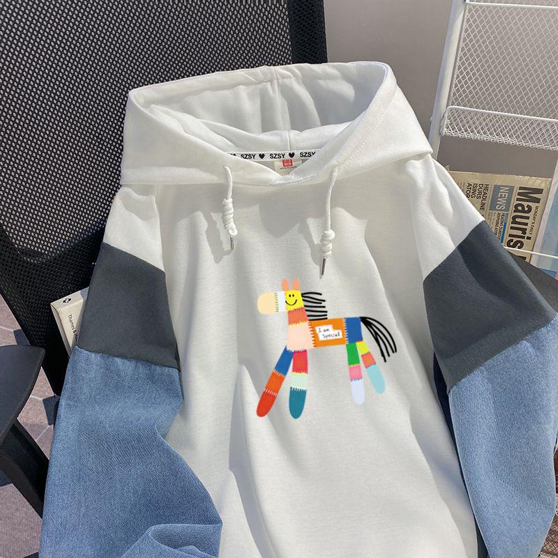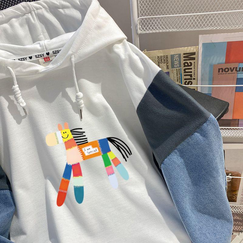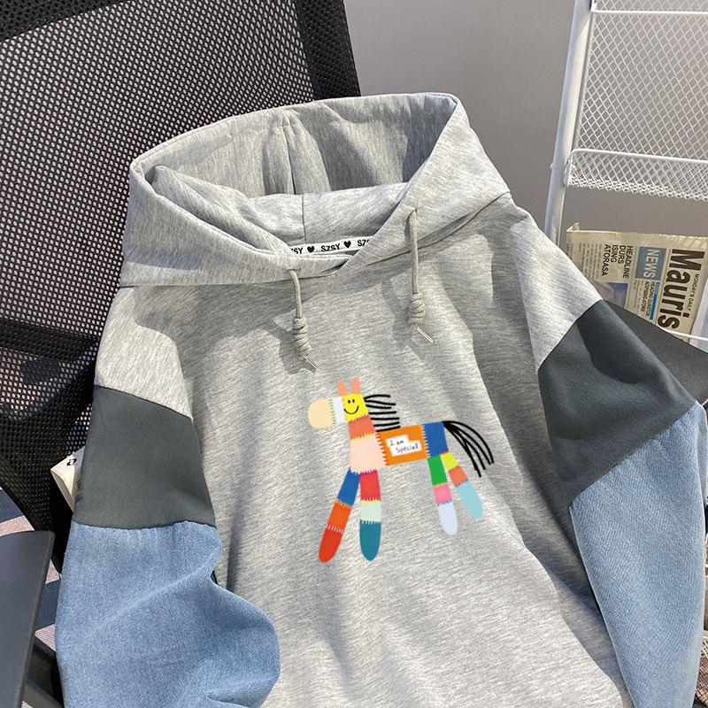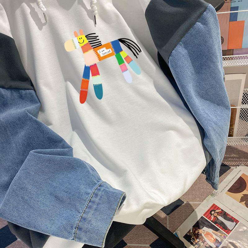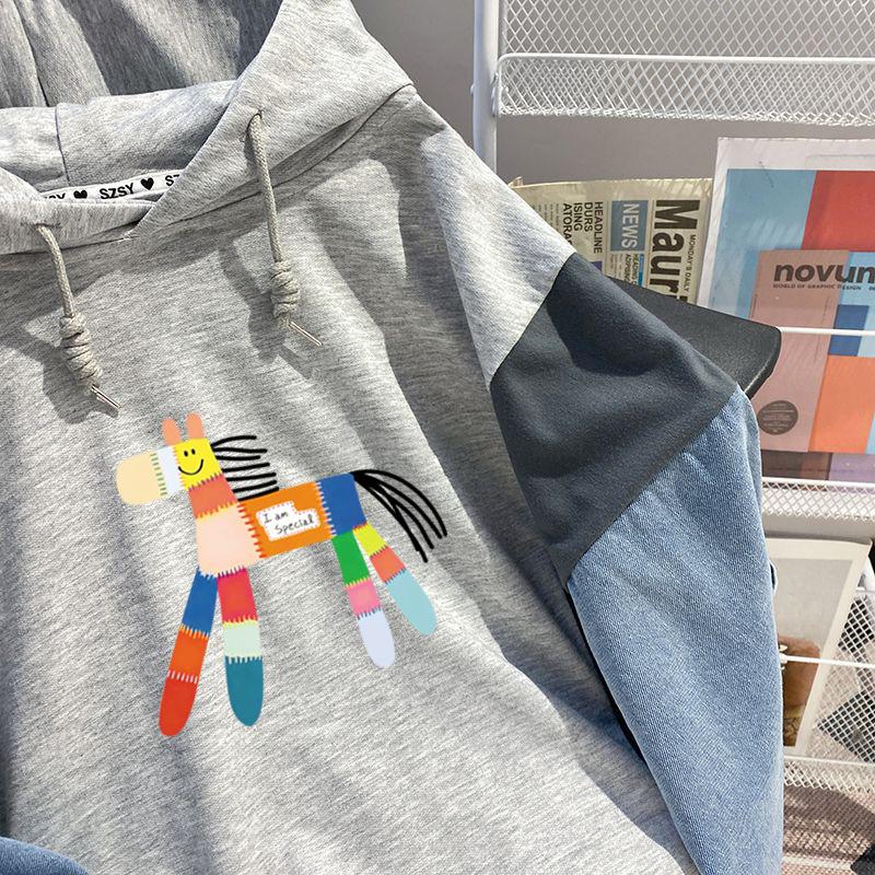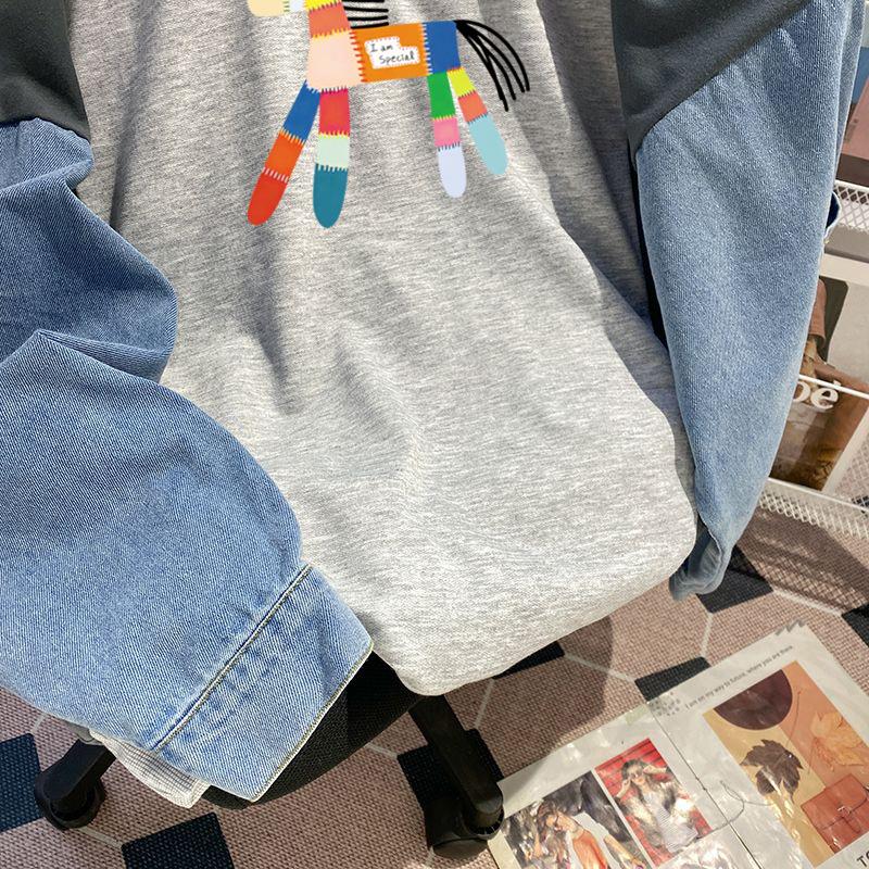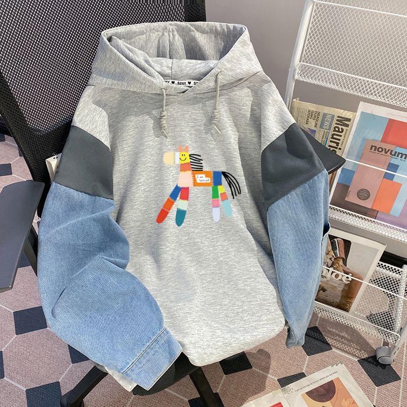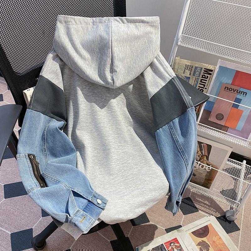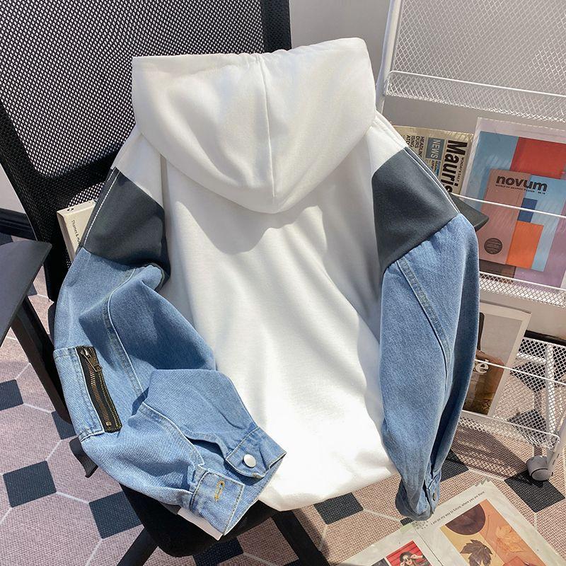 Sudadera con capucha de mezclilla patchwork talla extragrande 2-300 jin para mujer, estilo universitario holgado de primavera y otoño, top falso de dos piezas