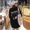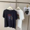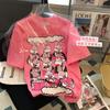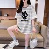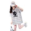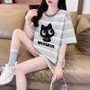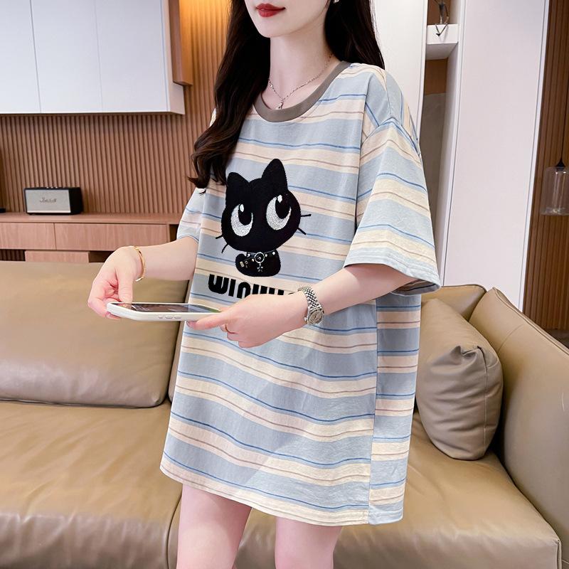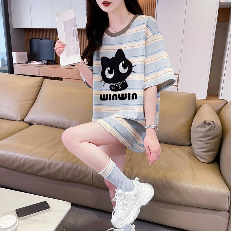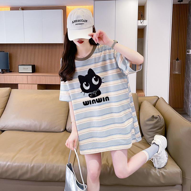 Playera de Moda de Color Block a Rayas Holgada para Mujer Verano Popular Estampado de Gato Largo Medio Slim Versátil Top