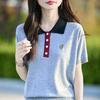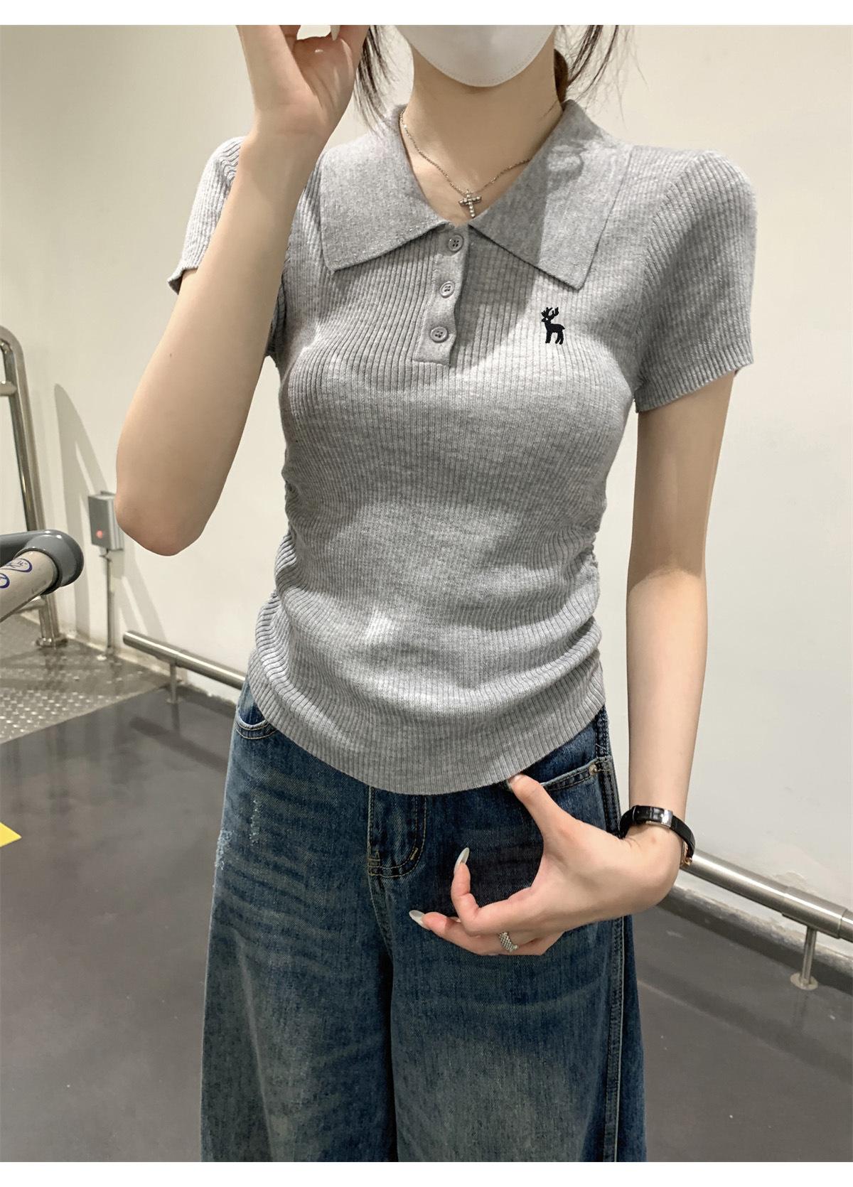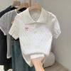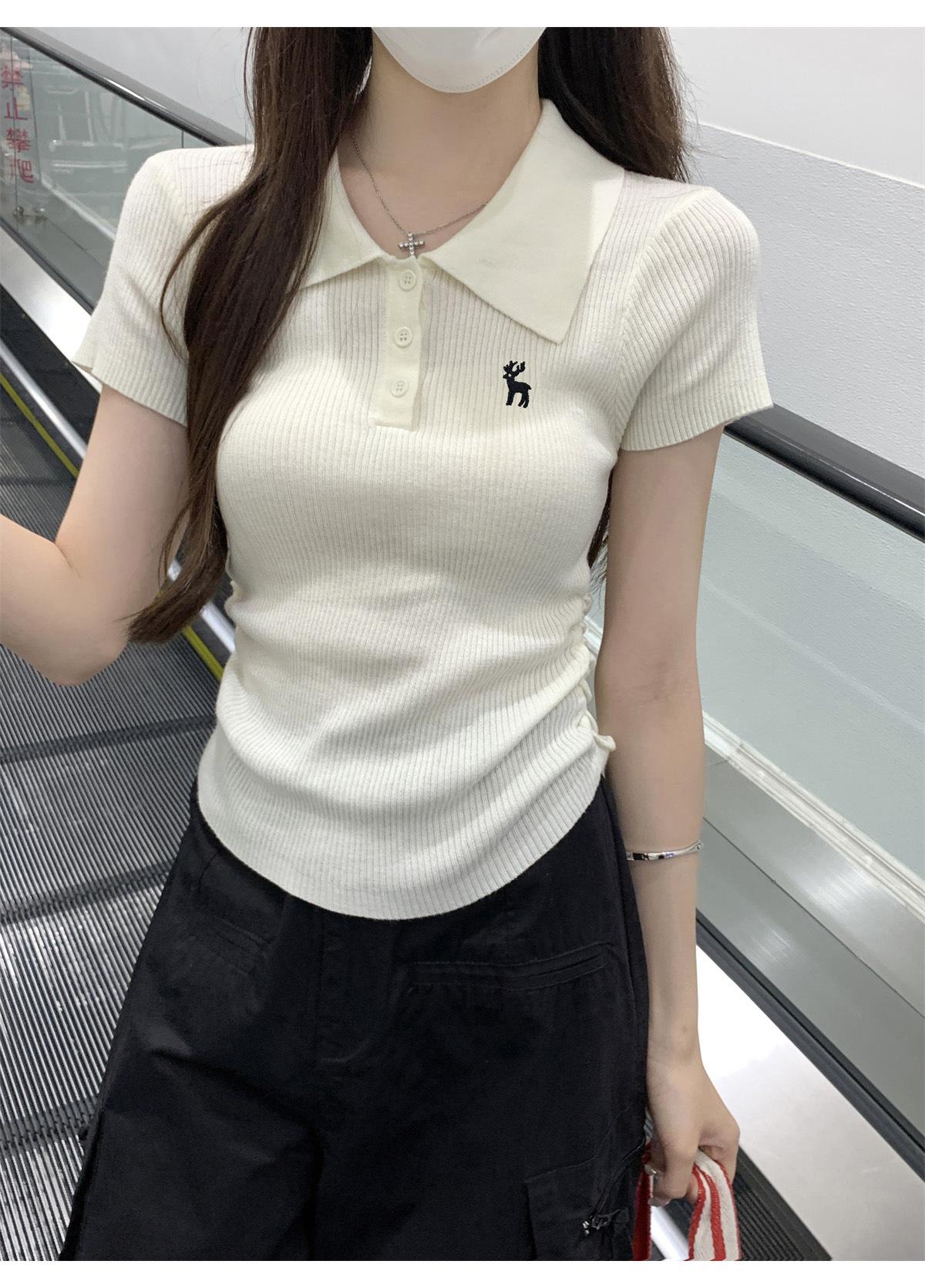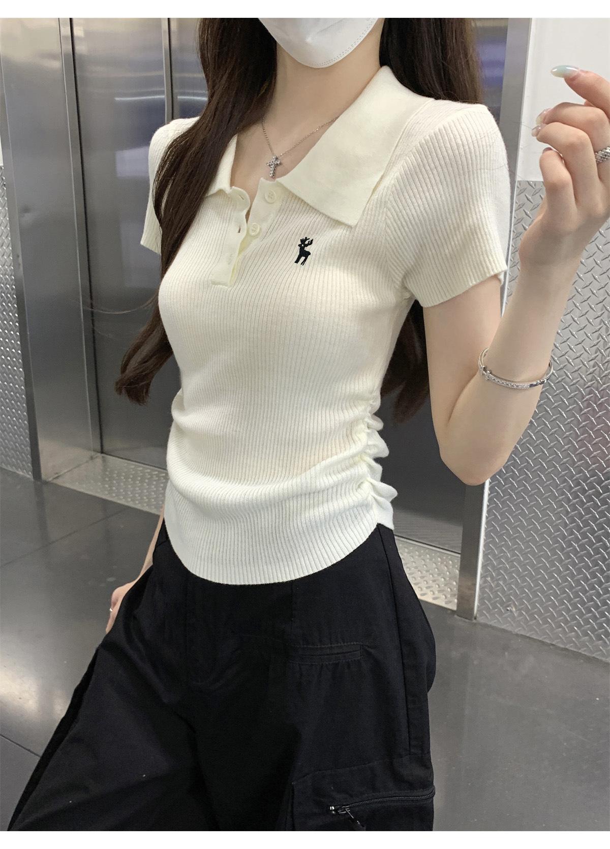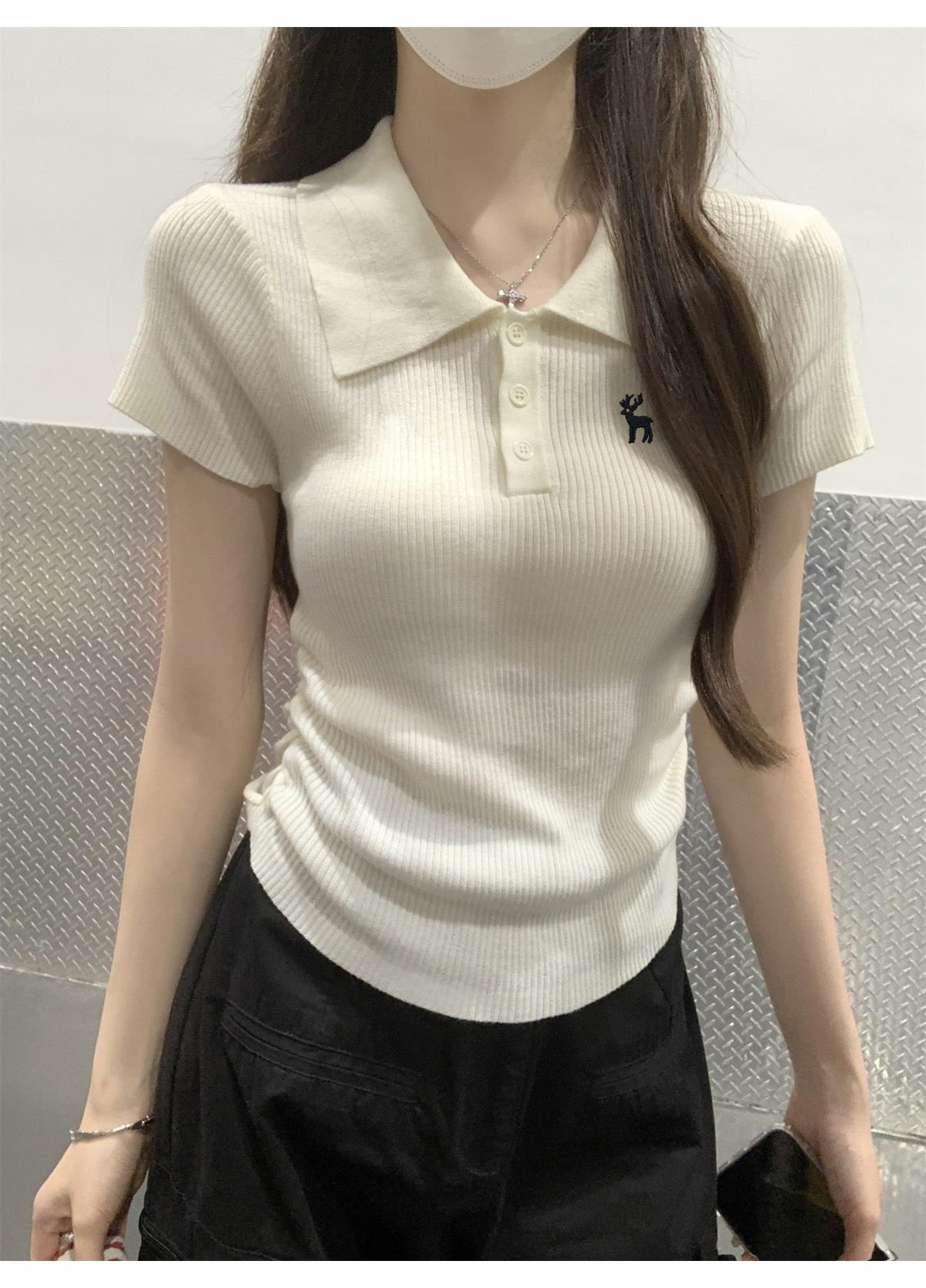 Polo Retro Bordado Cuello Abotonado Plisado Tejido de Punto Manga Corta de Verano para Mujer Nuevo Casual para Fondo Camiseta Top Trendy