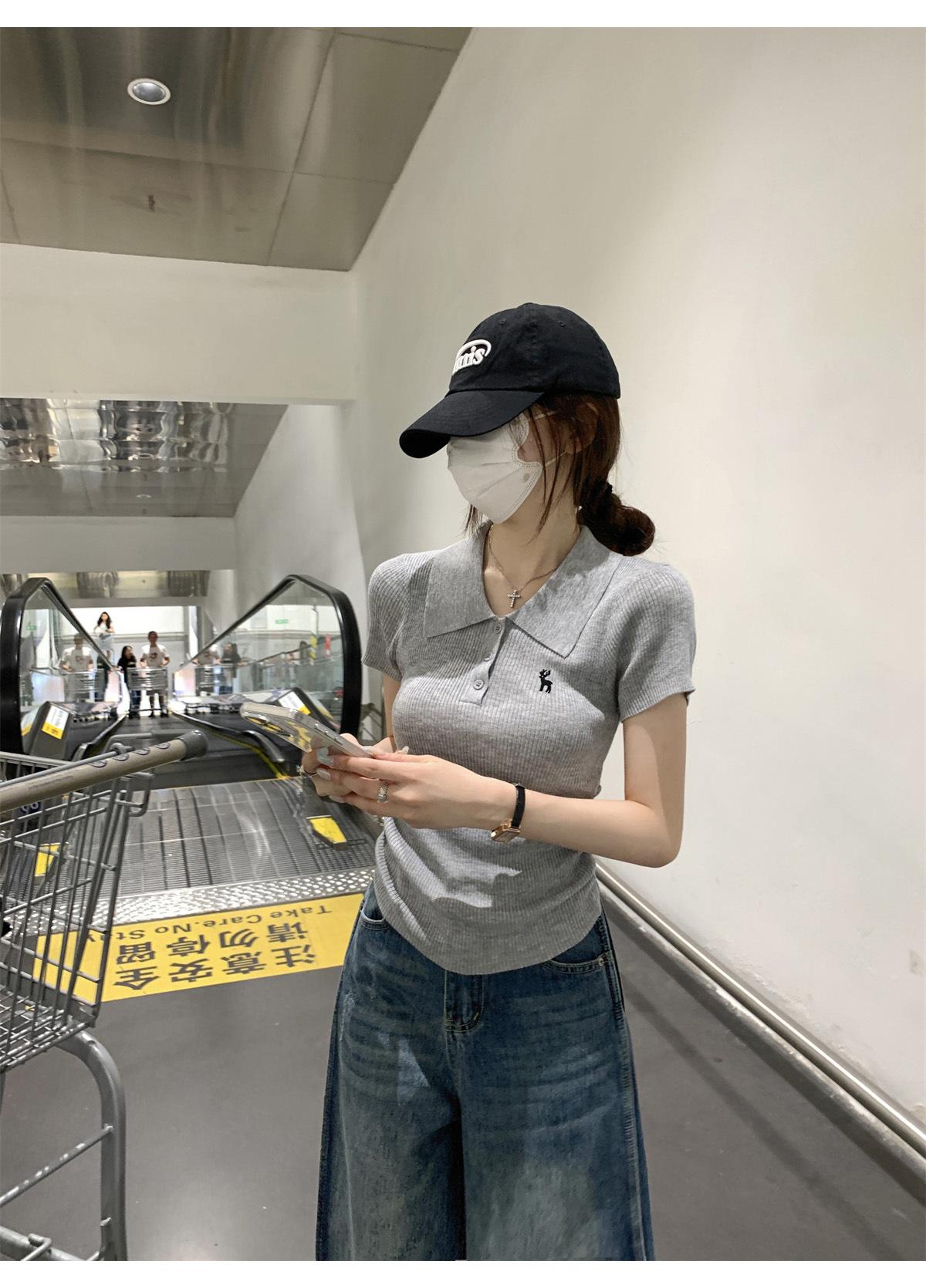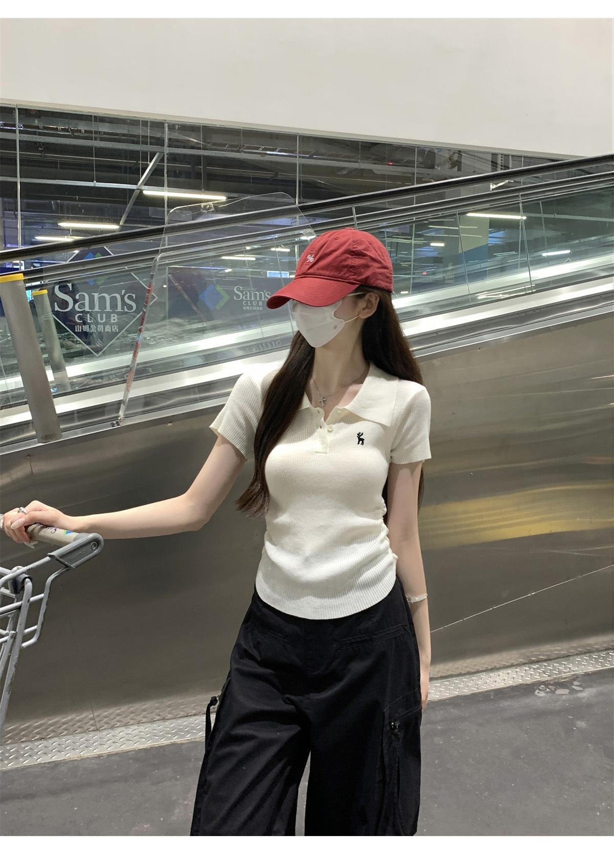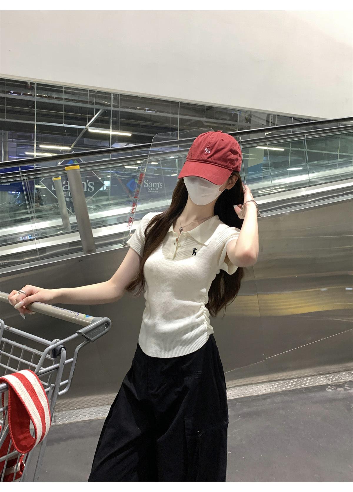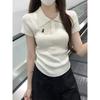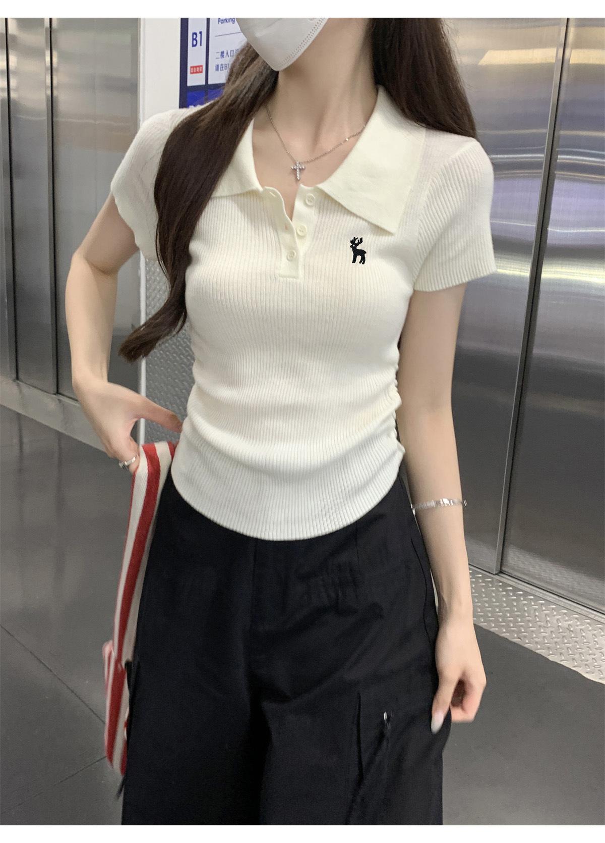 Polo Retro Bordado Cuello Abotonado Plisado Tejido de Punto Manga Corta de Verano para Mujer Nuevo Casual para Fondo Camiseta Top Trendy