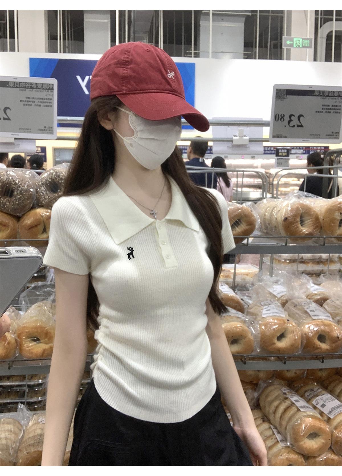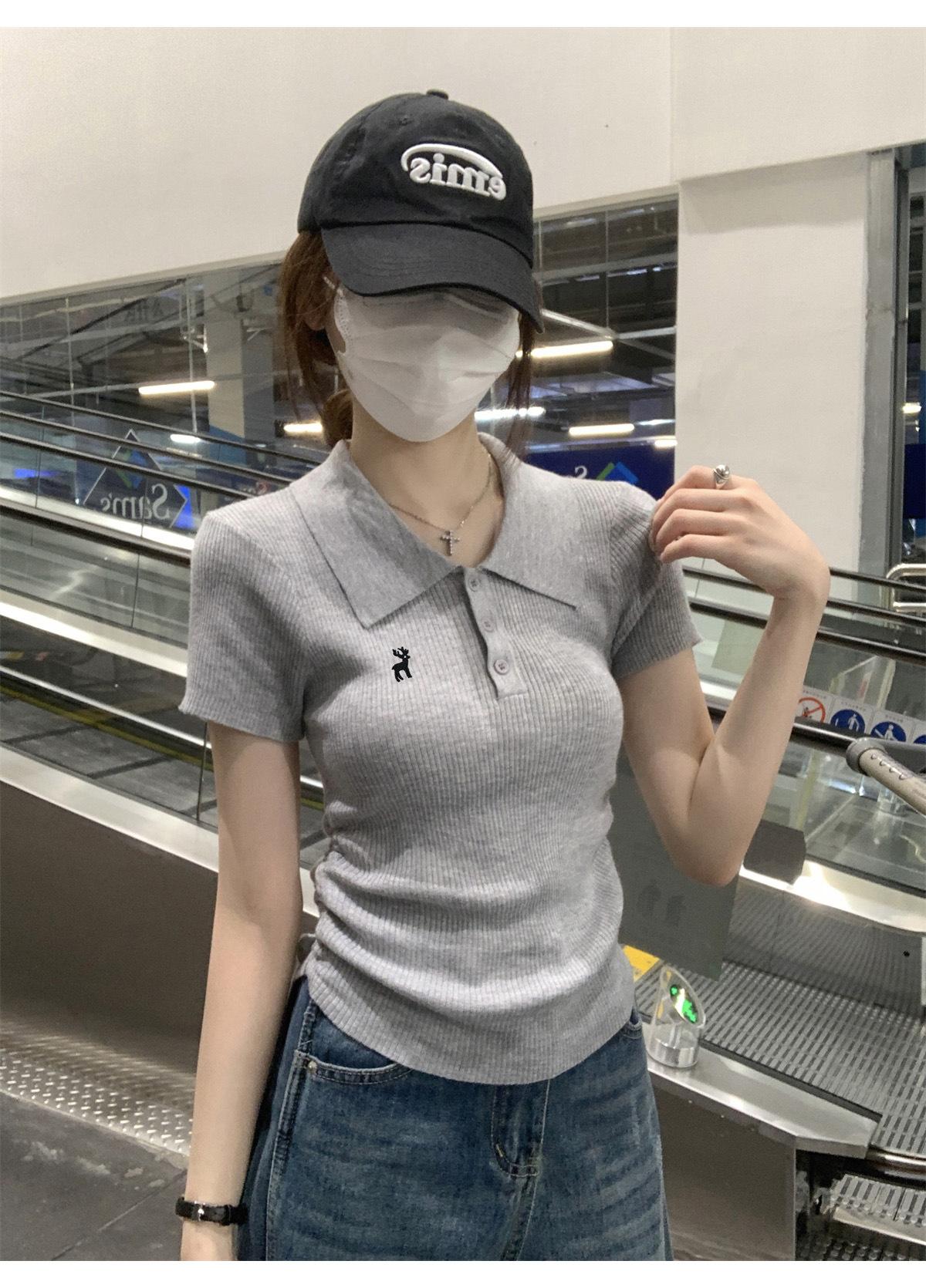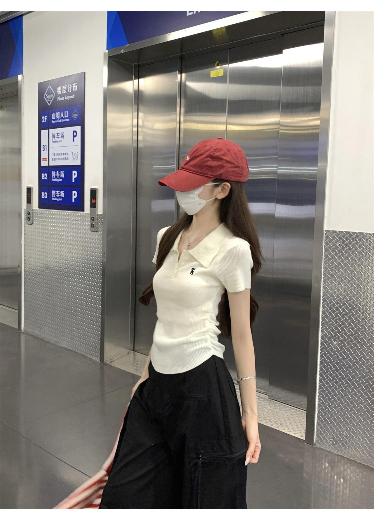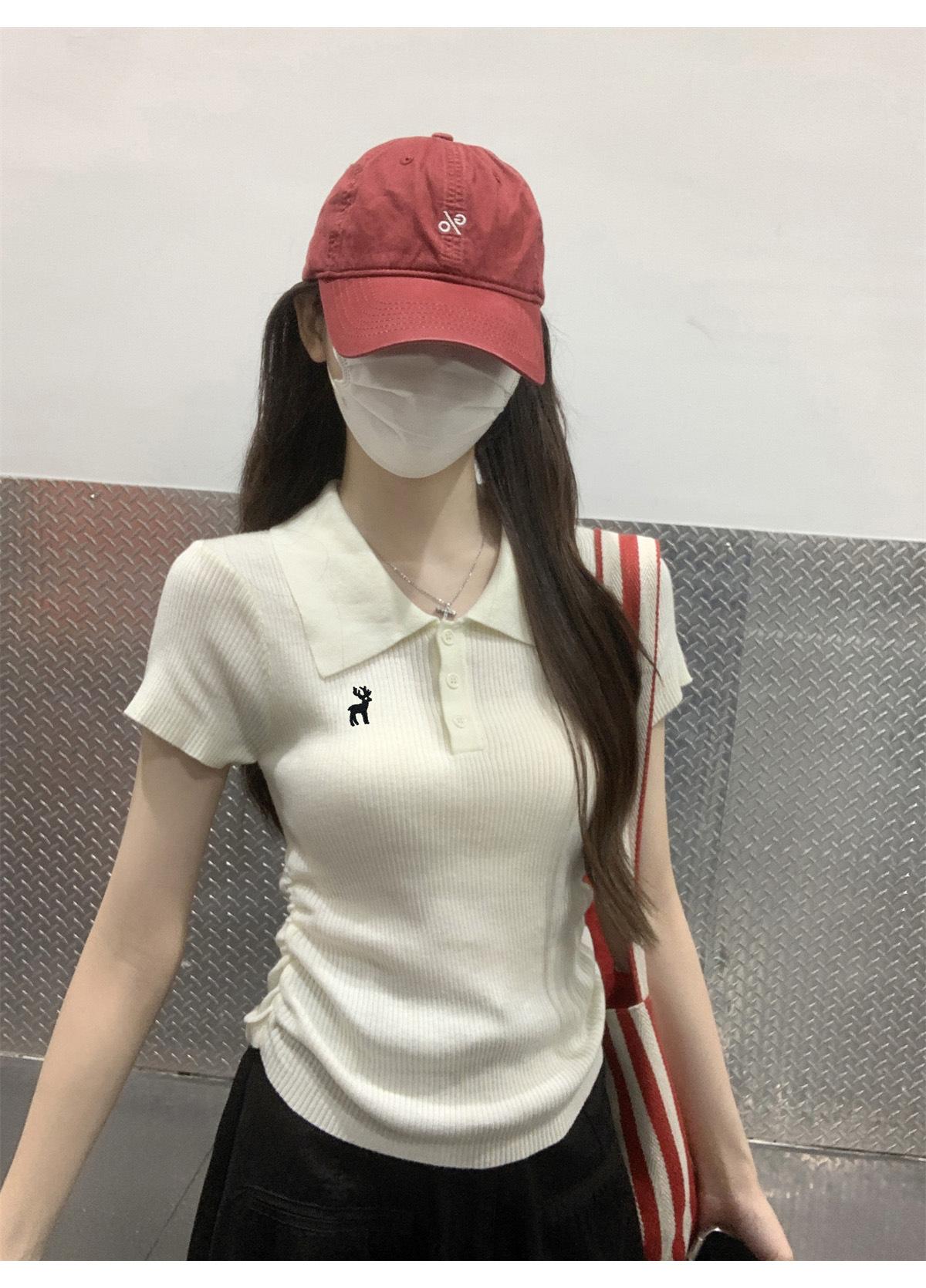 Polo Retro Bordado Cuello Abotonado Plisado Tejido de Punto Manga Corta de Verano para Mujer Nuevo Casual para Fondo Camiseta Top Trendy