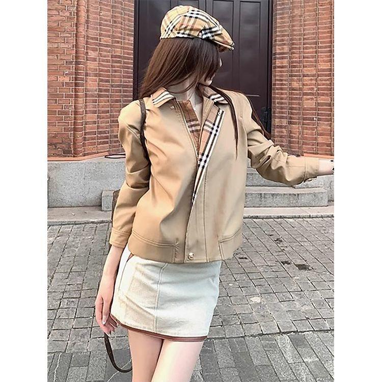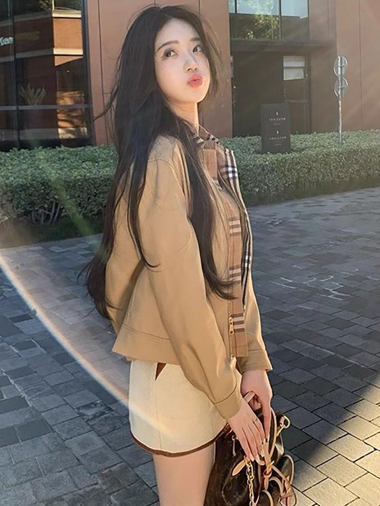 Diseño nicho sentido a cuadros patchwork cortavientos chaqueta corta mujer otoño nuevo persona pequeña a la moda chaqueta top que reduce la edad