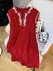 Vestido Retro Rojo de Manga Corta para Mujer Verano Nuevo Temperamento Único Exquisito Bordado Vestido Midi Estilo Étnico