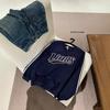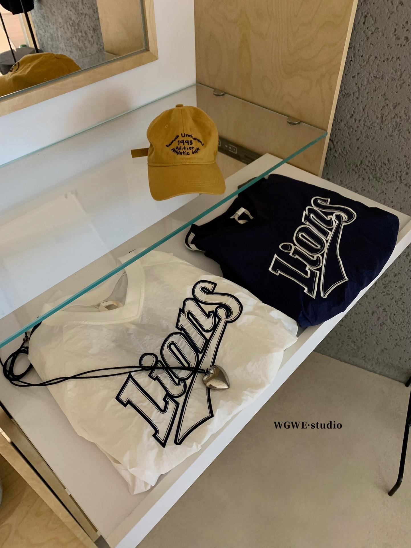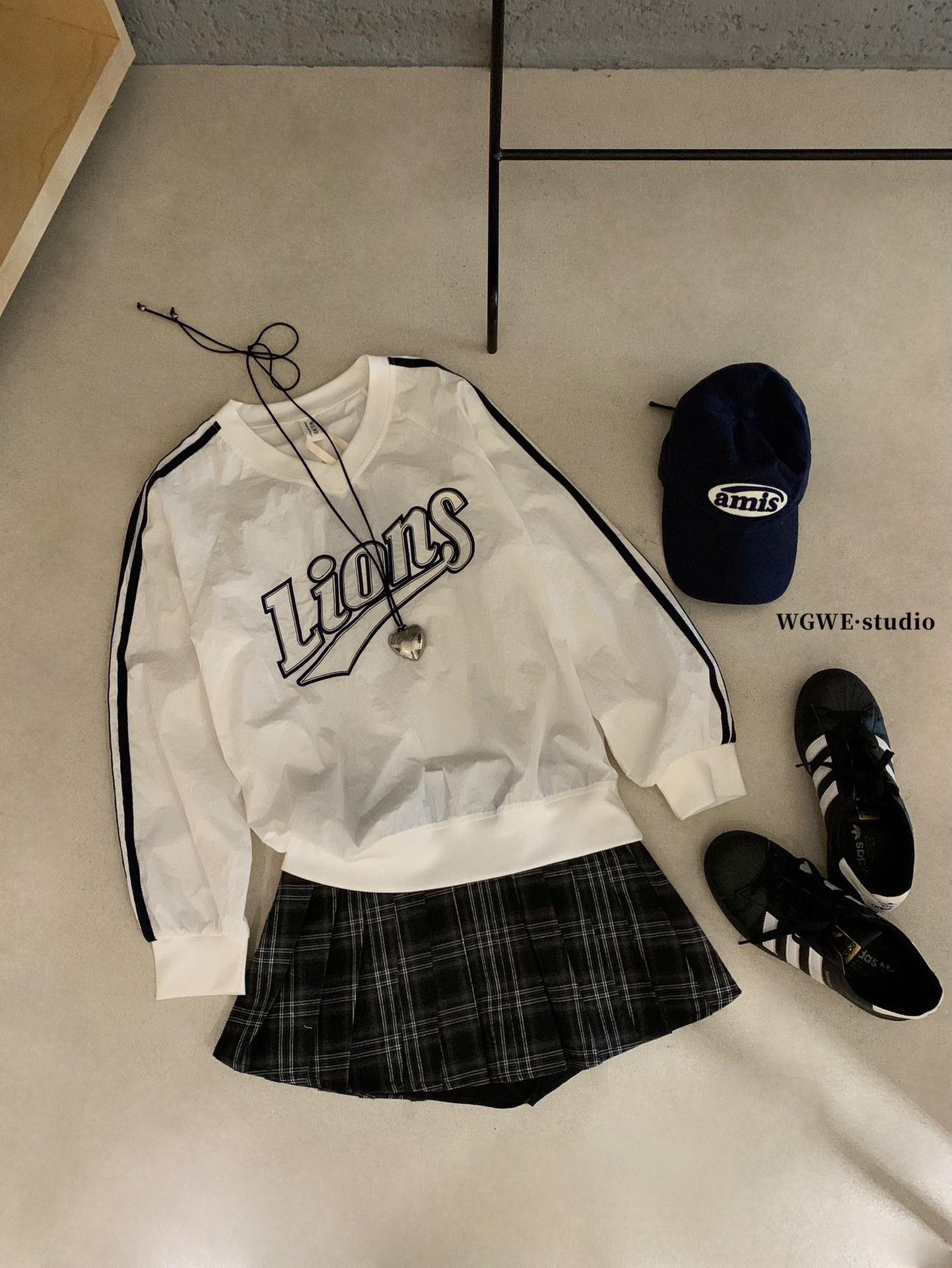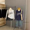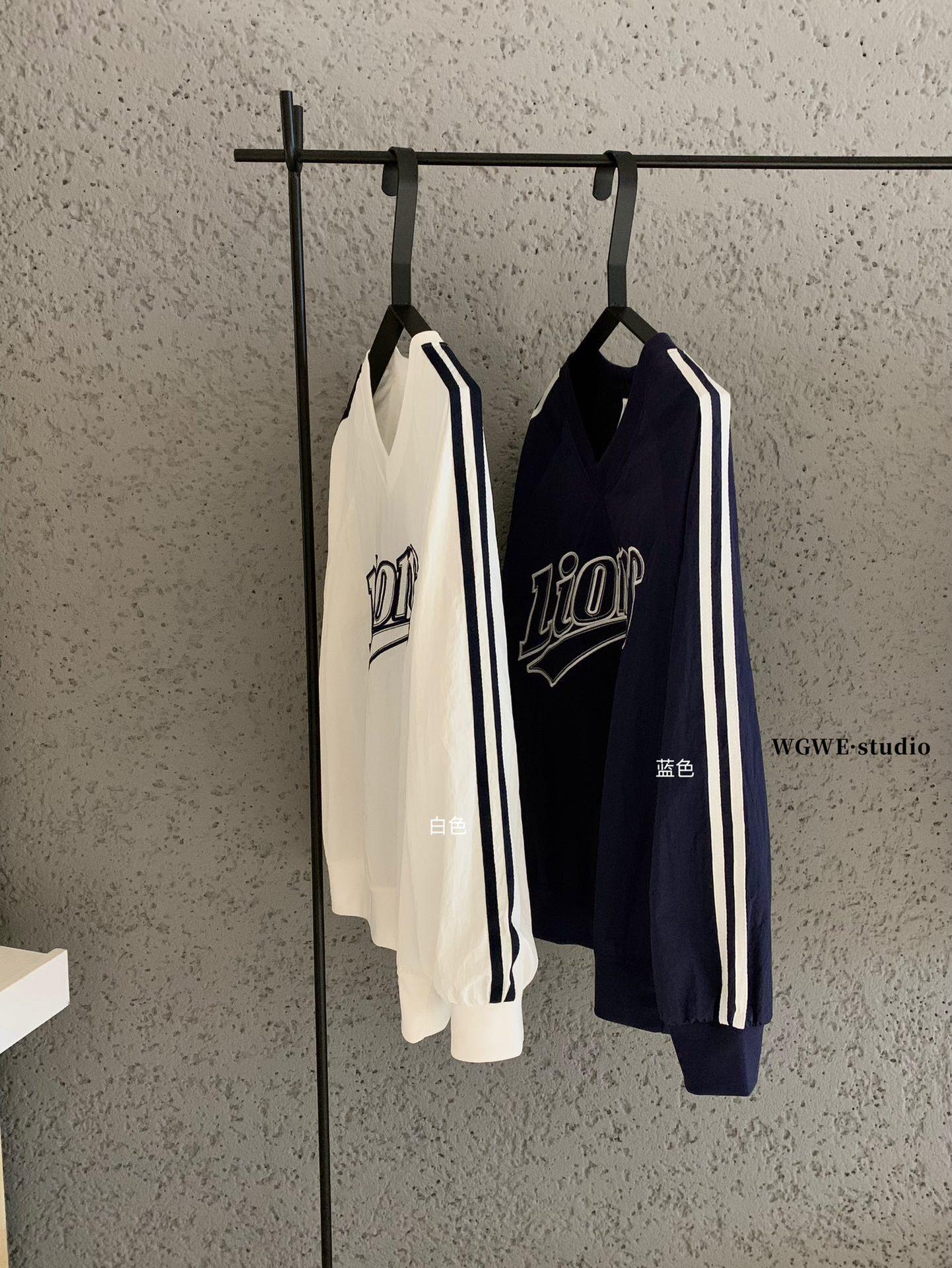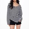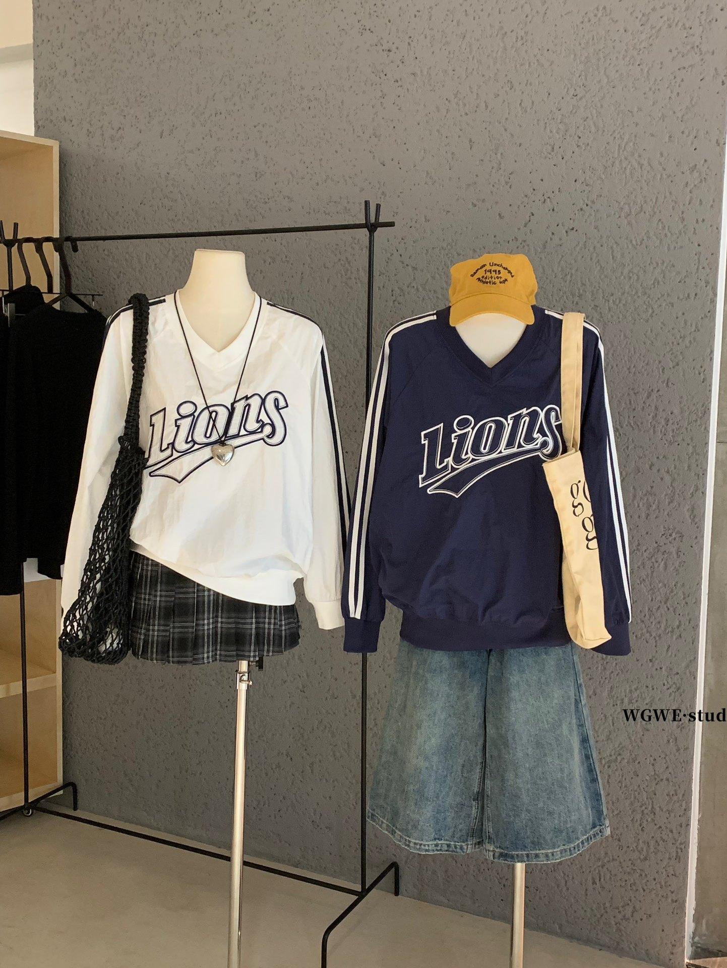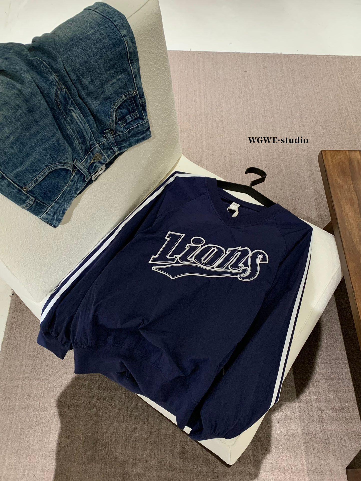WGWE6852#Otoño Mujer Estilo Retro Americano Lazy Estampado de Letras Marca de Moda Versátil Rayas Cuello en V Manga Larga Camiseta