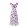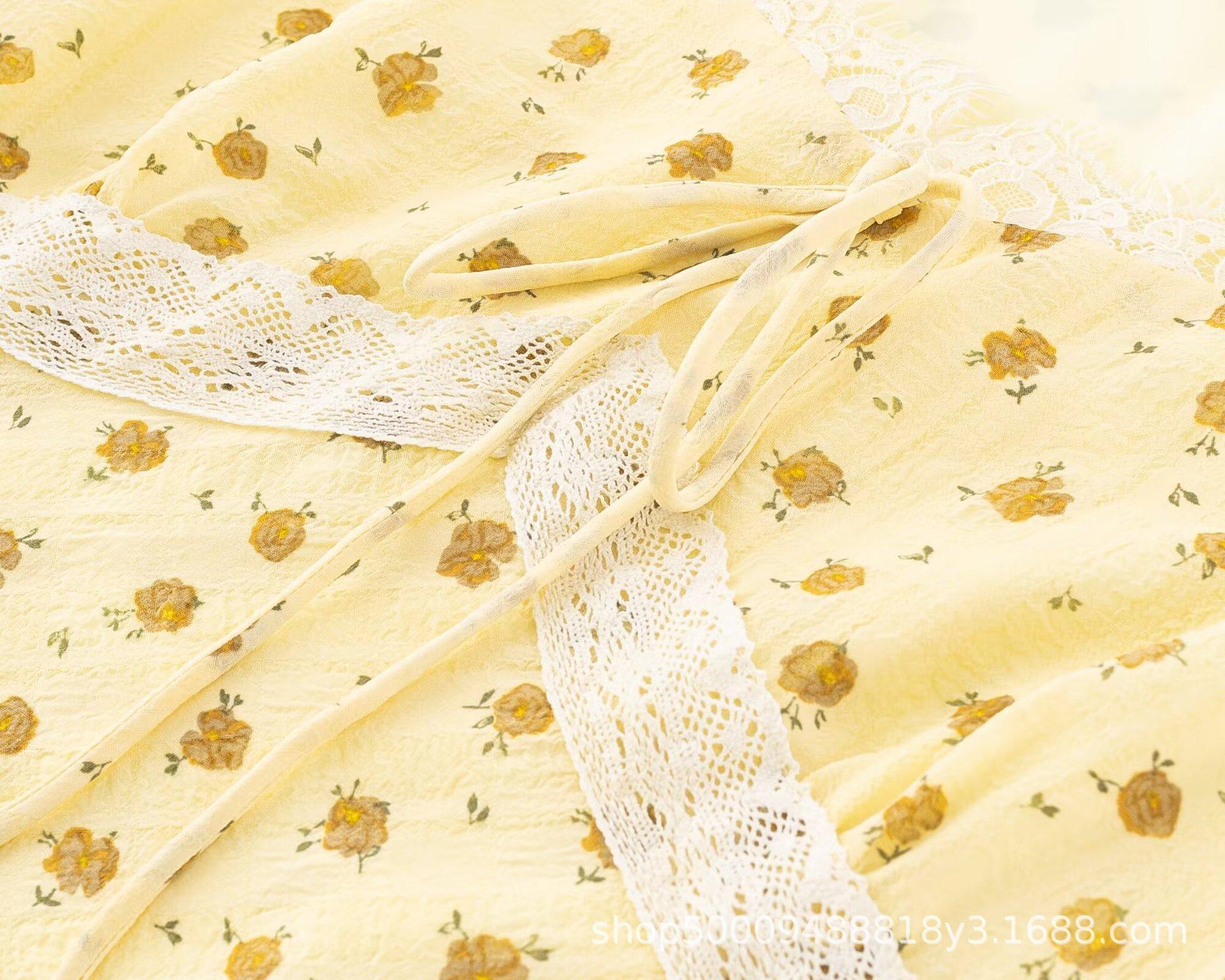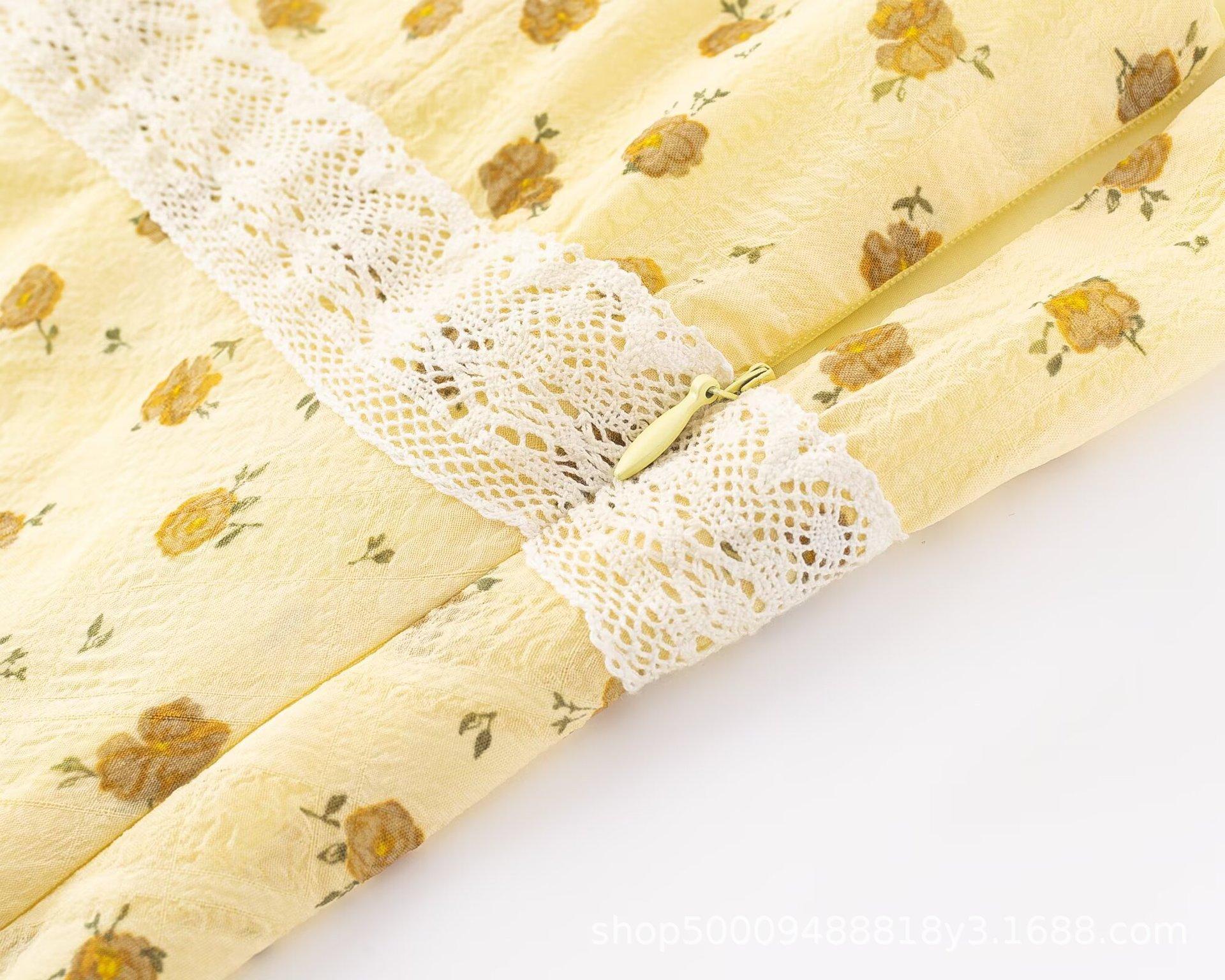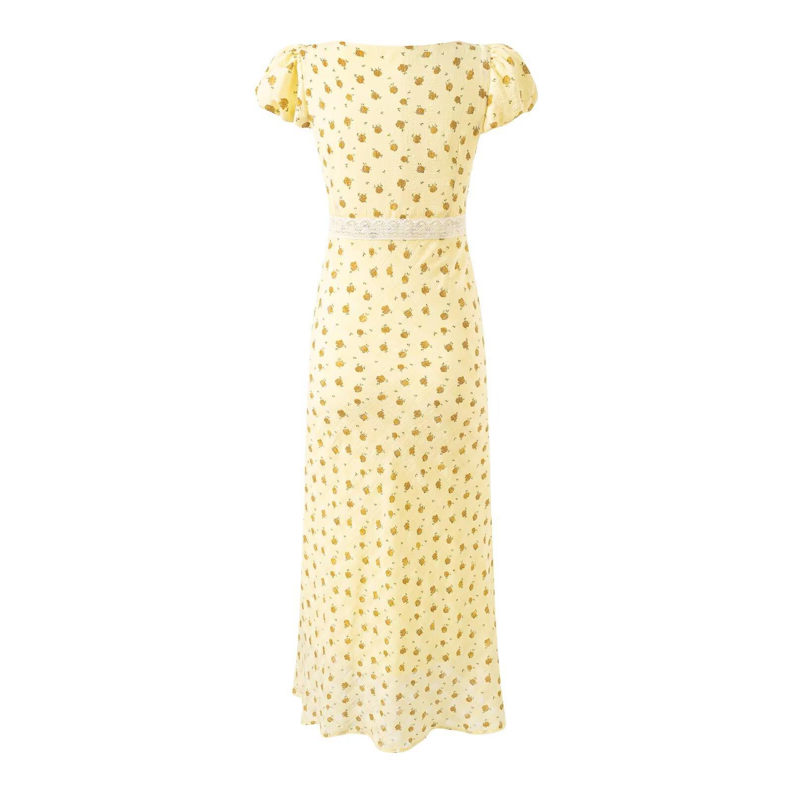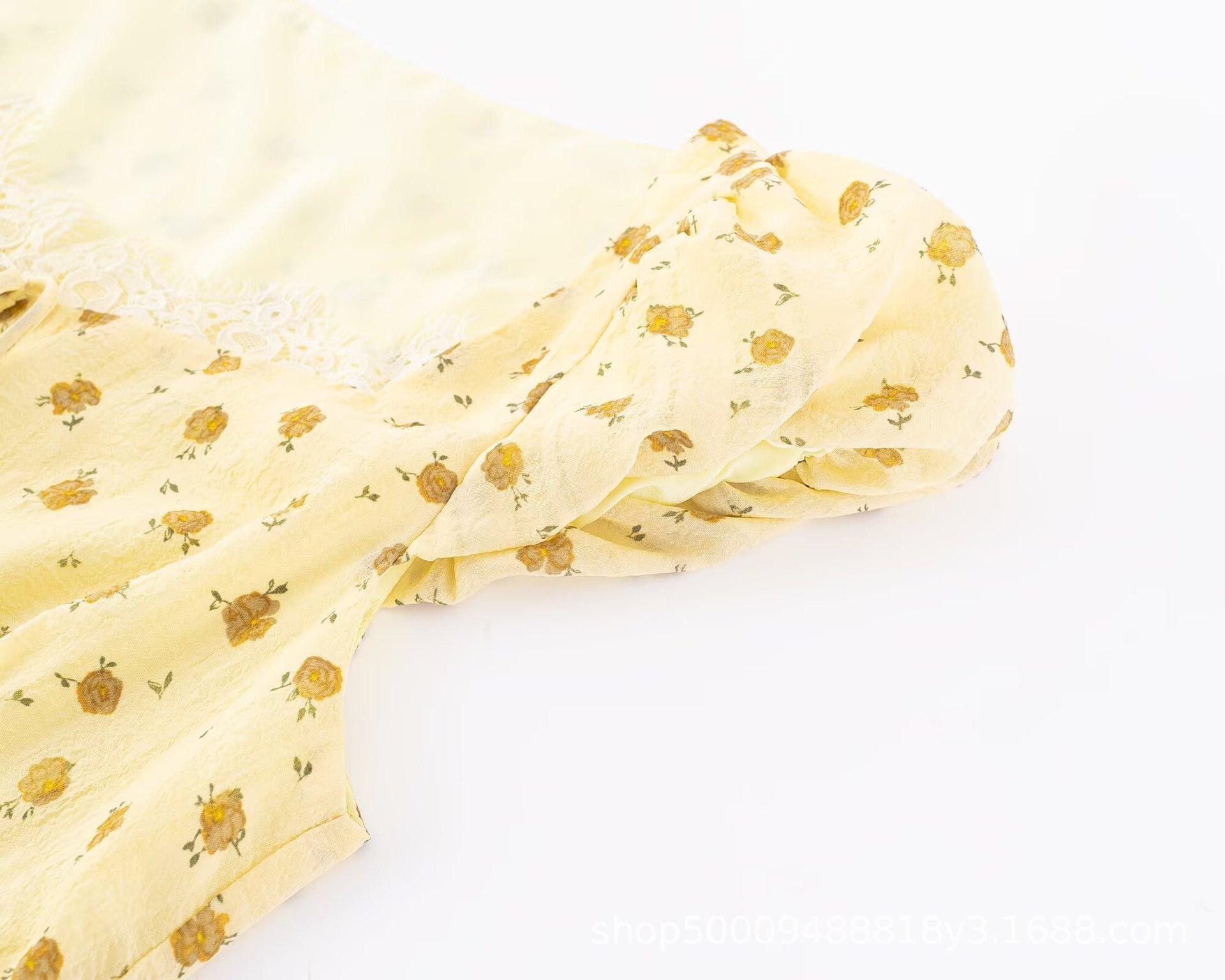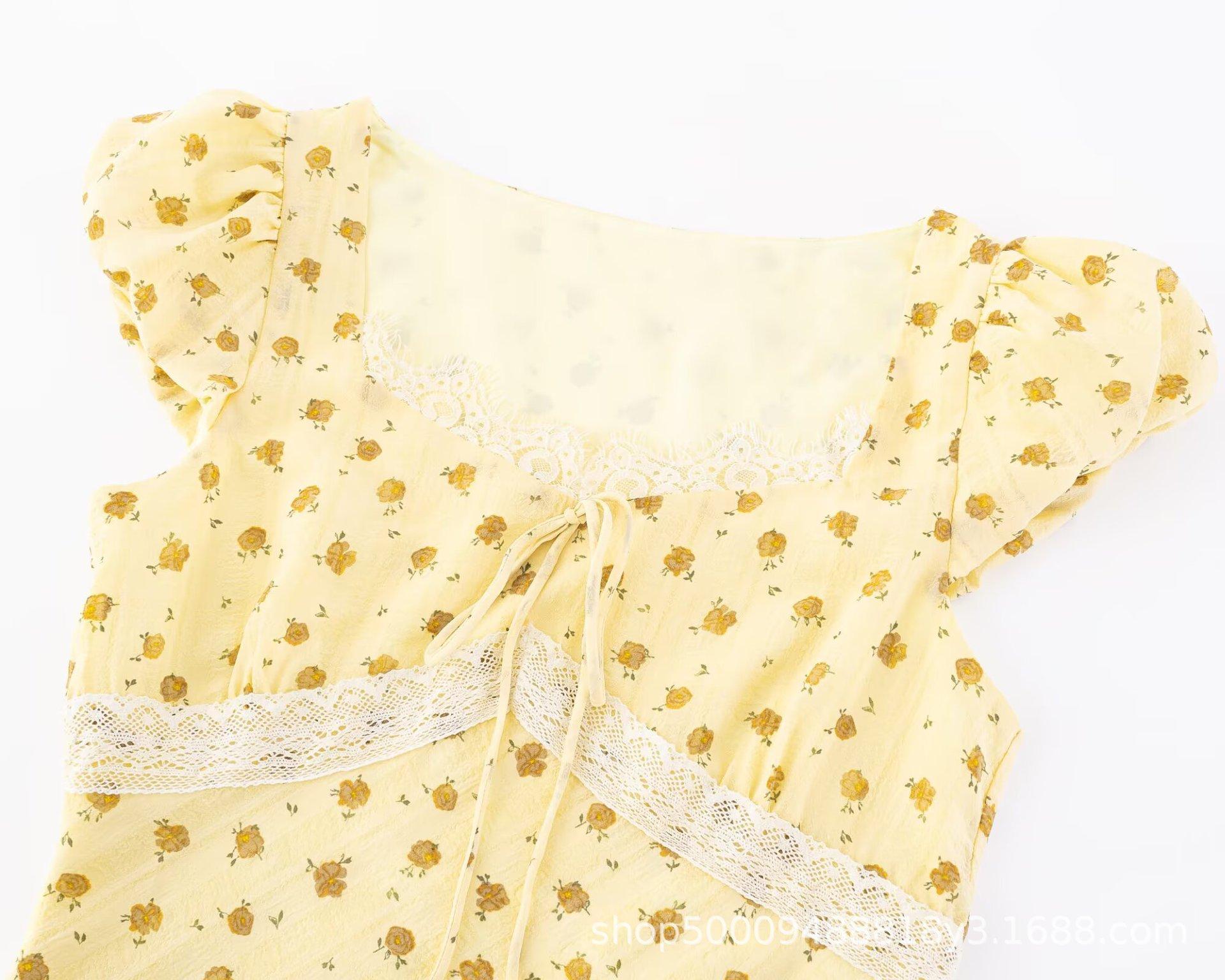 Vestido Floral de Manga Corta con Cuello Cuadrado Suave de Estilo Francés, Encaje de Patchwork, Lazo, Cintura Ceñida y Corte Slim para Vacaciones