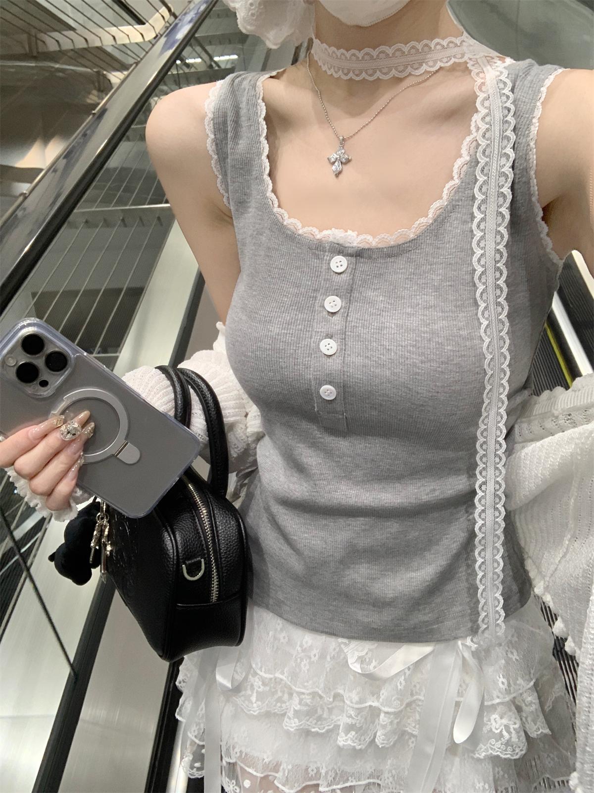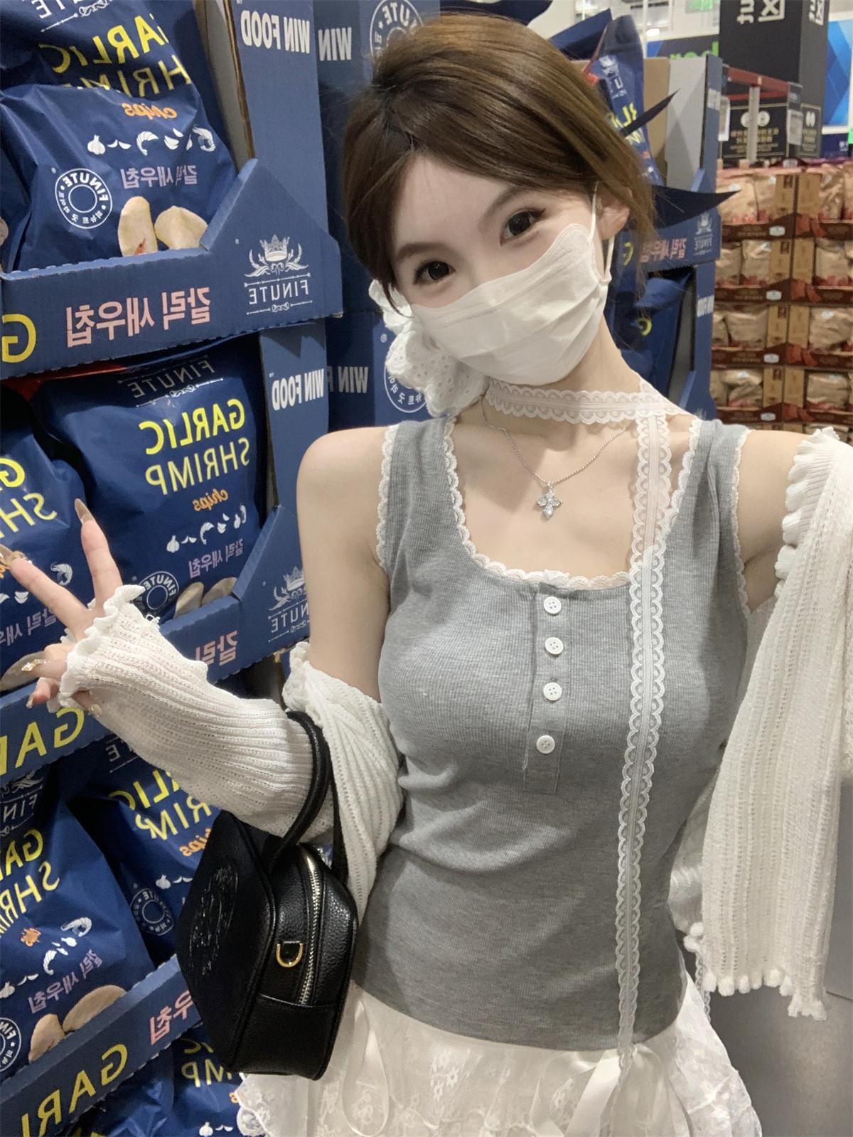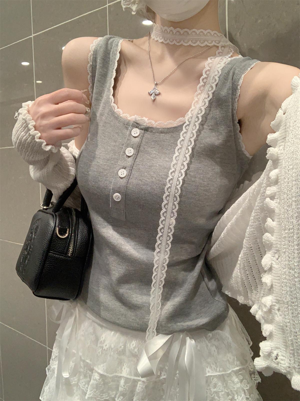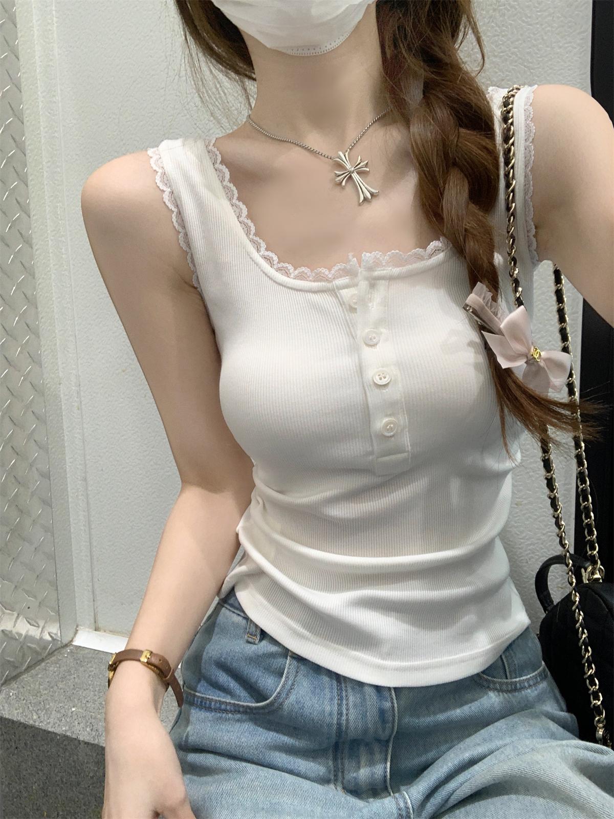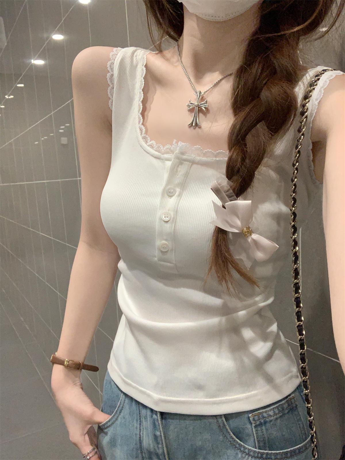 Chaleco de Encaje con Botones de Cuello Cuadrado para Mujer Primavera y Verano 2025 Puro Deseo Bm Top Ajustado Interior para Cubrir el Busto y Tirantes