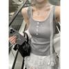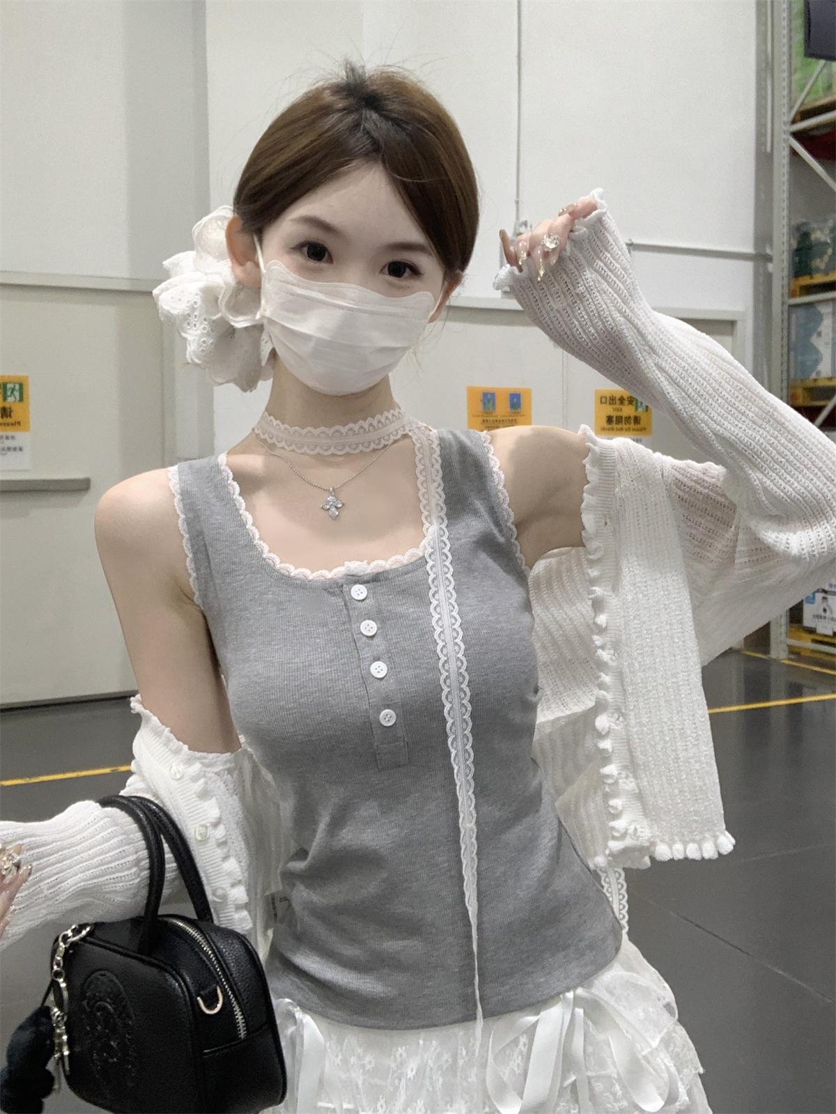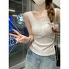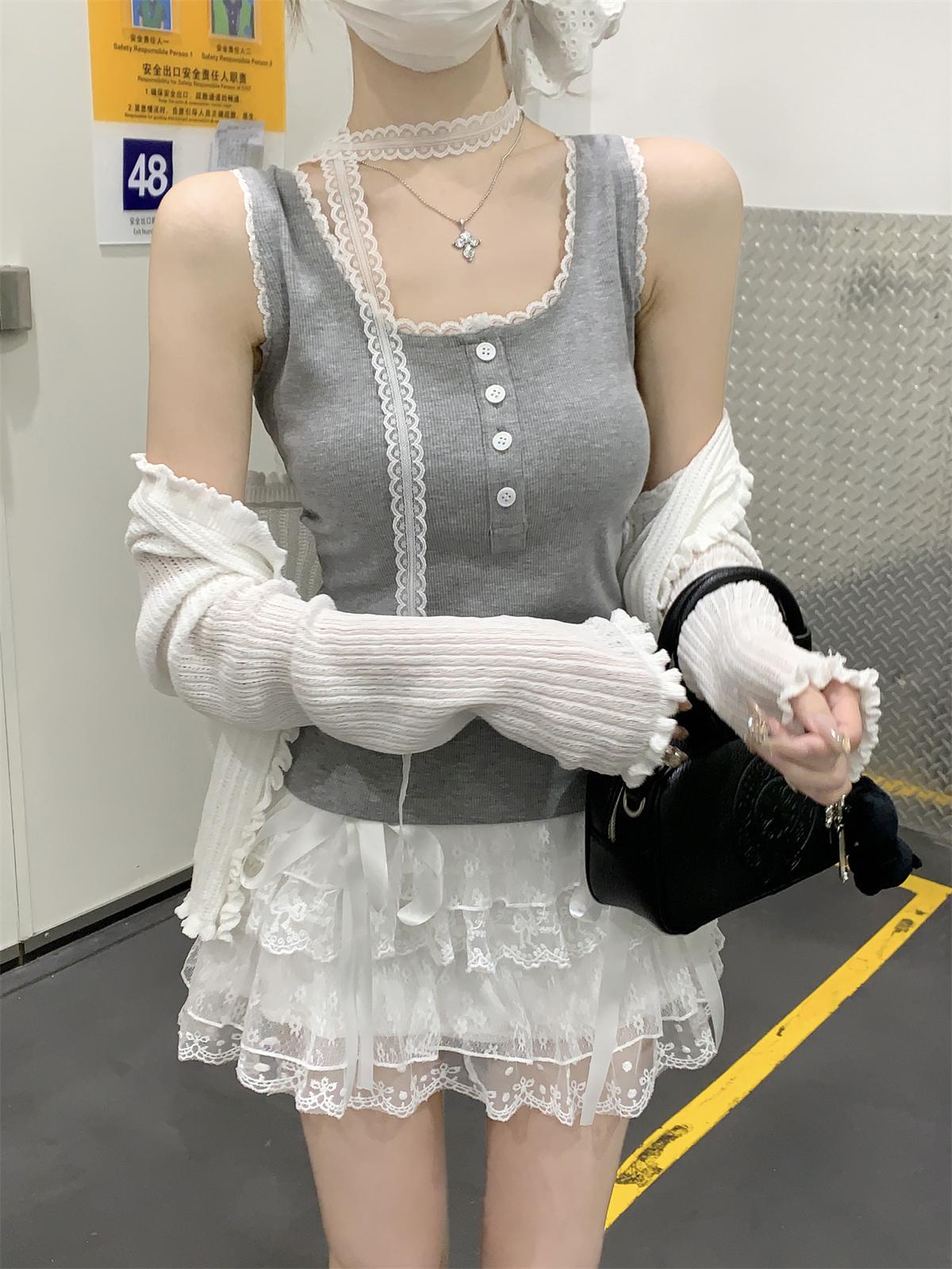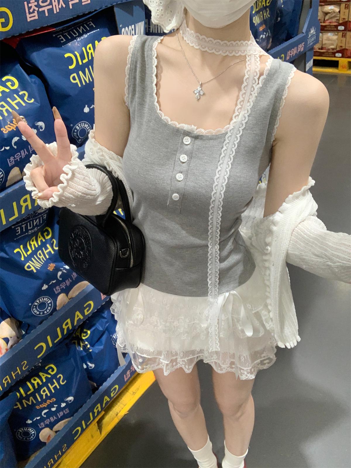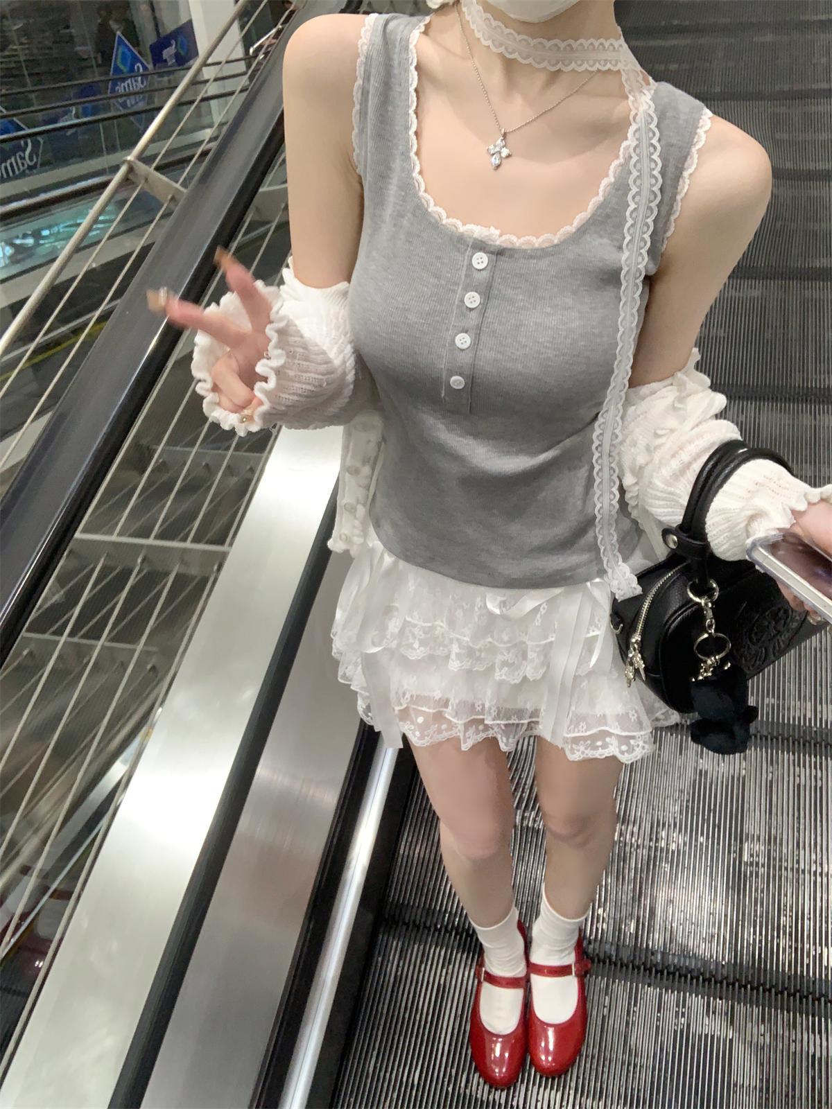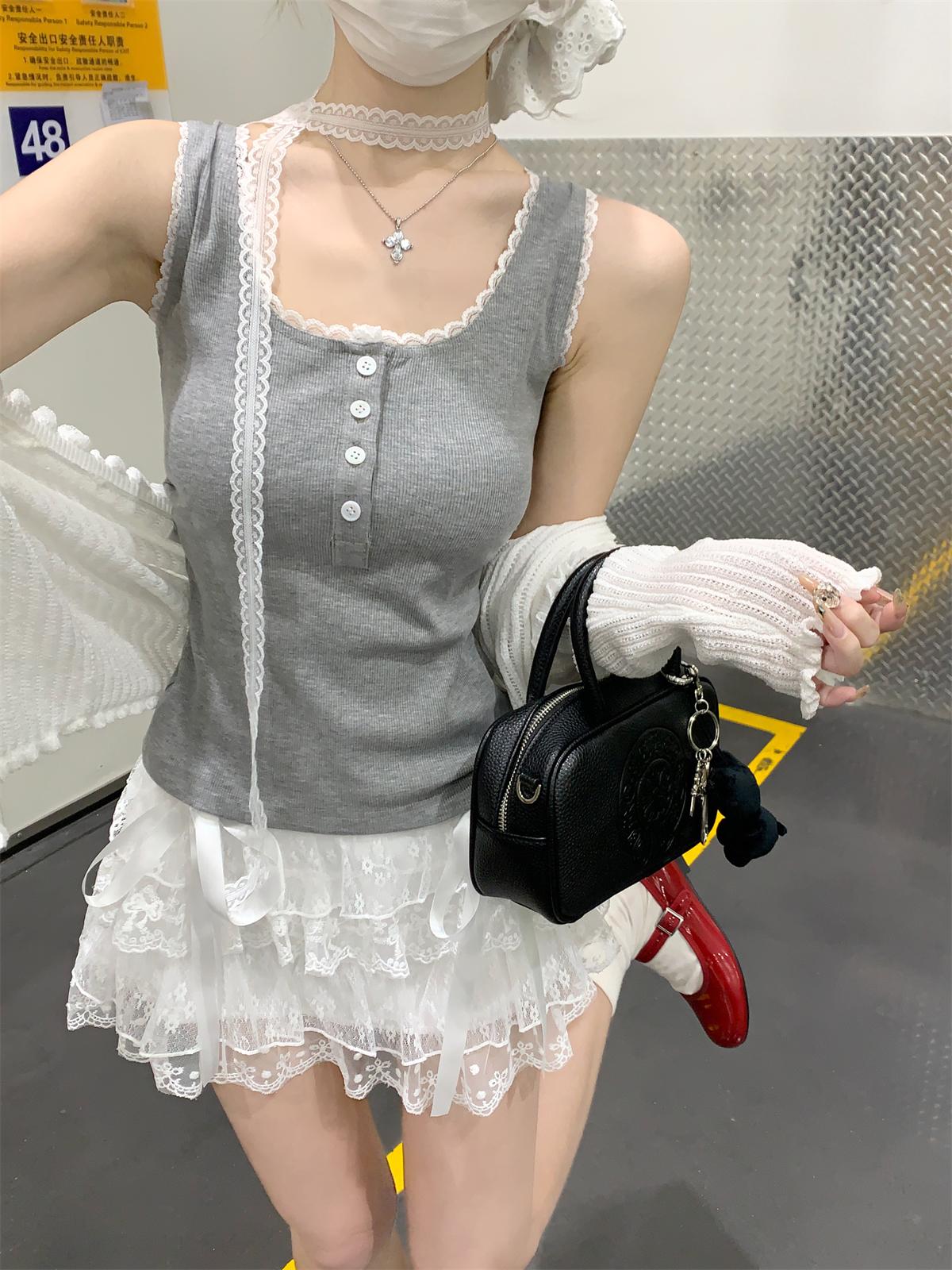 Chaleco de Encaje con Botones de Cuello Cuadrado para Mujer Primavera y Verano 2025 Puro Deseo Bm Top Ajustado Interior para Cubrir el Busto y Tirantes