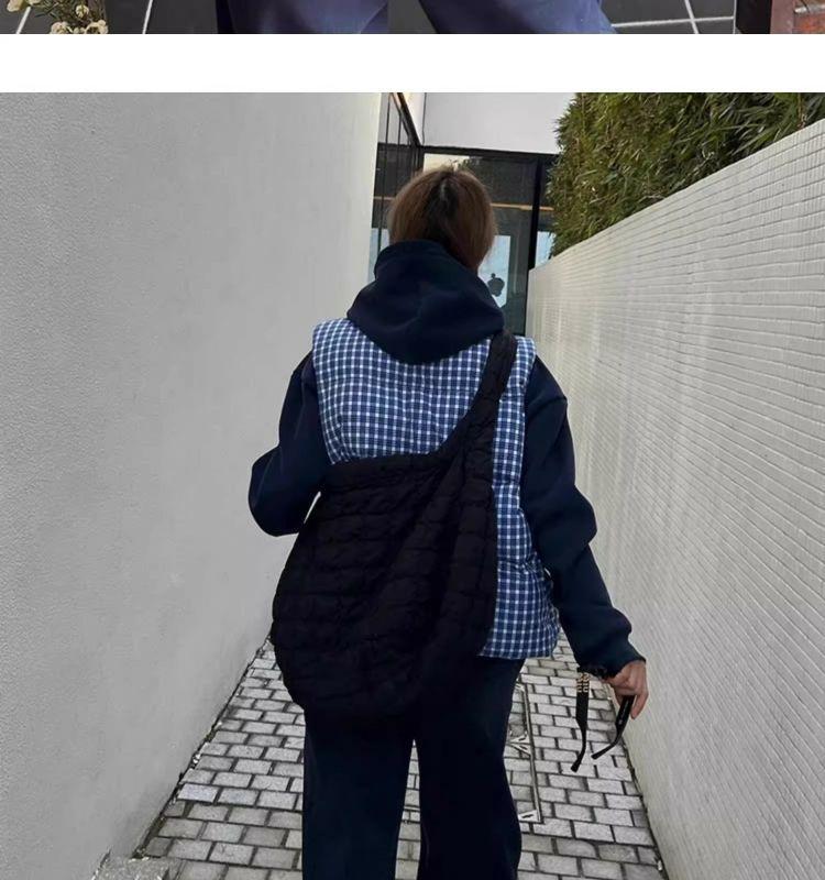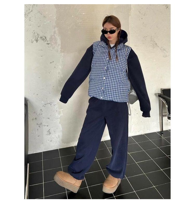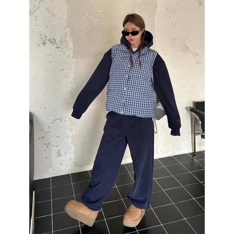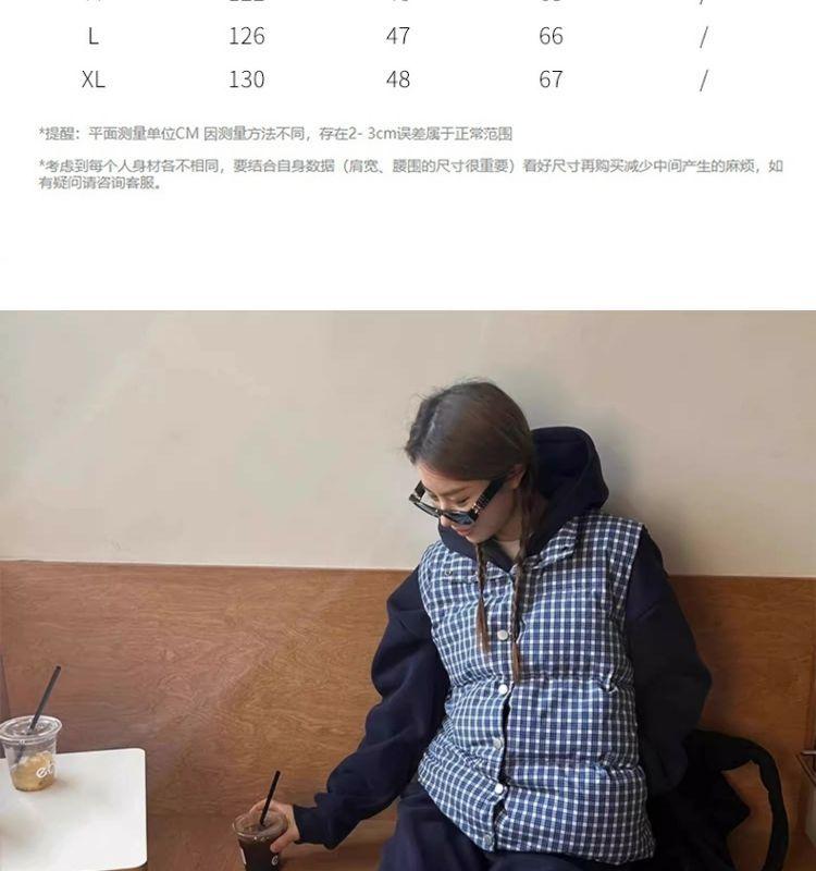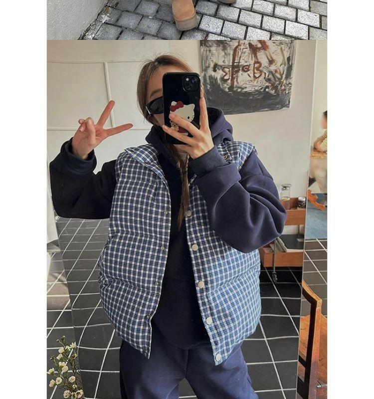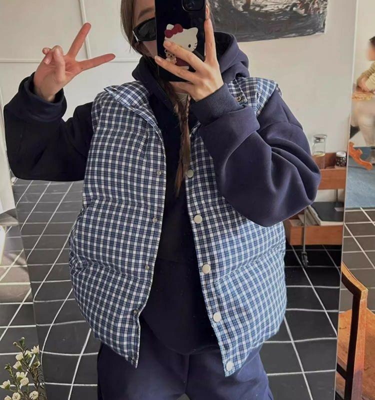 Chaleco de Mujer 2025 Otoño/Invierno Estilo Coreano Cuadros Azules Cuello Alto Casual Versátil Sin Mangas Algodón Acolchado Conjunto de Chaleco