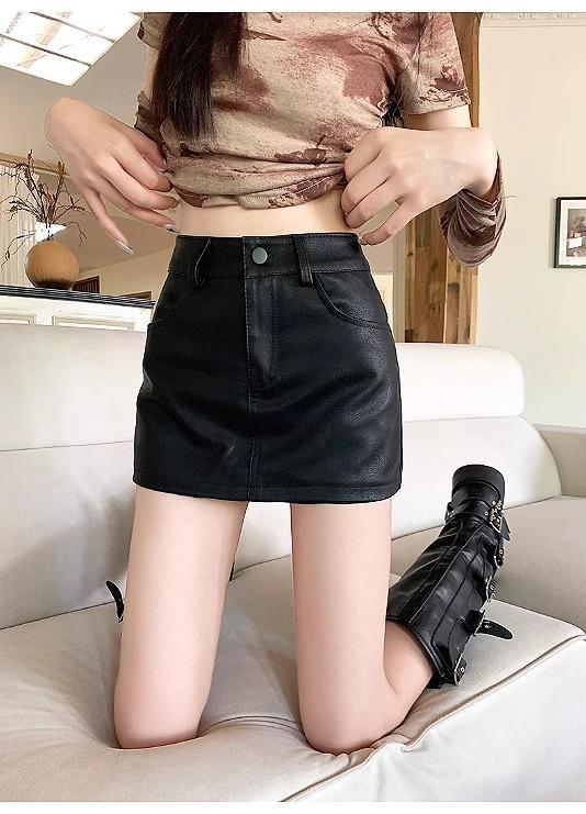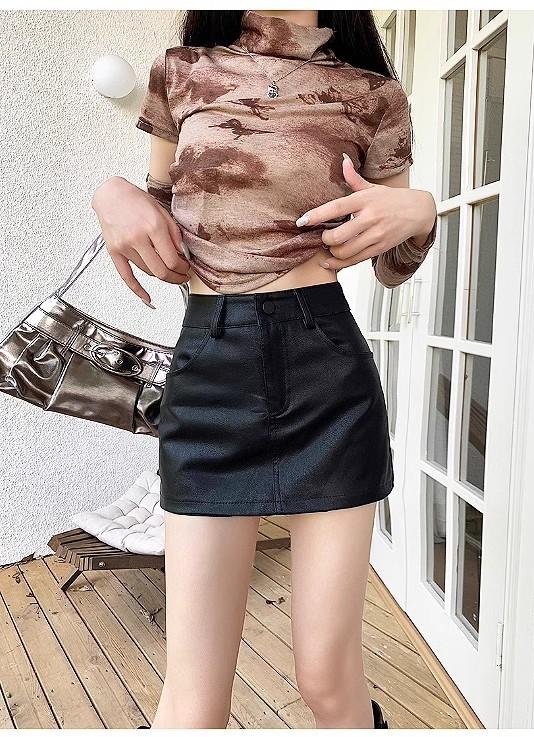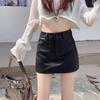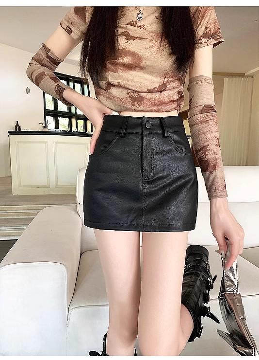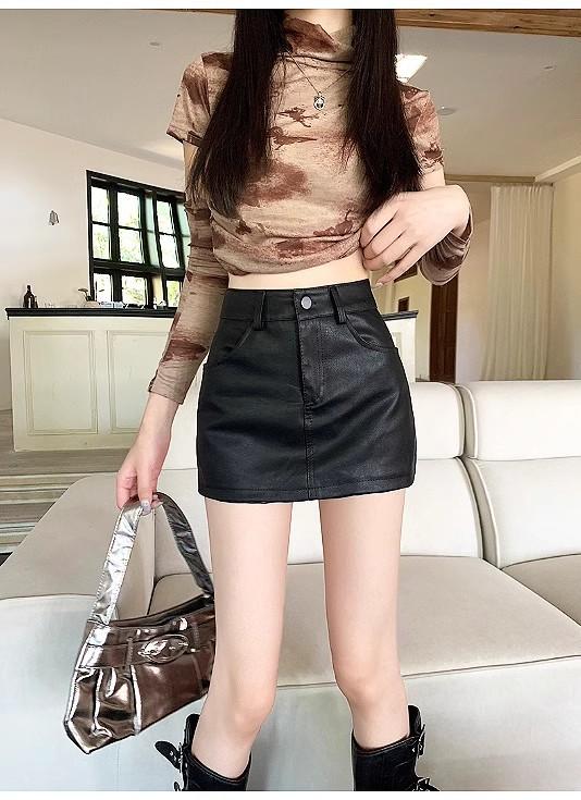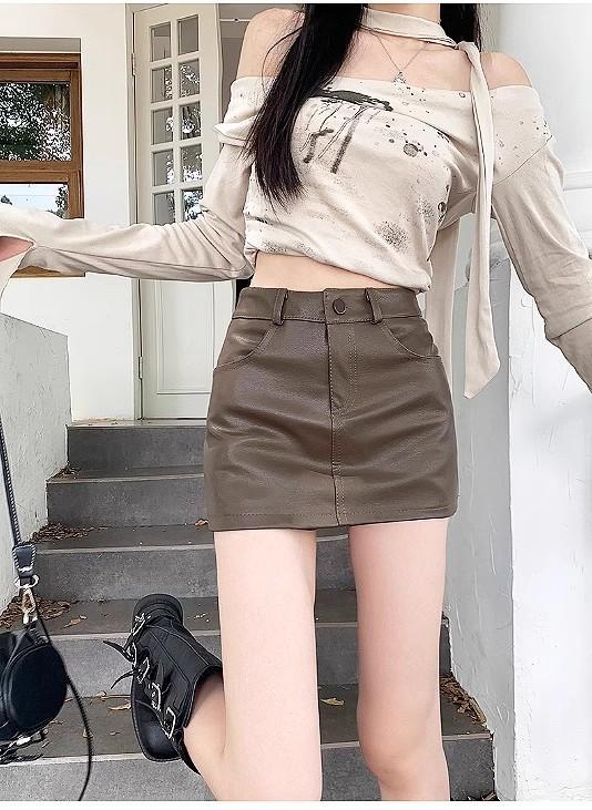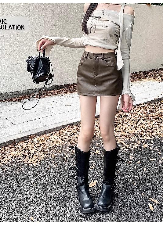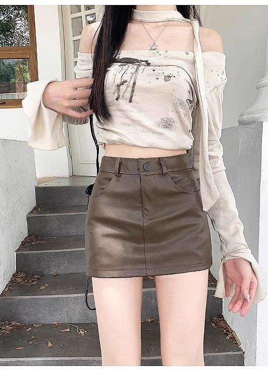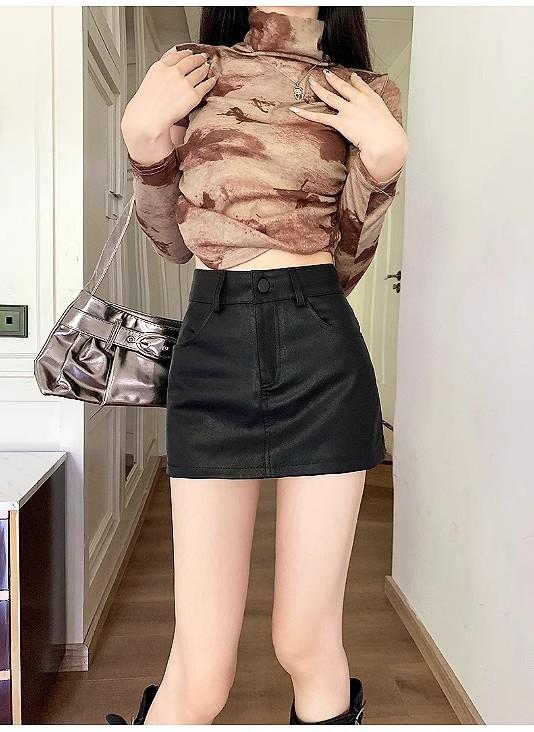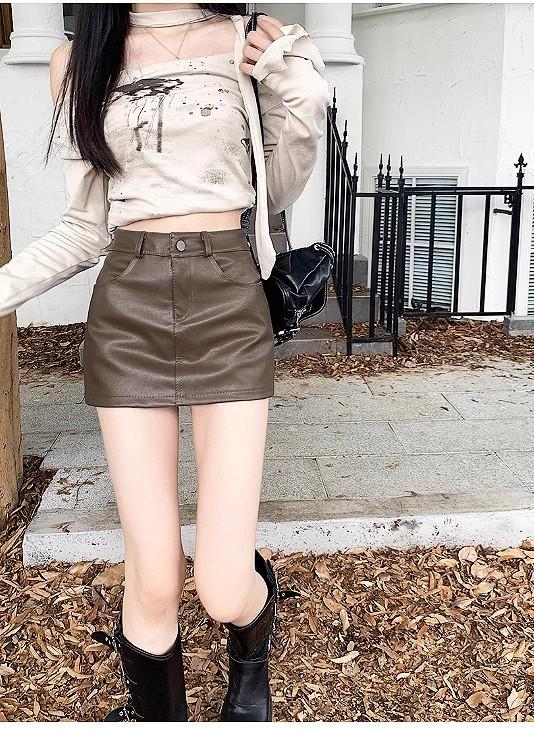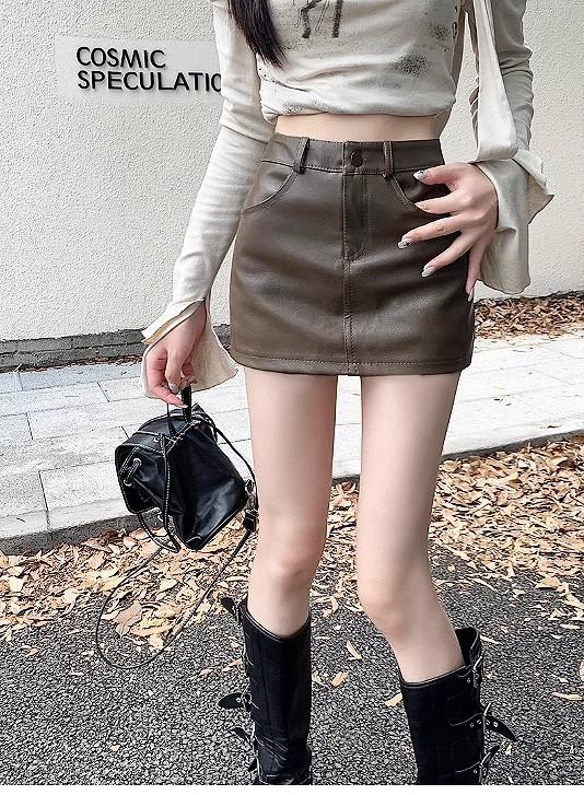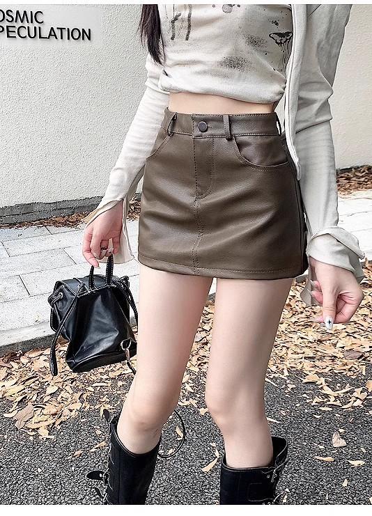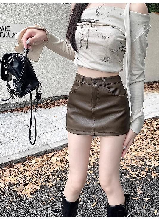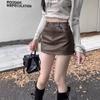 Falda midi de PU color café para mujer, petite, falda corta de chica hot, otoño, cintura alta, textura, línea A, falda envolvente de cadera, falda de cuero, pantalones