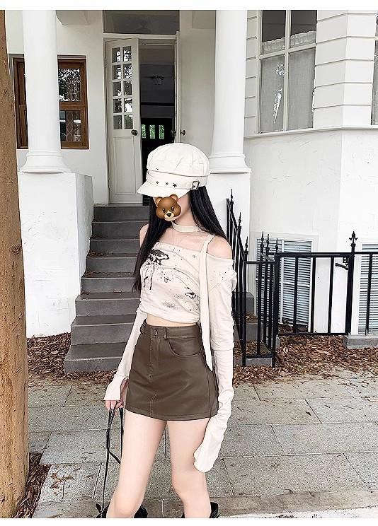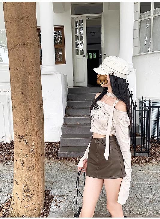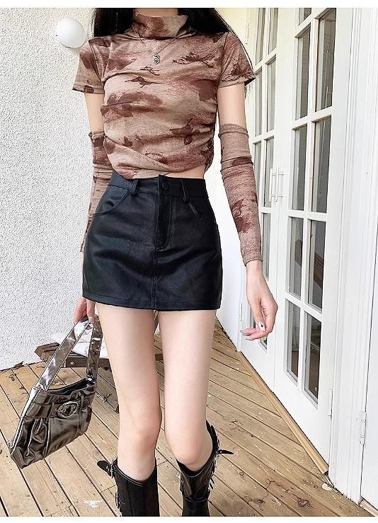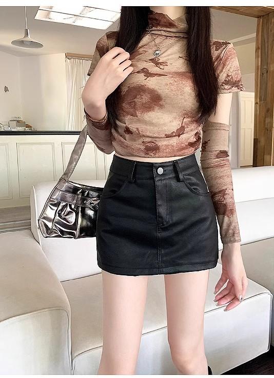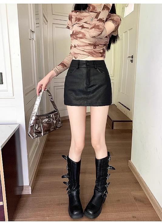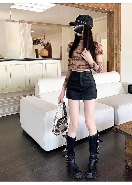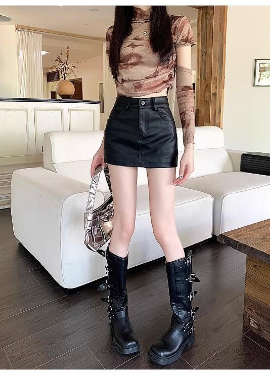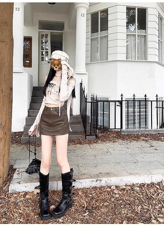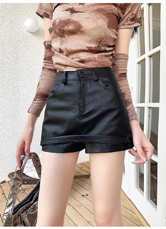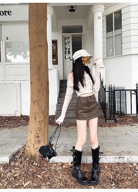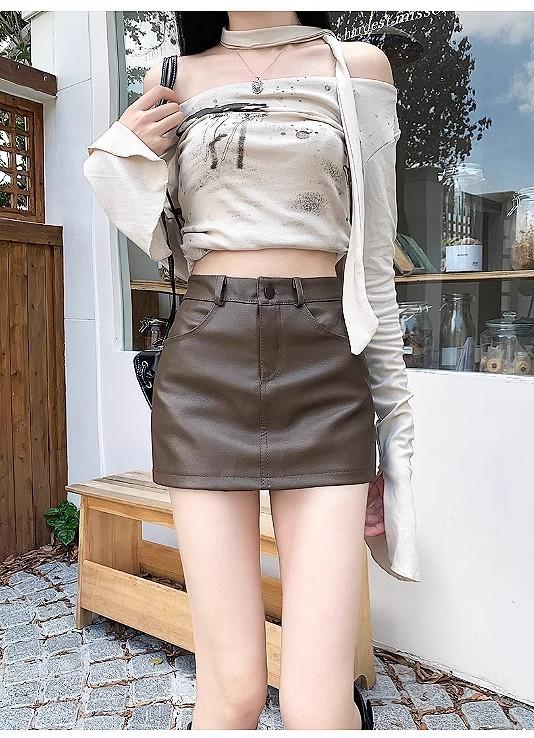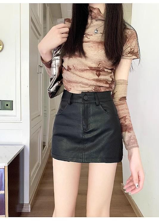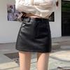 Falda midi de PU color café para mujer, petite, falda corta de chica hot, otoño, cintura alta, textura, línea A, falda envolvente de cadera, falda de cuero, pantalones
