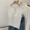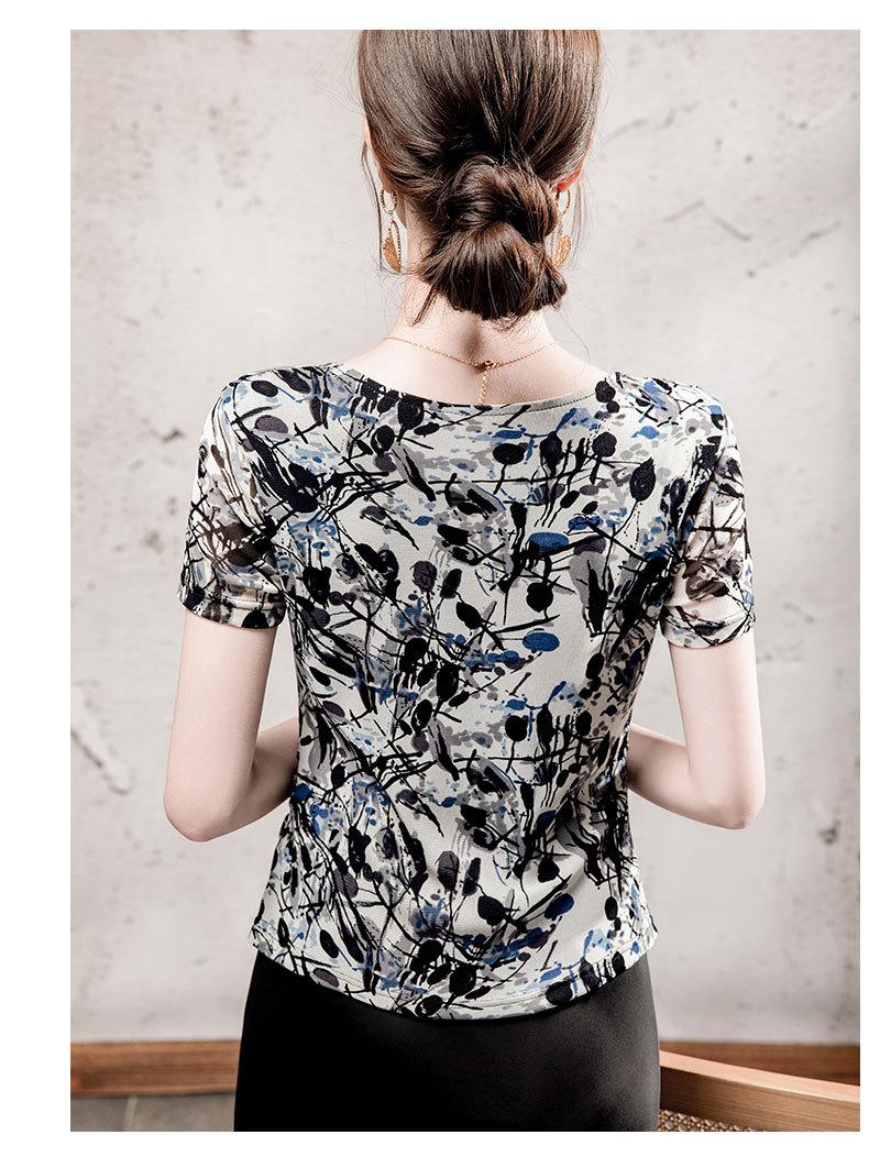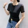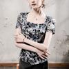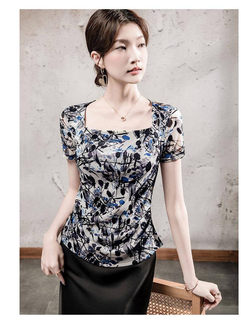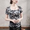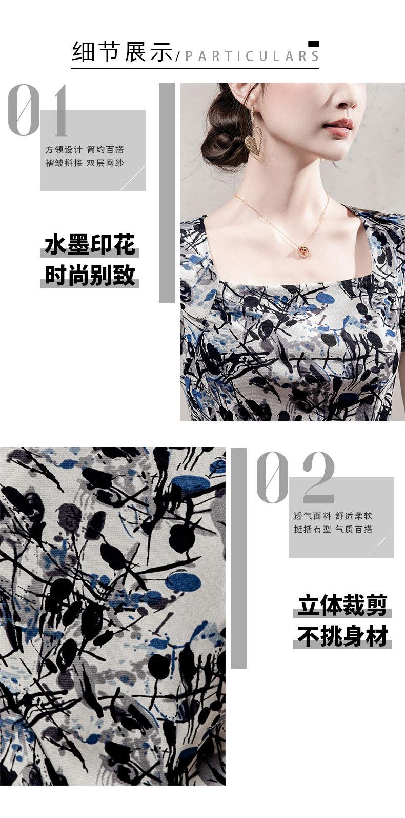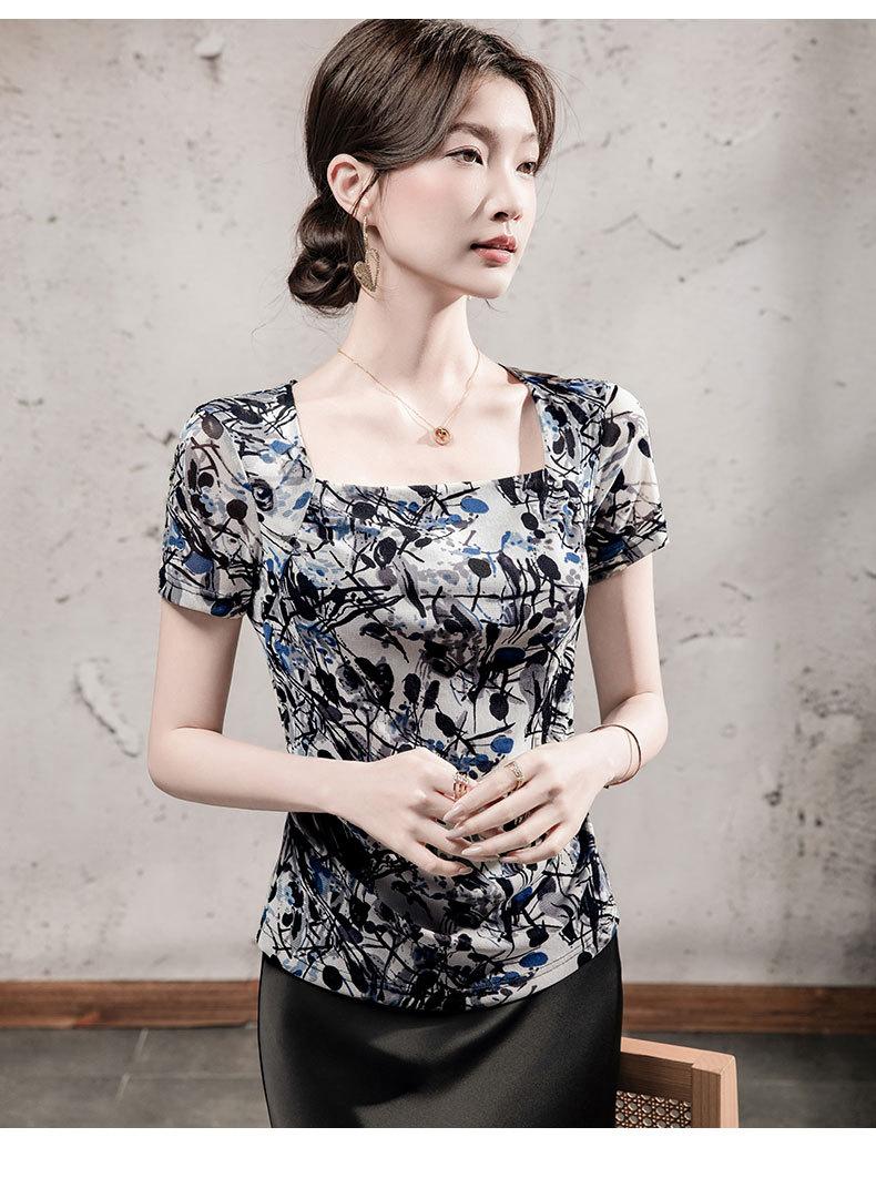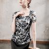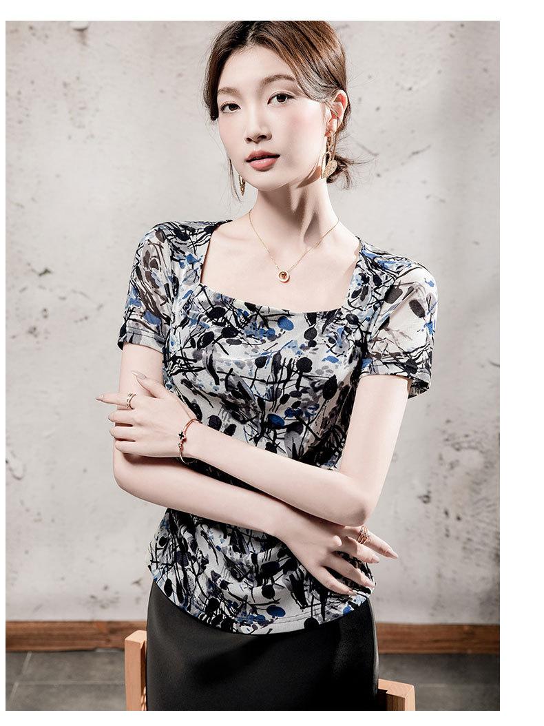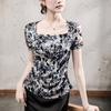 Playera de cuello cuadrado con estampado de tinta para mujer, manga corta, verano 2025, nueva, plisada, ajustada, de malla, para mujer, estilo occidental