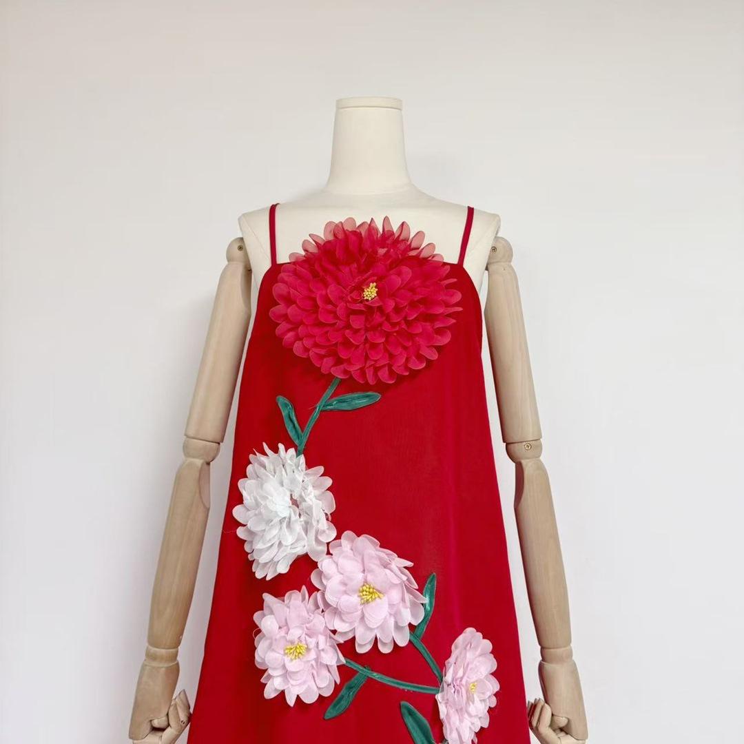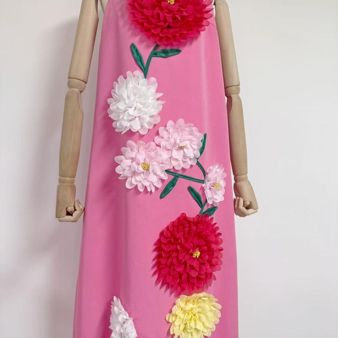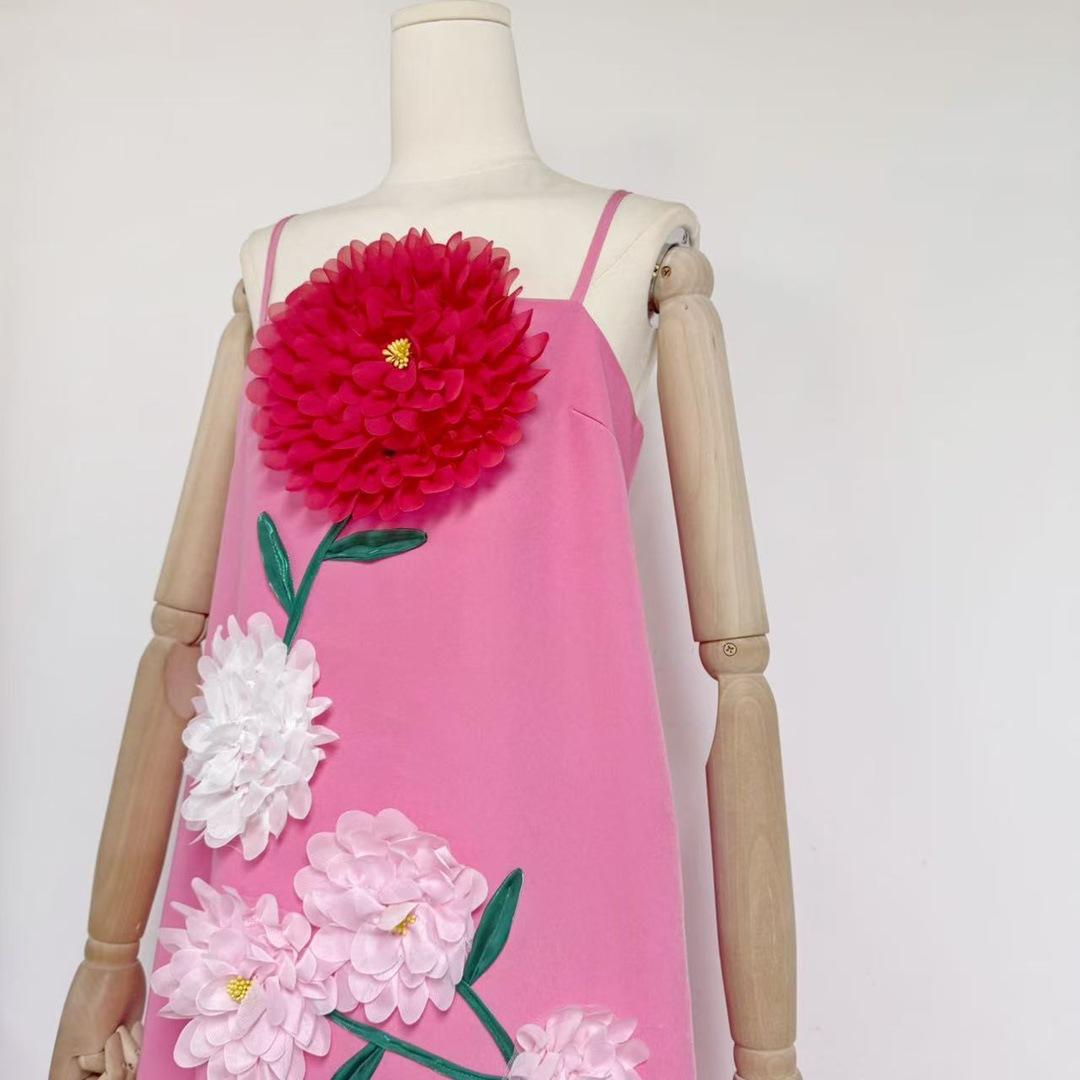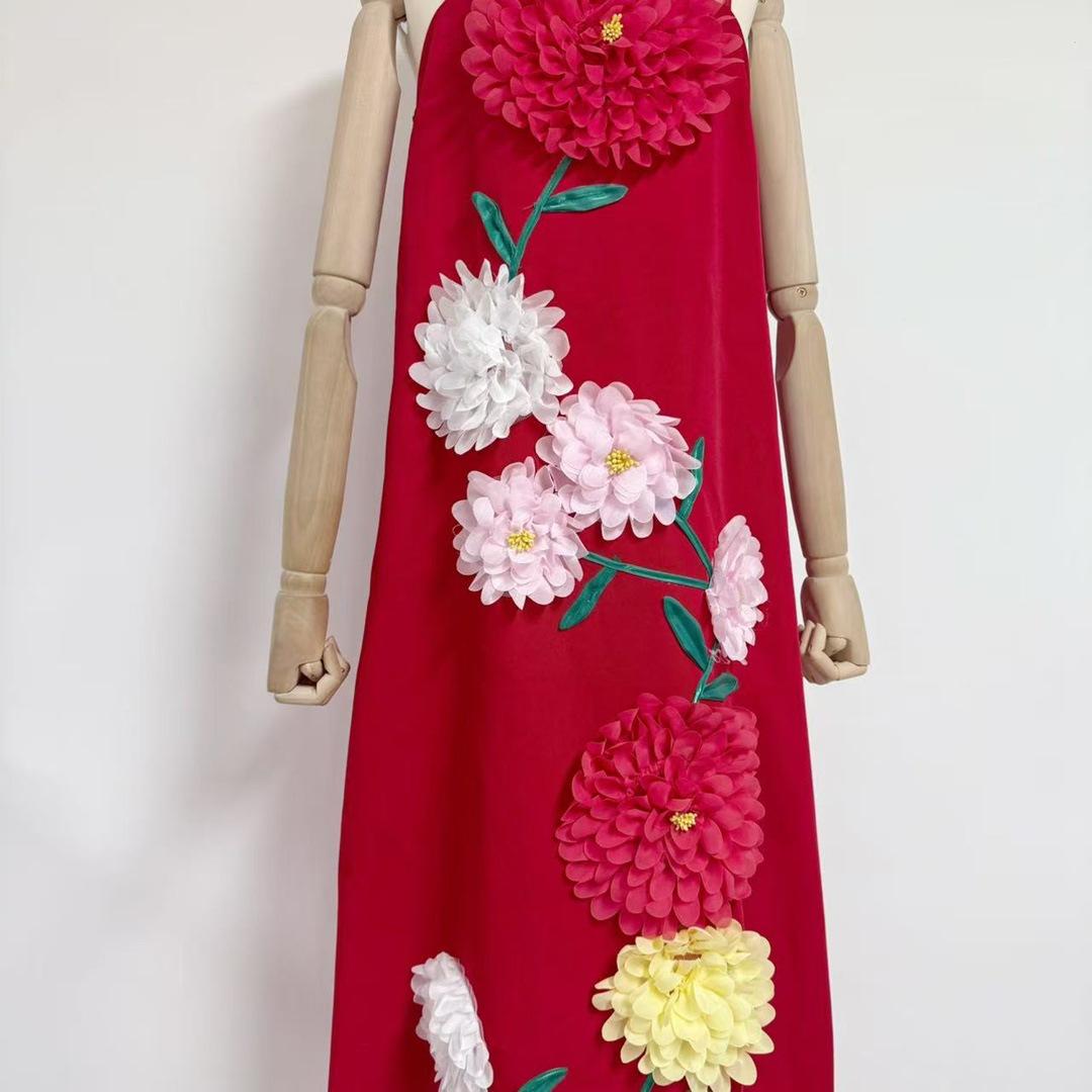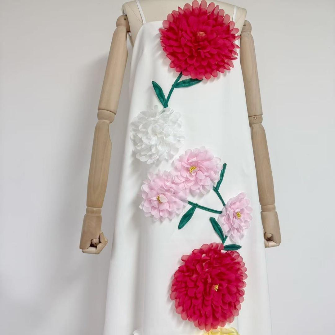 Vintage flor grande costuras decorativas tridimensionales 2025 nuevo color sólido falda de tirantes vestido suelto