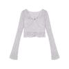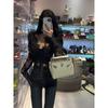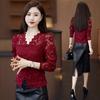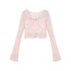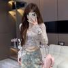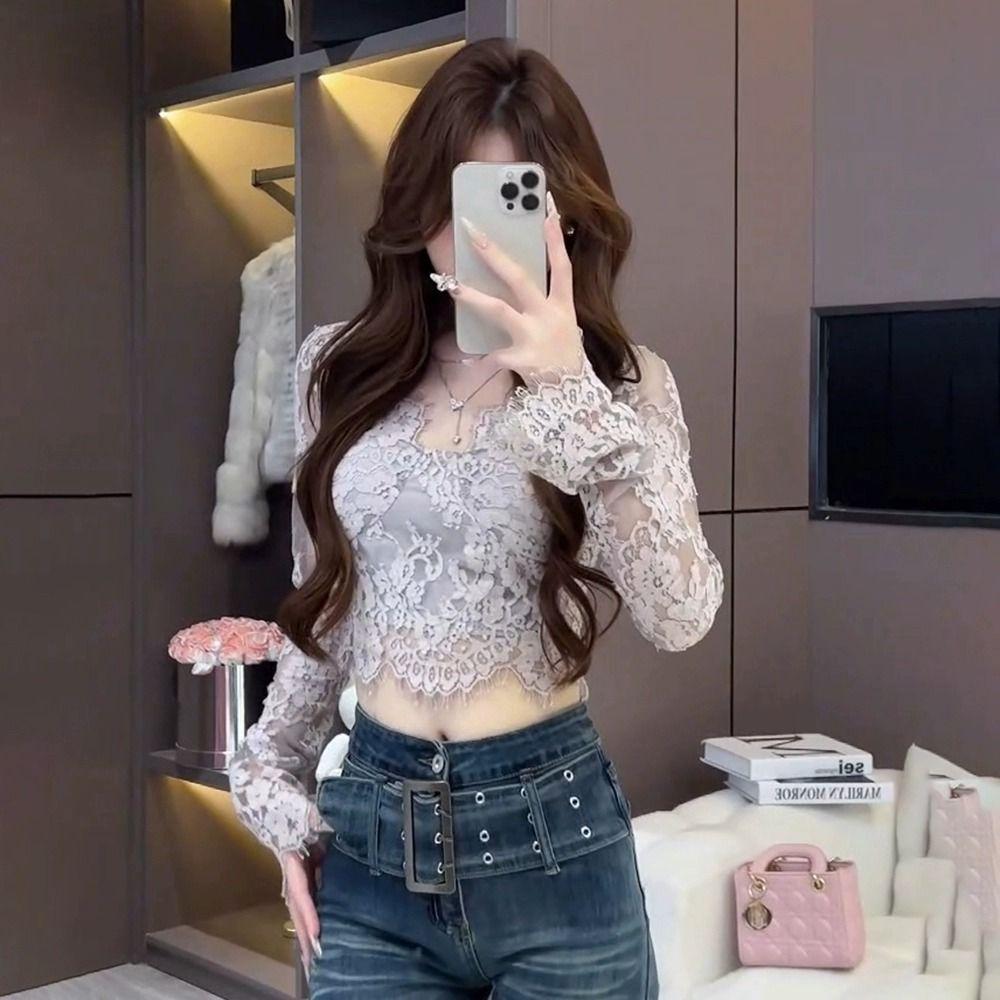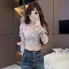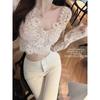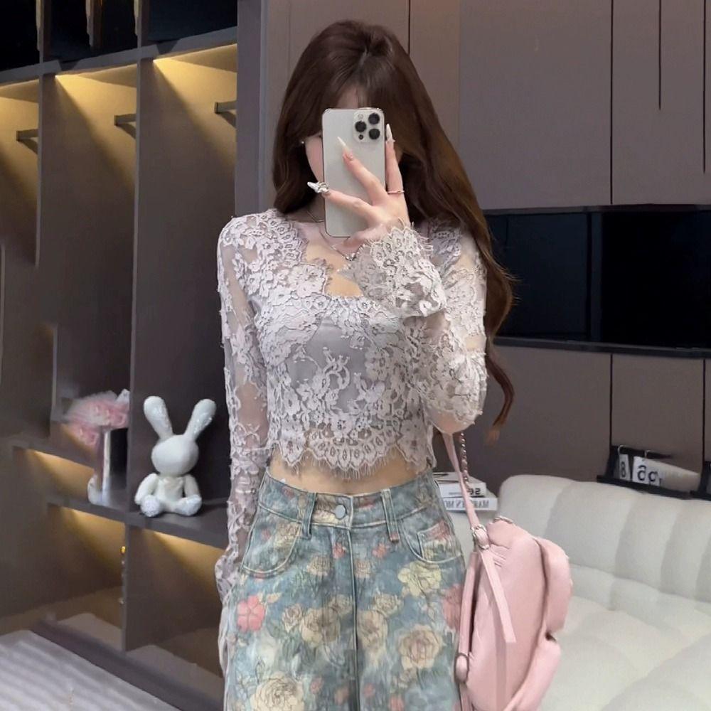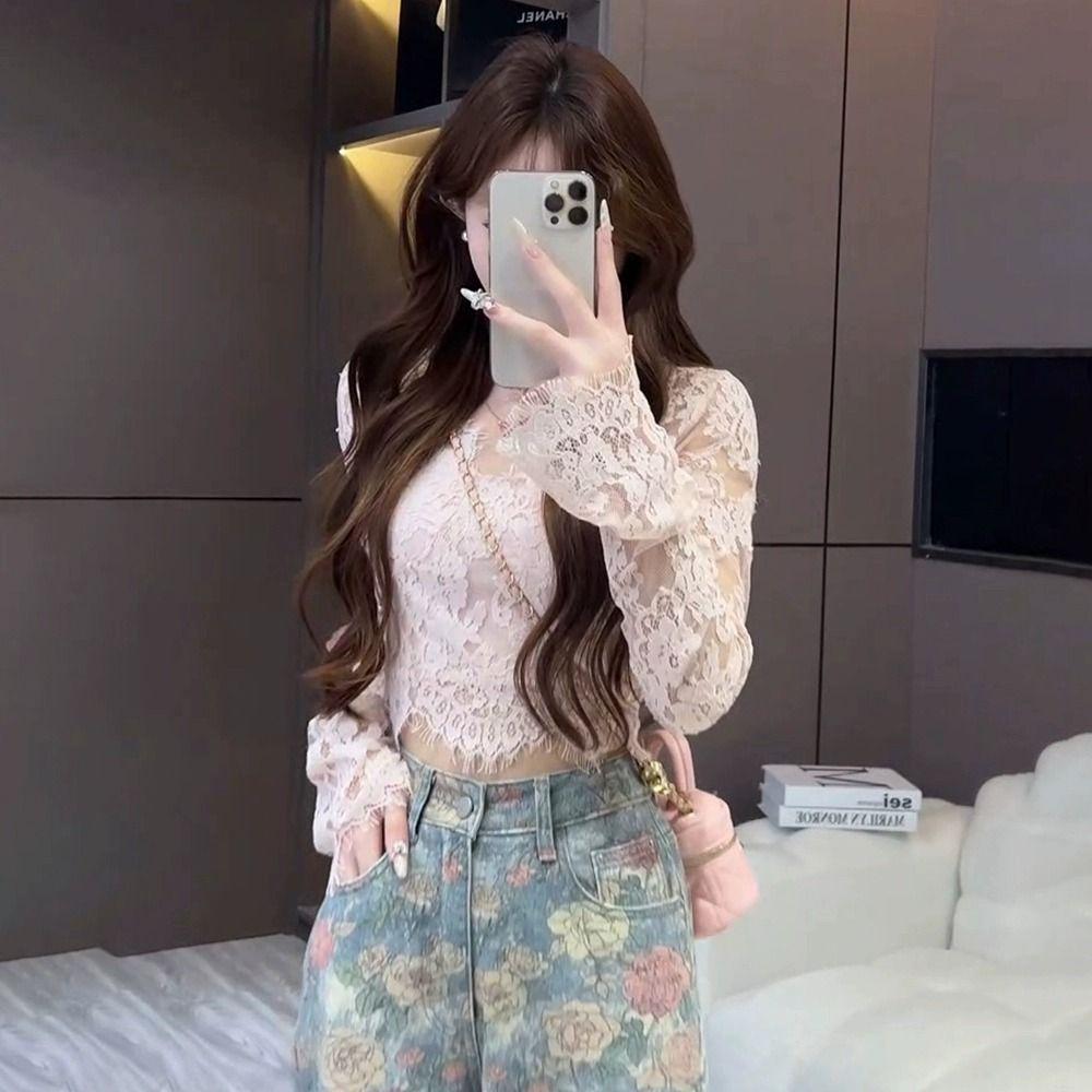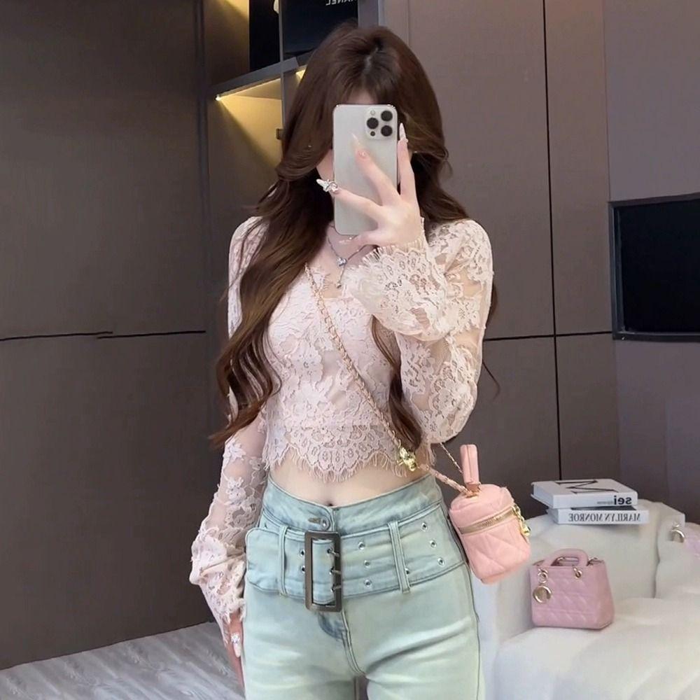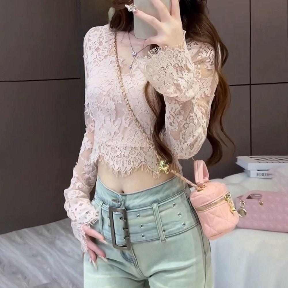 Shanlidaidi Deseo Puro Chica Caliente Cuello en V Camiseta Base de Encaje Mujer Otoño 2024 Nuevo Temperamento Corta Adelgazante