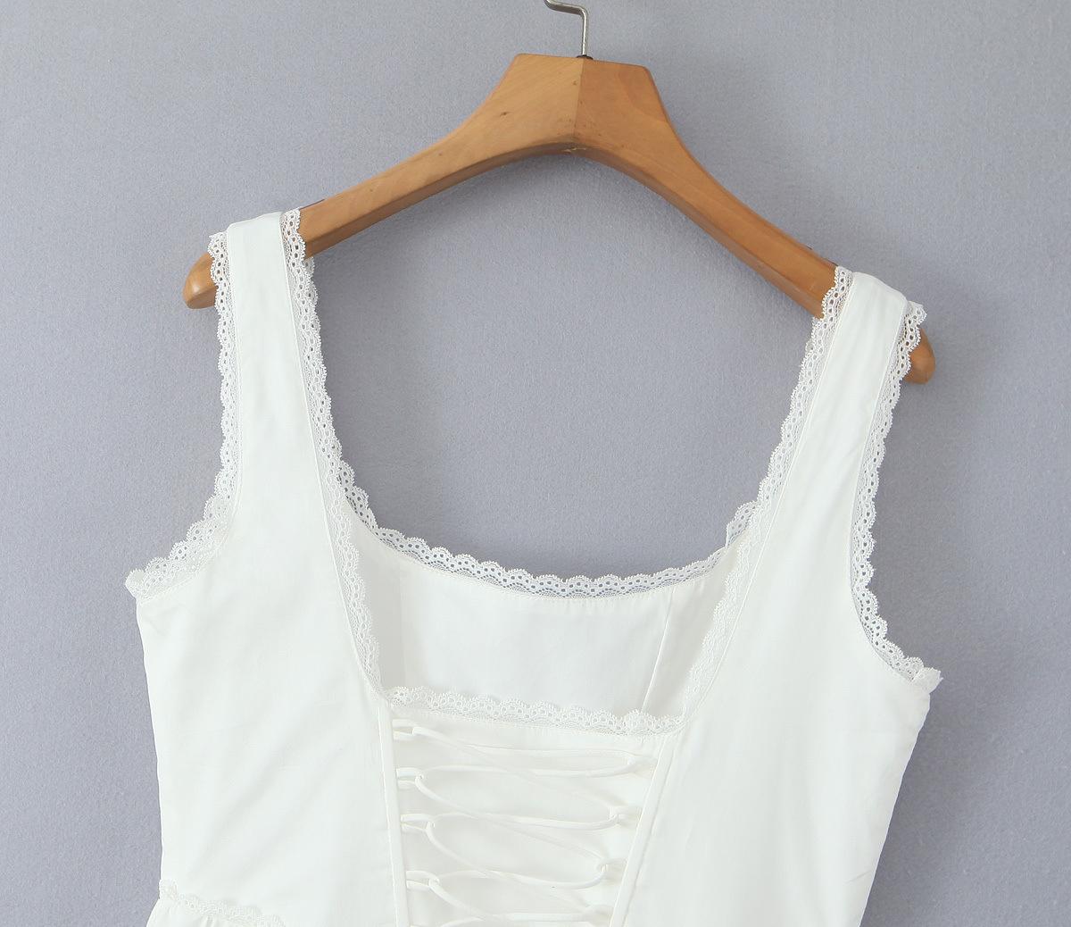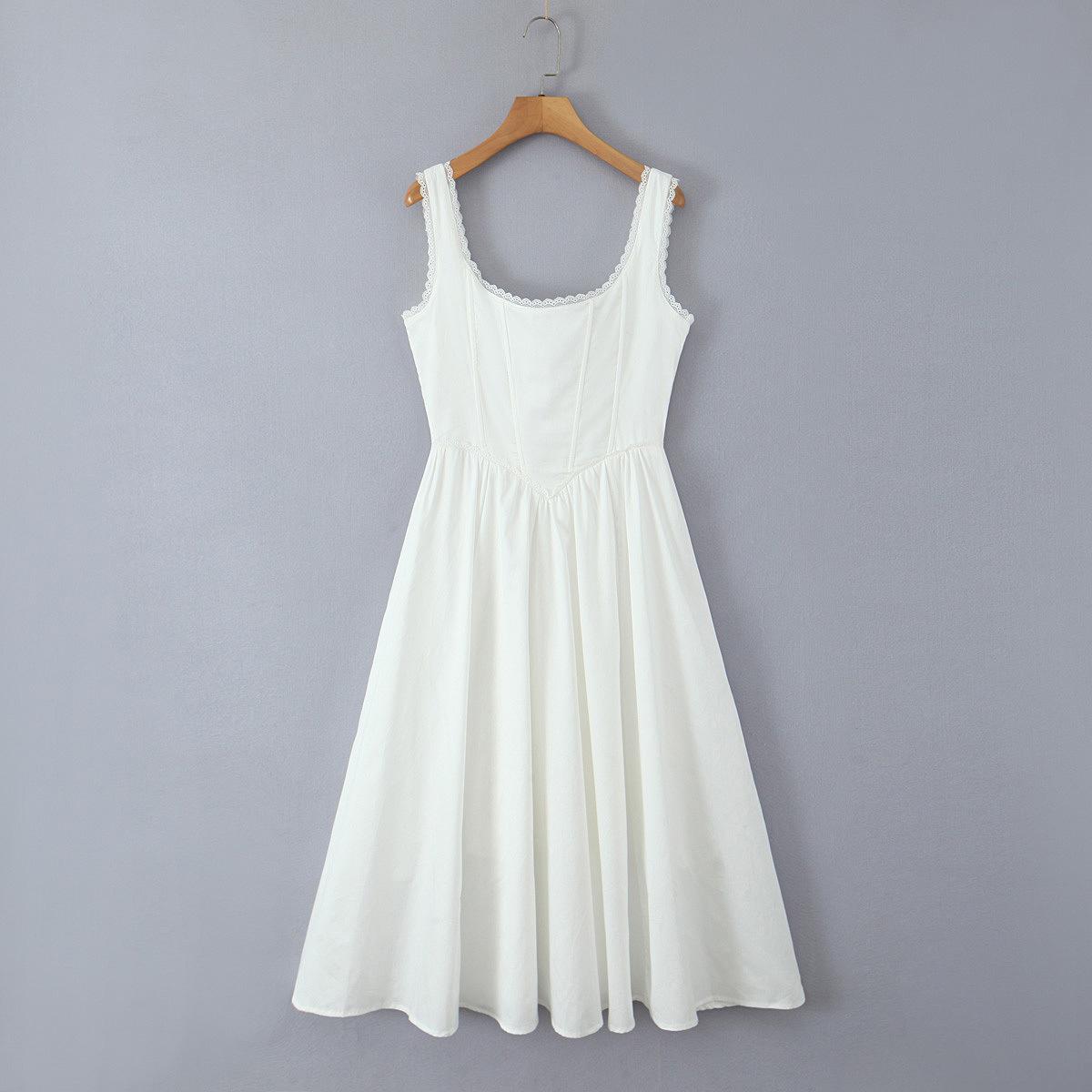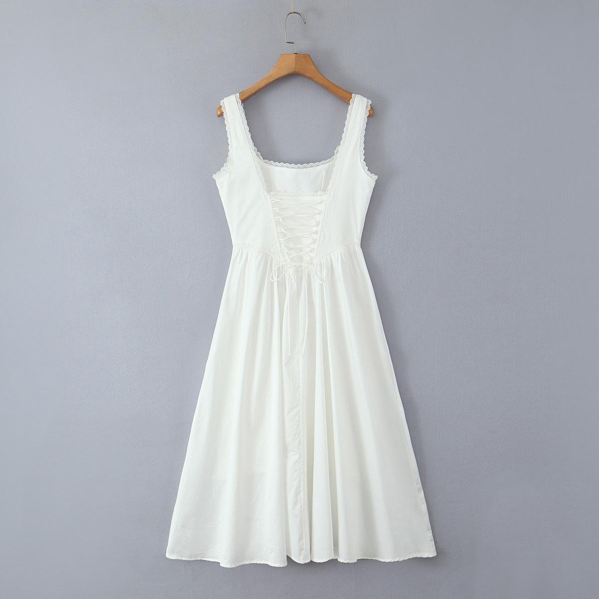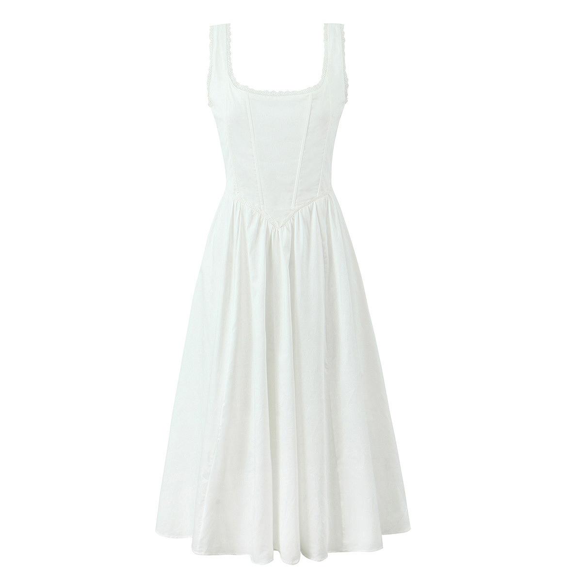 Vestido de Verano para Vacaciones con Cuello de Encaje Romántico Francés para Niña, Tirantes Cruzados en la Espalda, Cintura Adelgazante