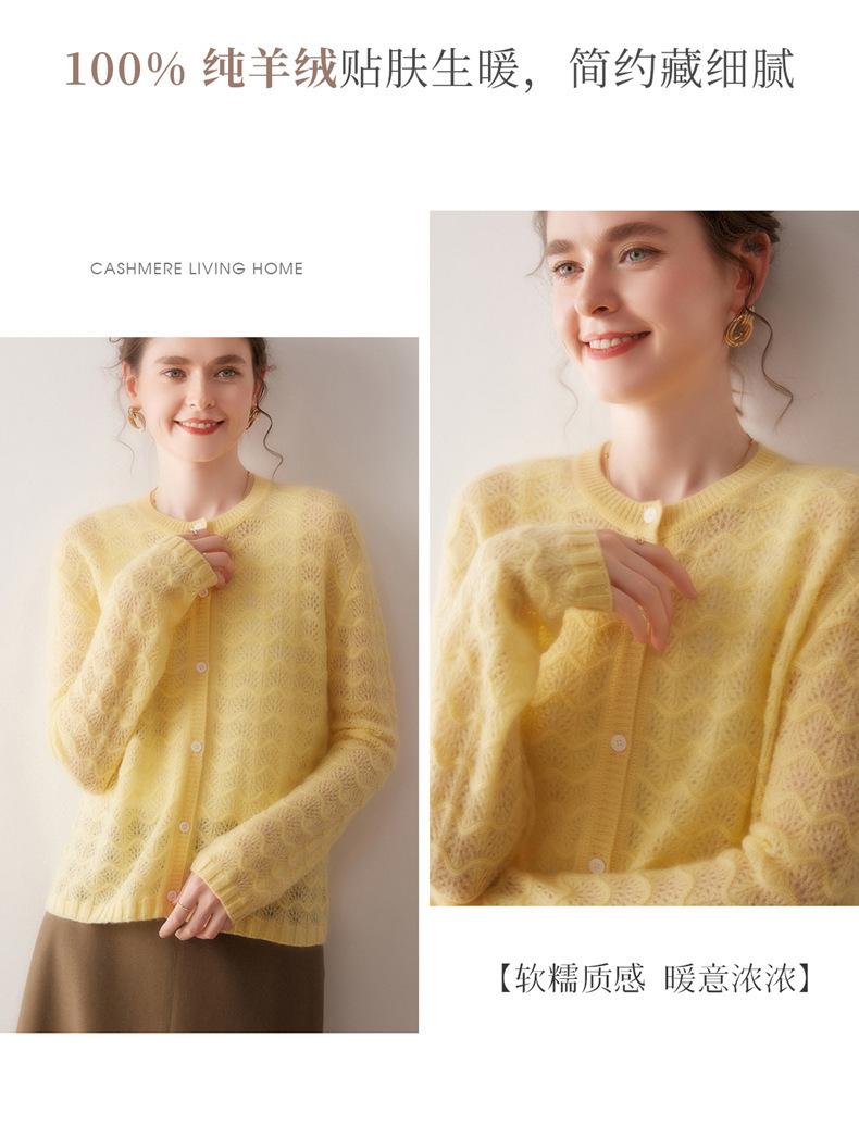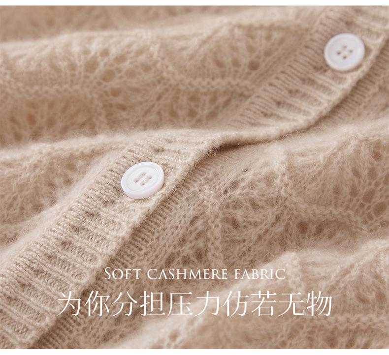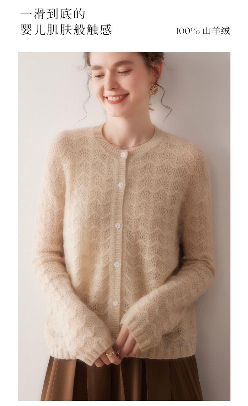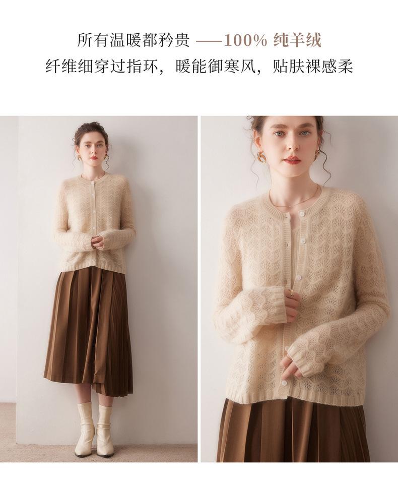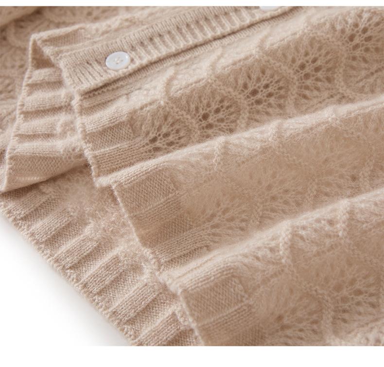 Cárdigan de Cachemira para Mujer 100% Cachemira Pura Otoño e Invierno Nuevo Cuello Redondo Calado Moda Manga Larga Suéter Tejido Abrigo