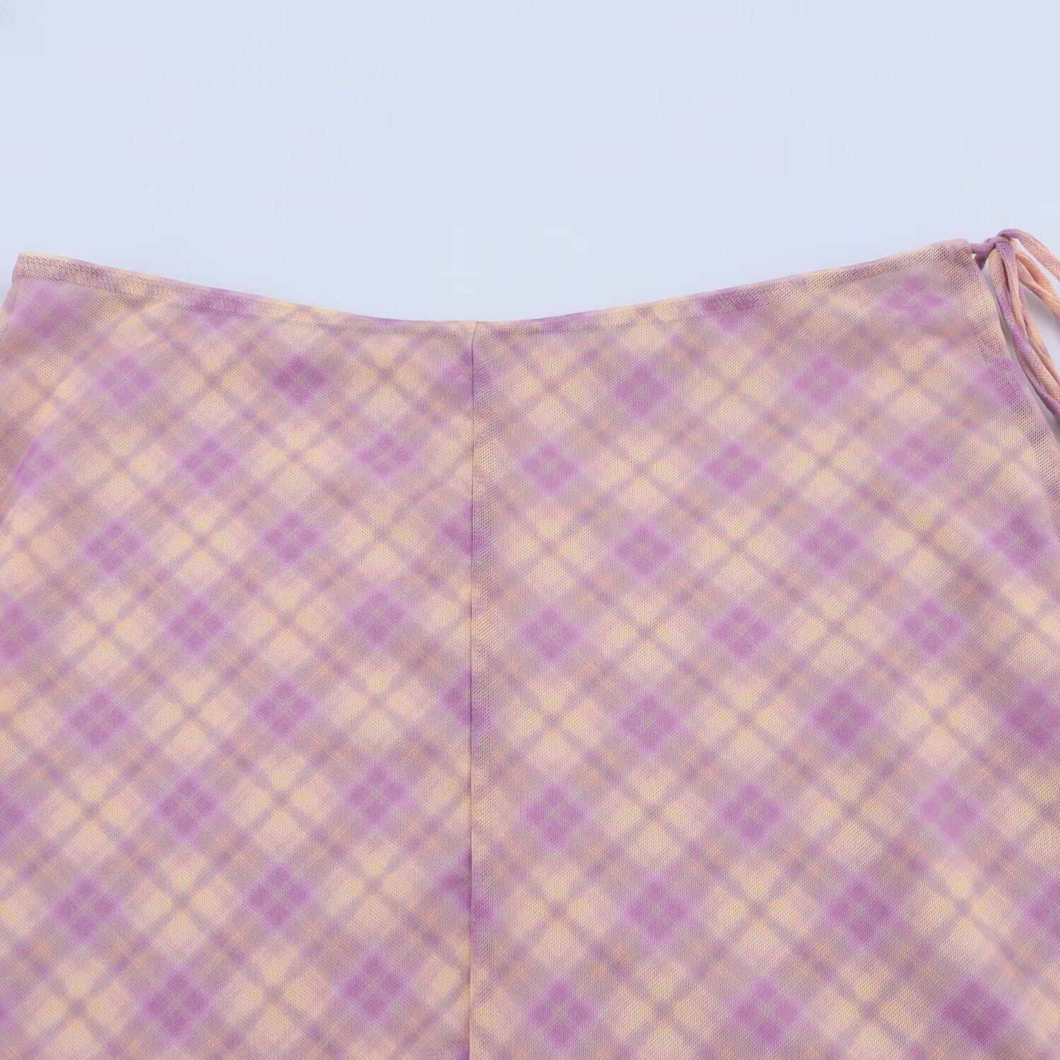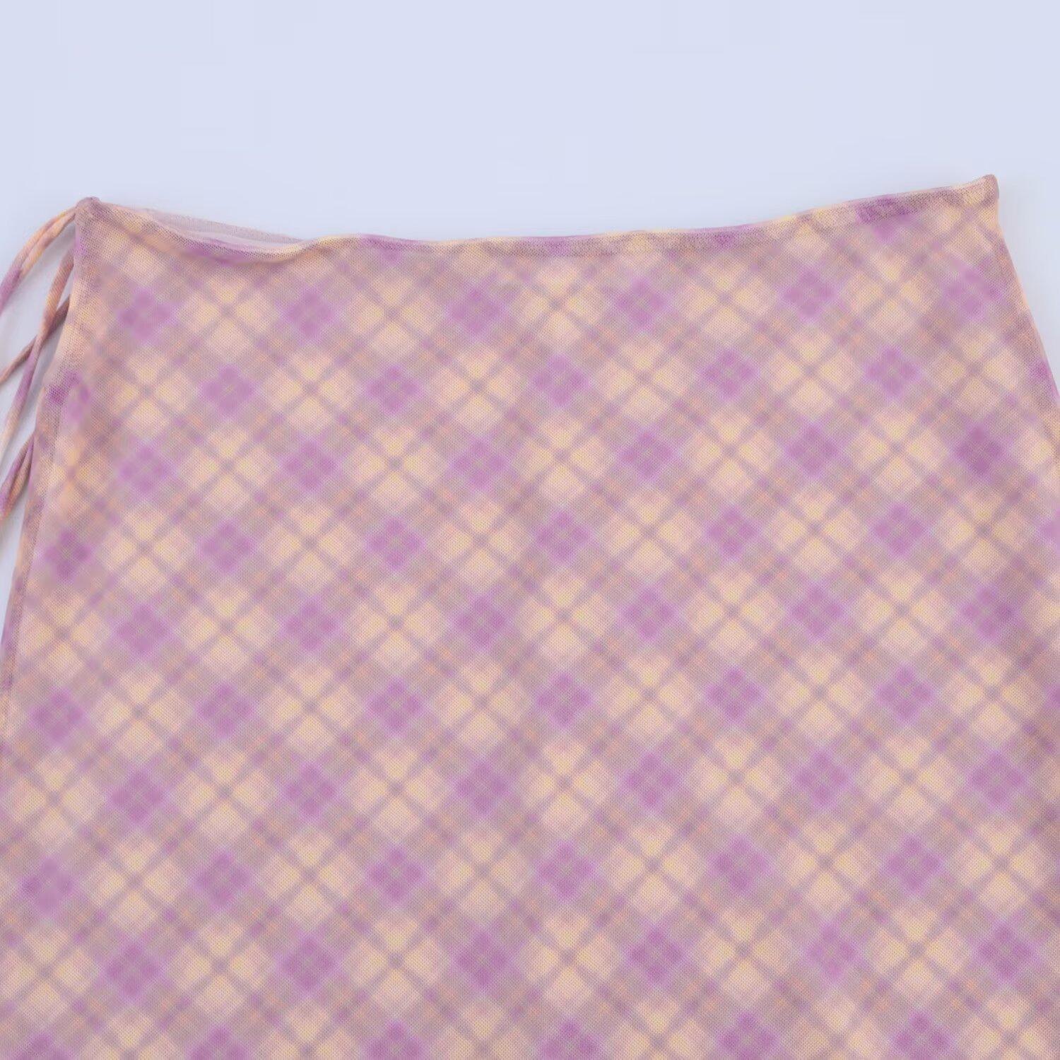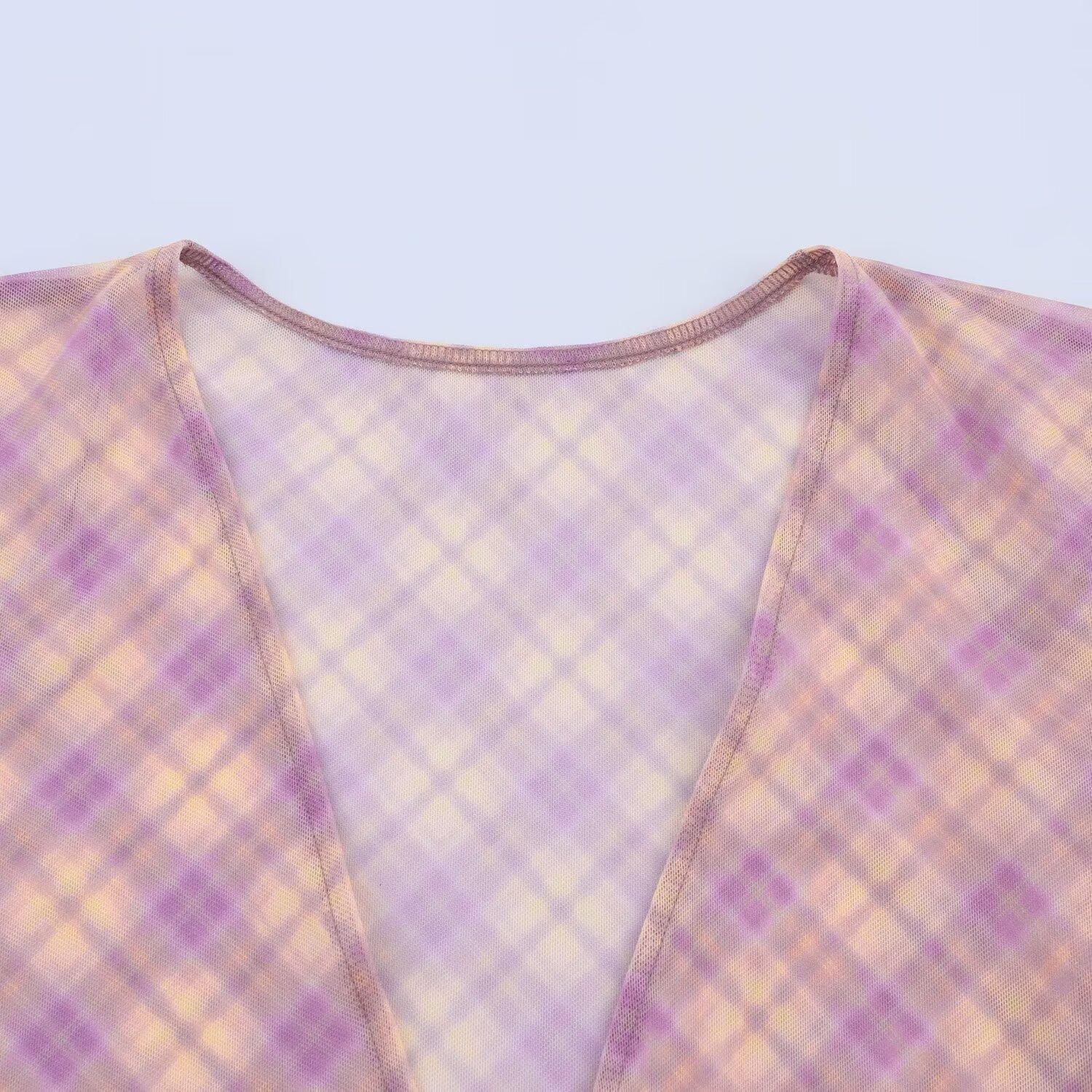 2025 Verano Nuevo Estilo Europeo y Americano Moda Cuadros Seda Malla Manga Acampanada Camisa Falda Adelgazante de Cintura Alta Traje