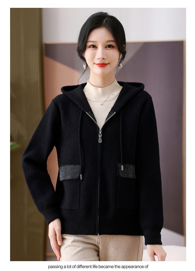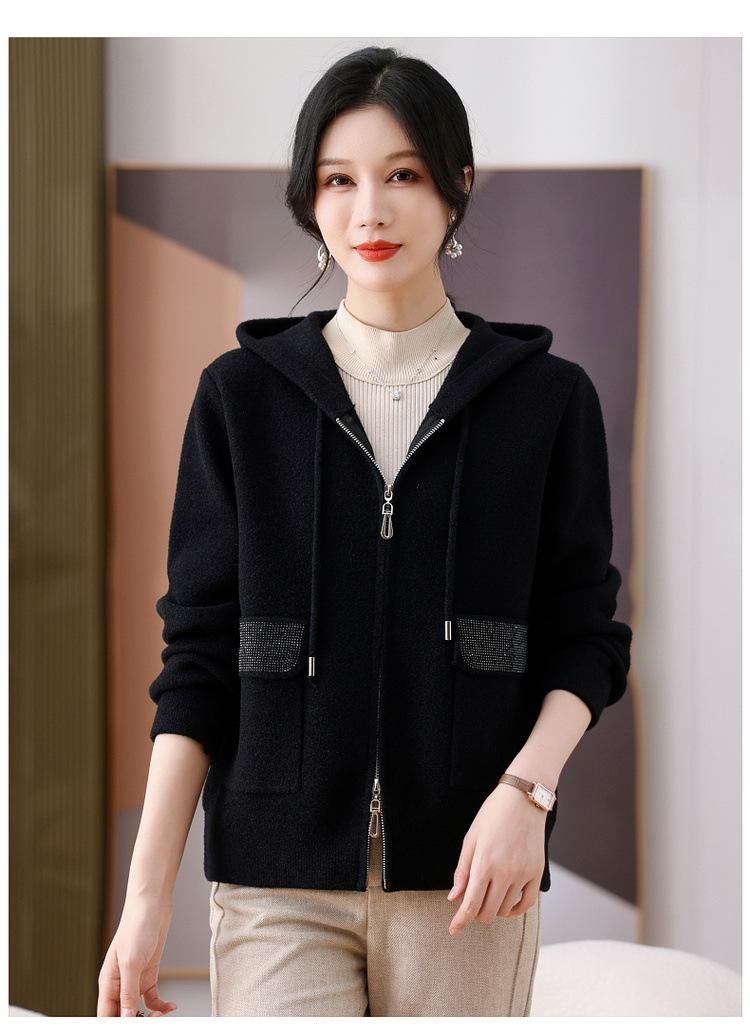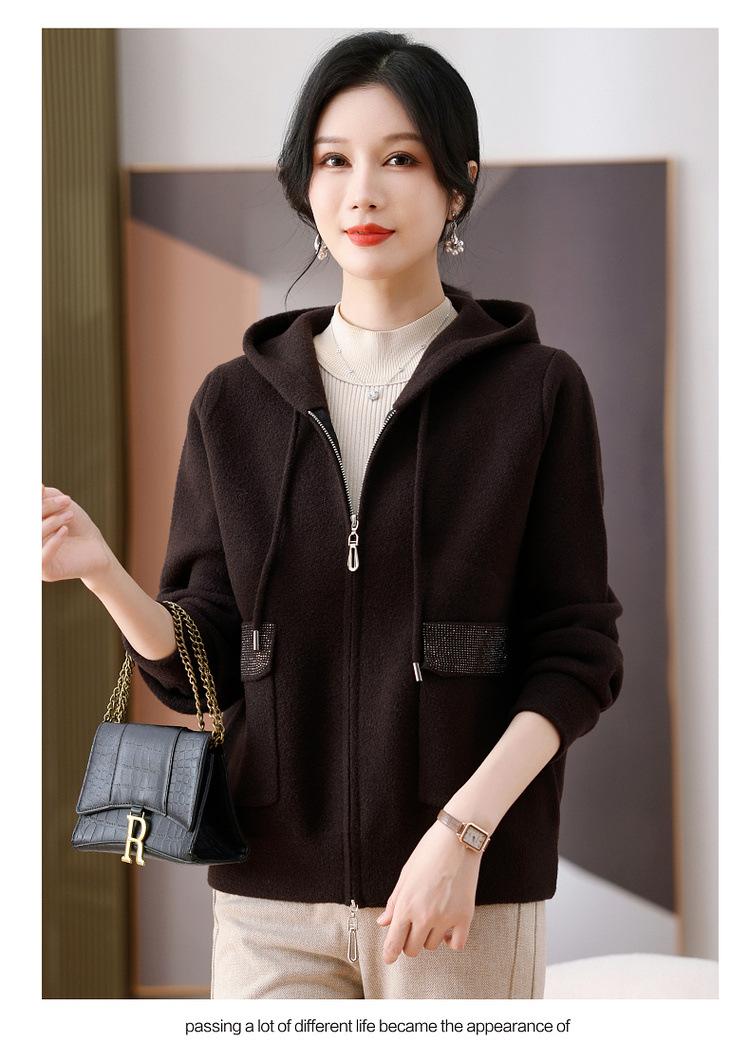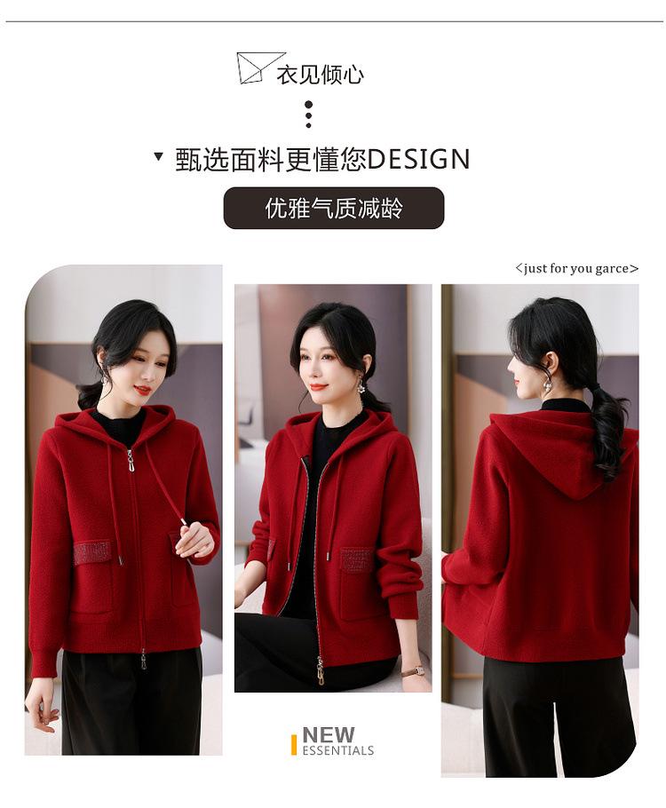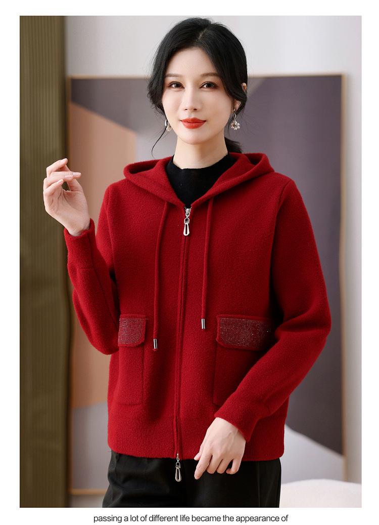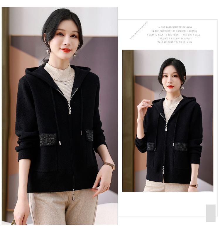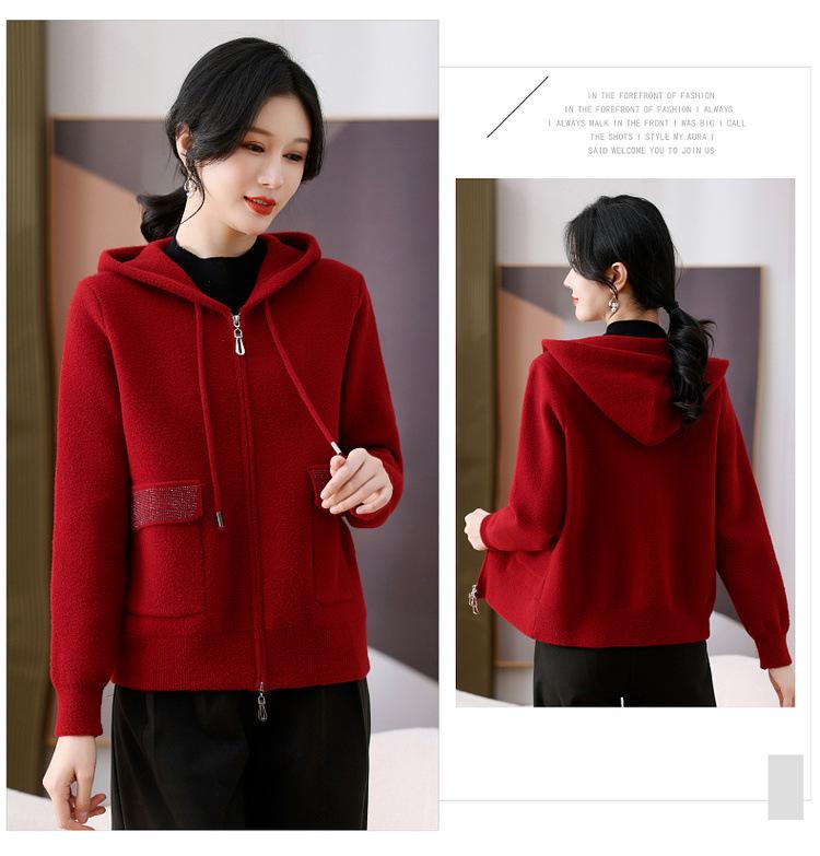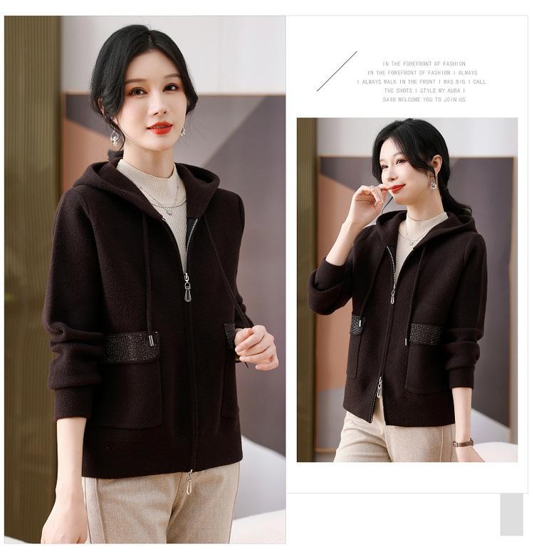 Abrigo de Lana Tejido de Primavera y Otoño para Mamá, Ropa Exterior para Mujeres de Mediana Edad y Mayores, Cárdigan con Capucha y Cierre de Cremallera, Top Casual