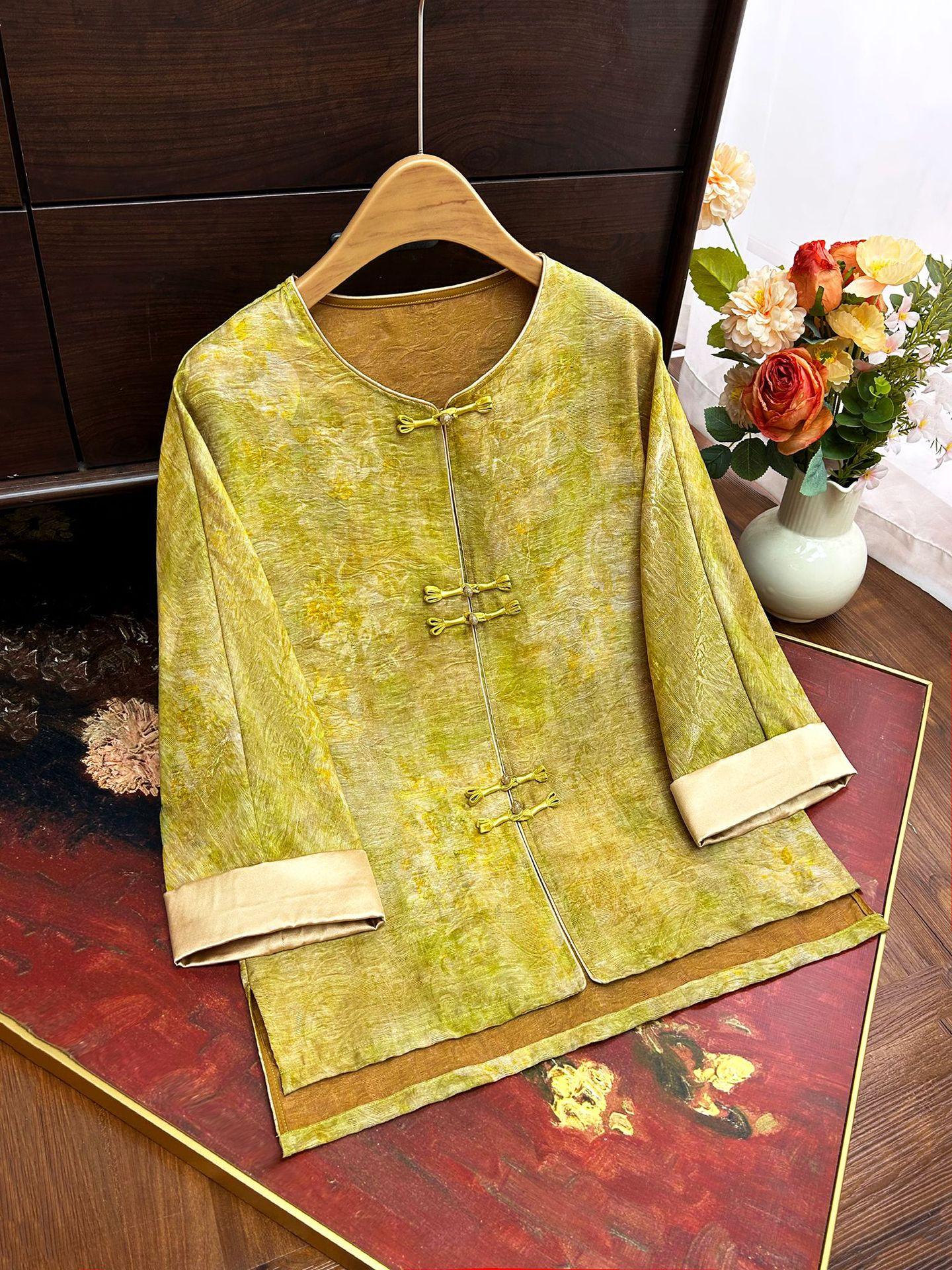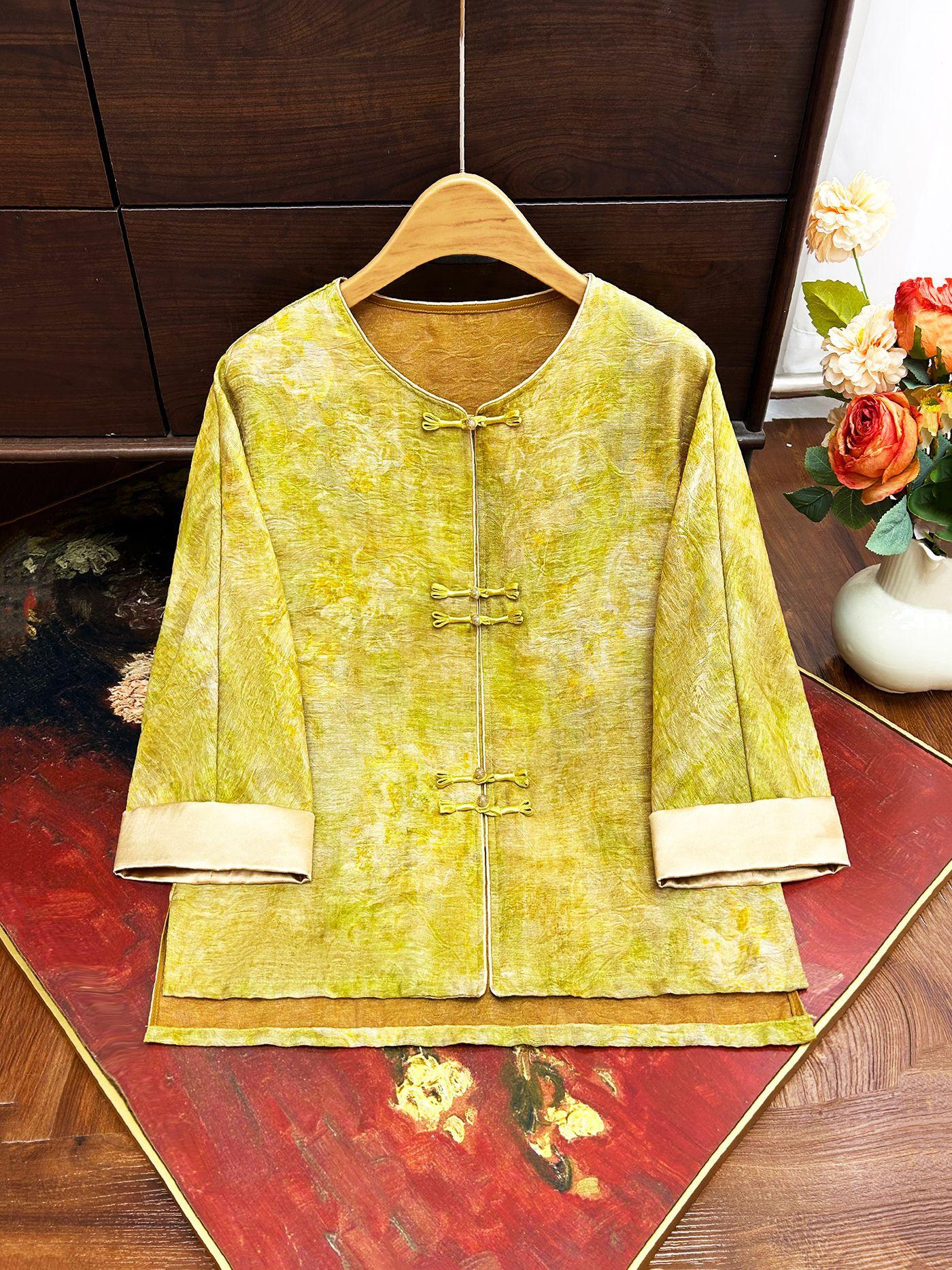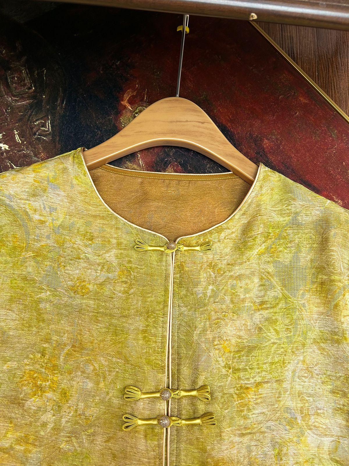Traje Tang de Estilo Nacional Chino Nuevo Camisa de Seda Dorada 2025 Verano Nuevo Retro Sensación de Alta Gama Top Camisa Elegante