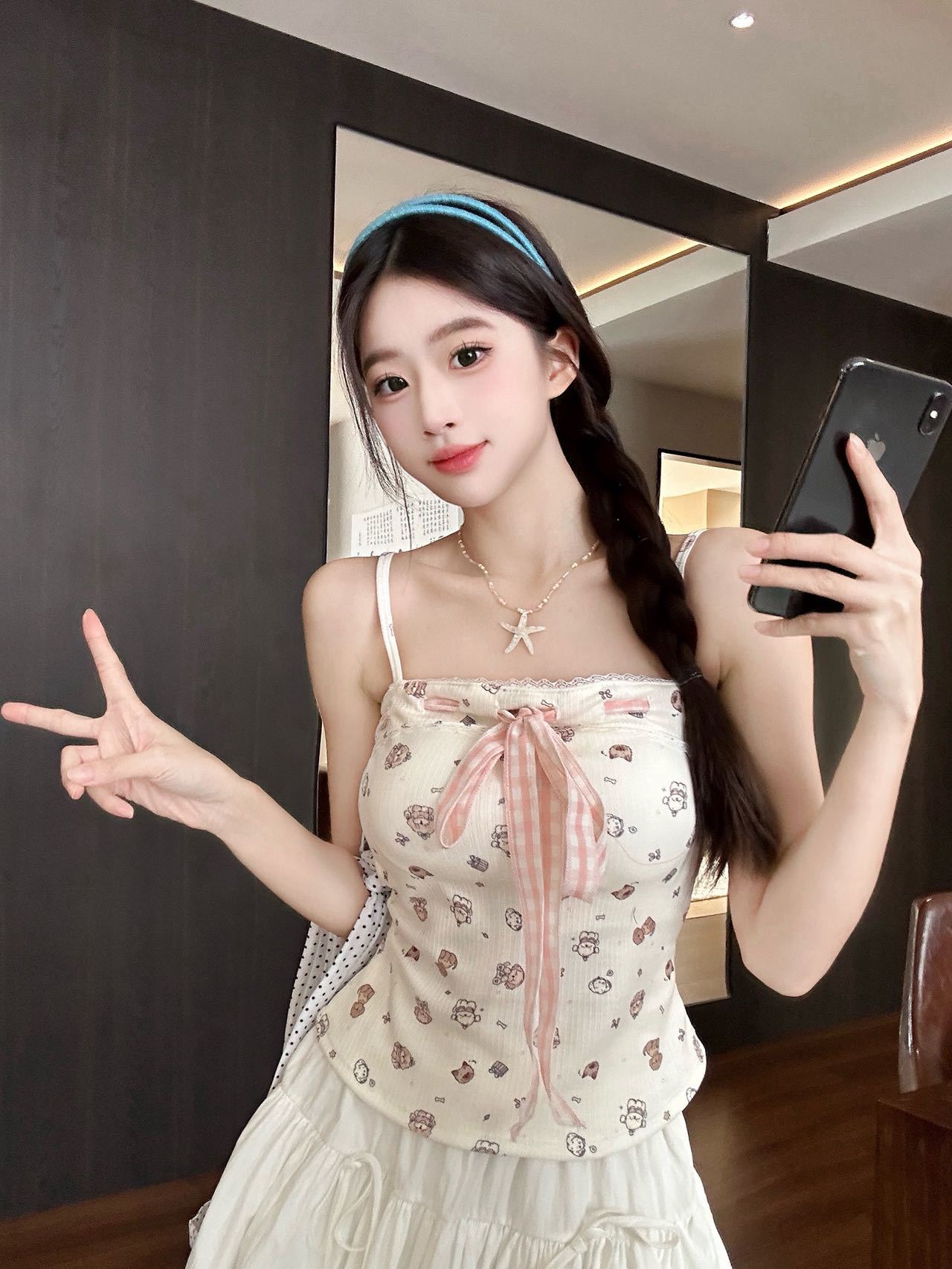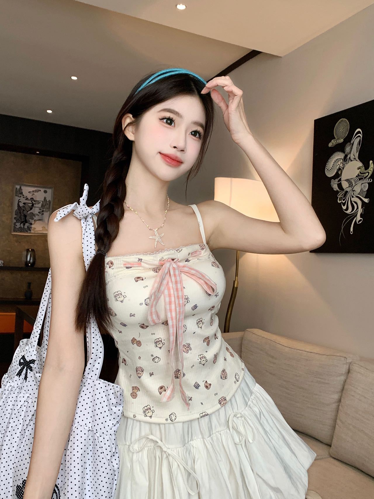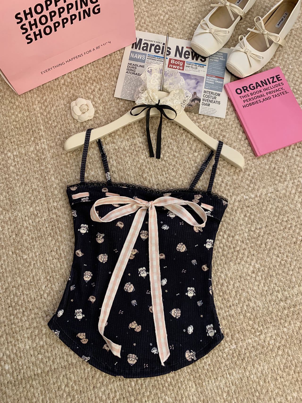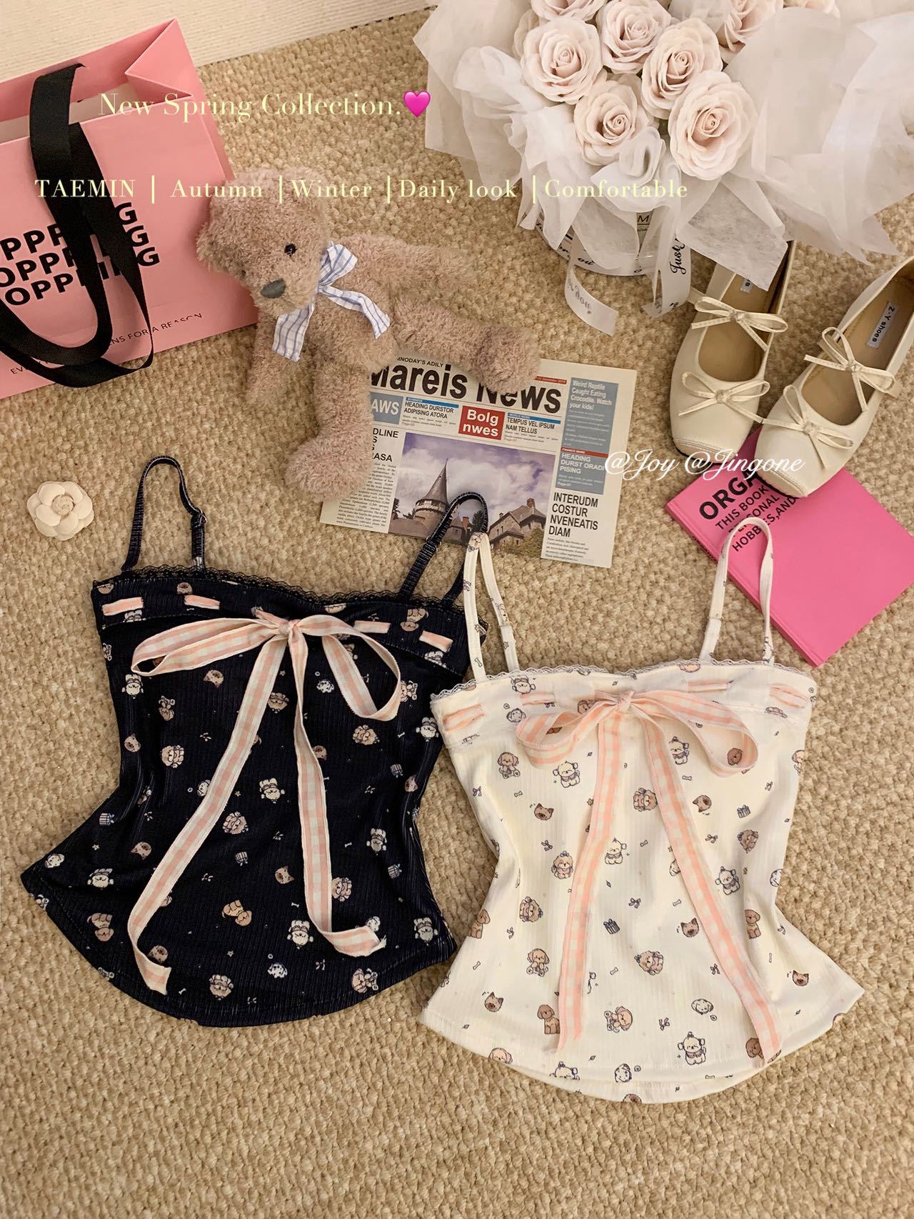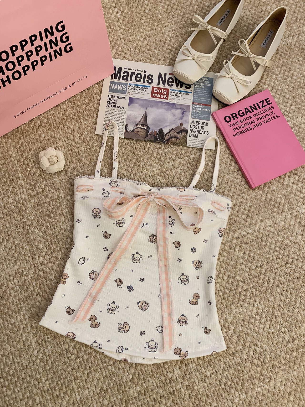 Camisola dulce de estilo con estampado divertido y lazo para mujer otoño 2025 nueva ajuste ceñido y adelgazante con top con almohadilla en el pecho