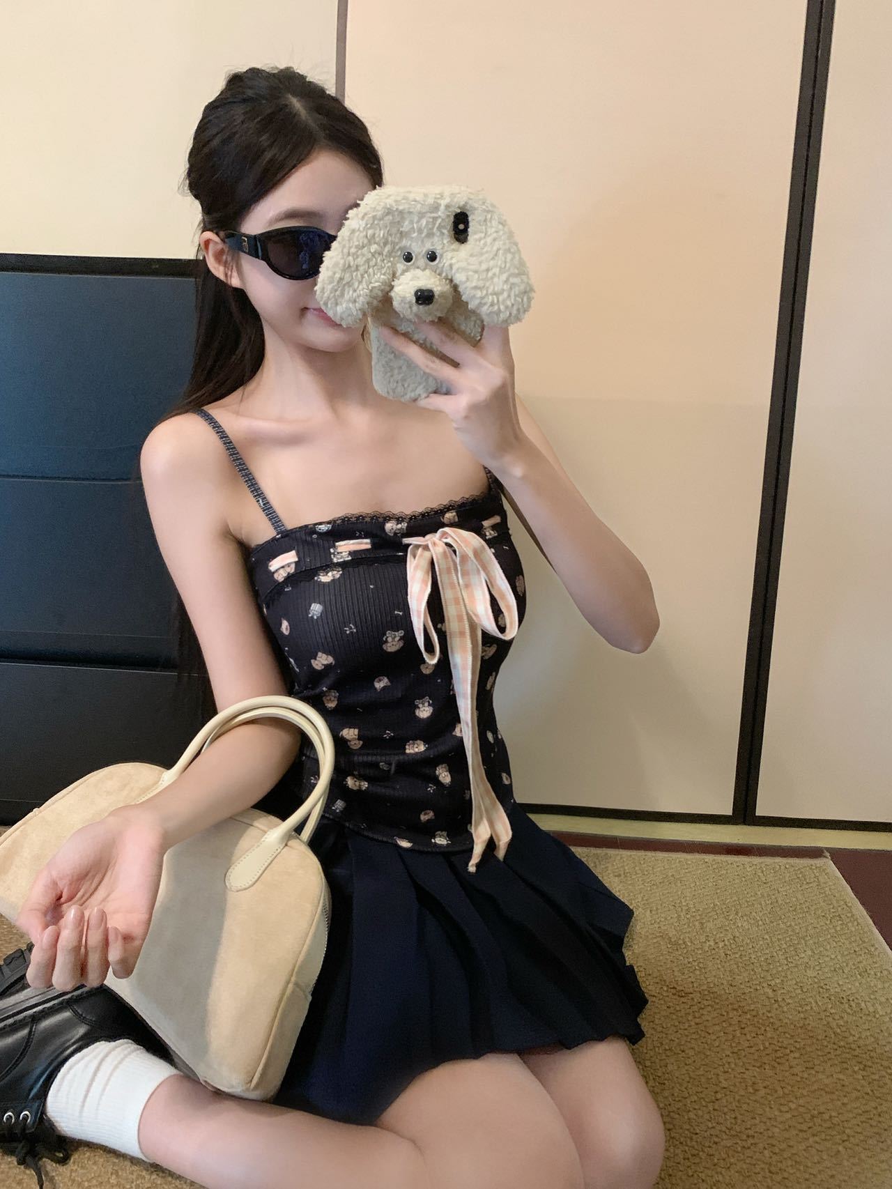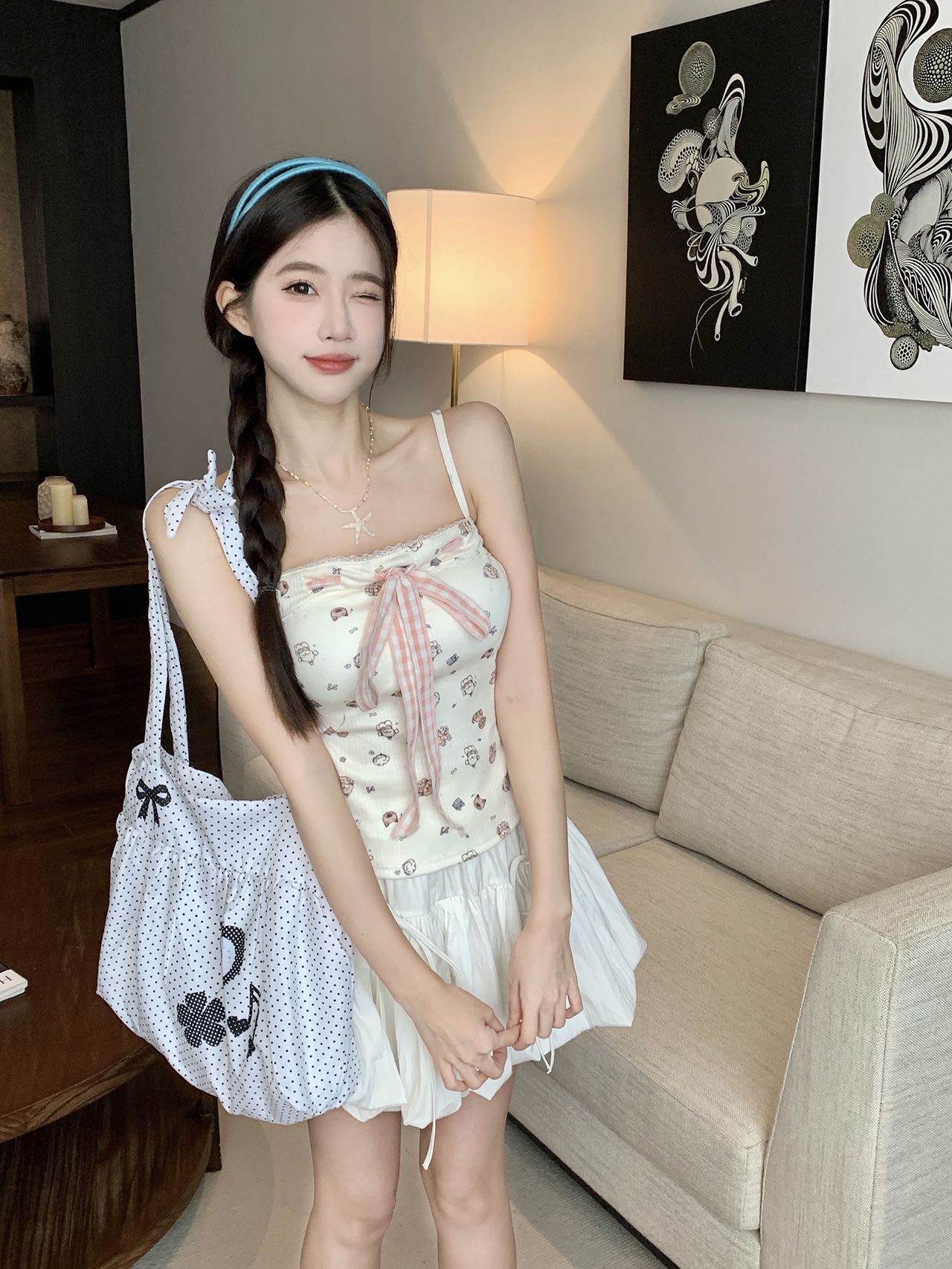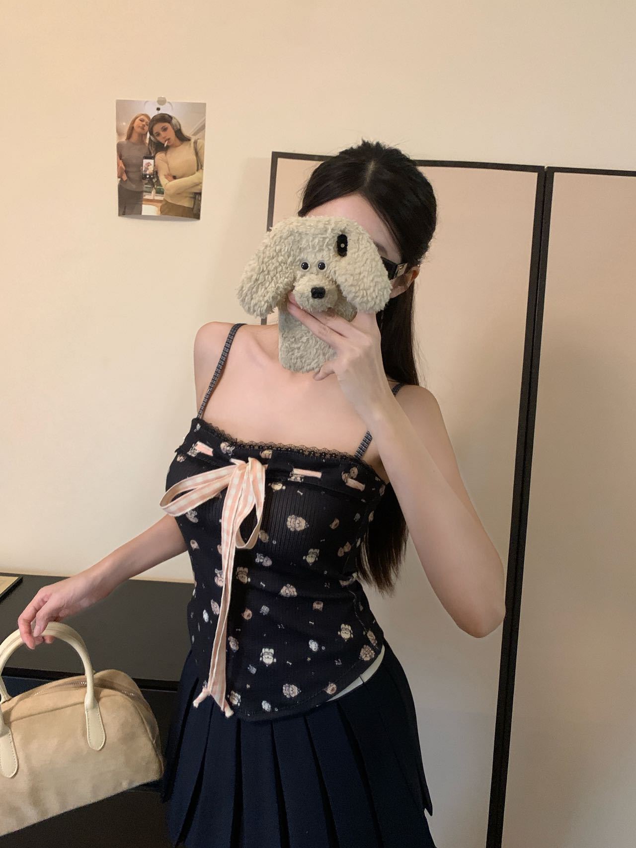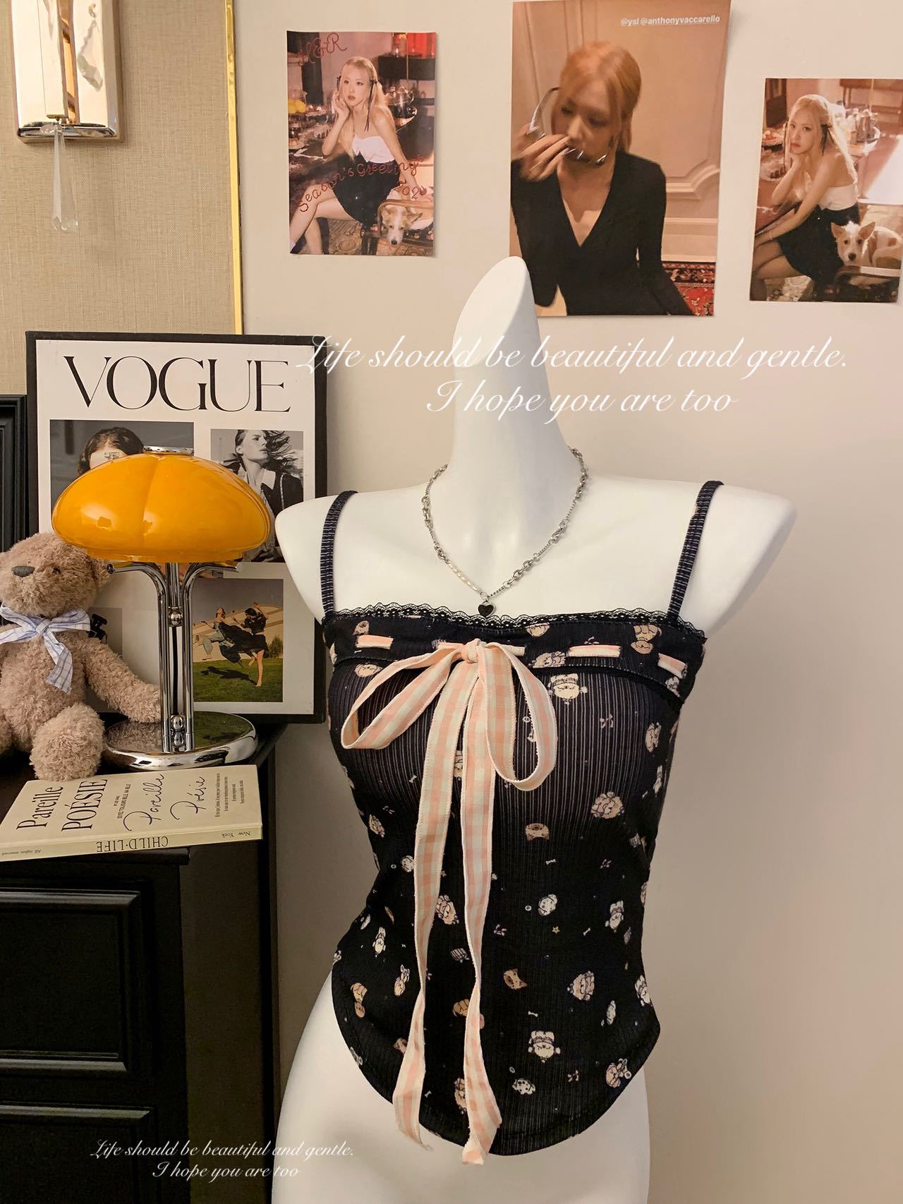 Camisola dulce de estilo con estampado divertido y lazo para mujer otoño 2025 nueva ajuste ceñido y adelgazante con top con almohadilla en el pecho