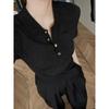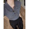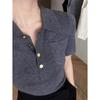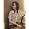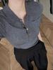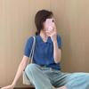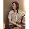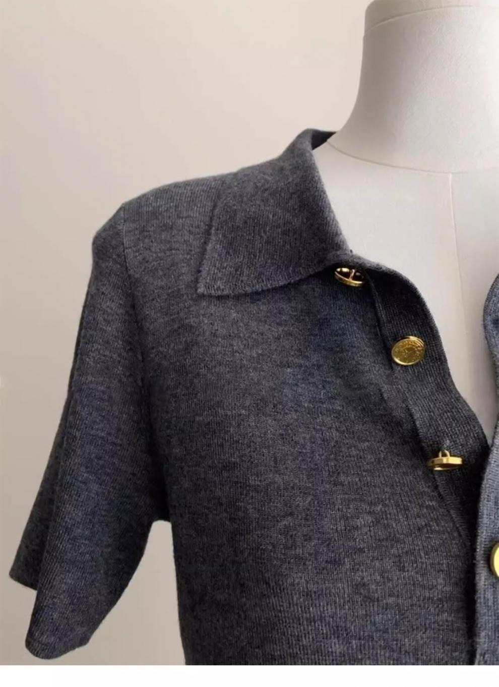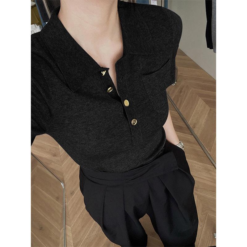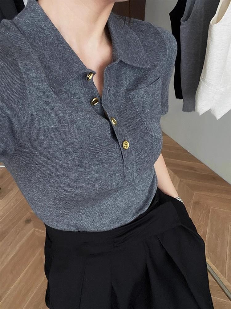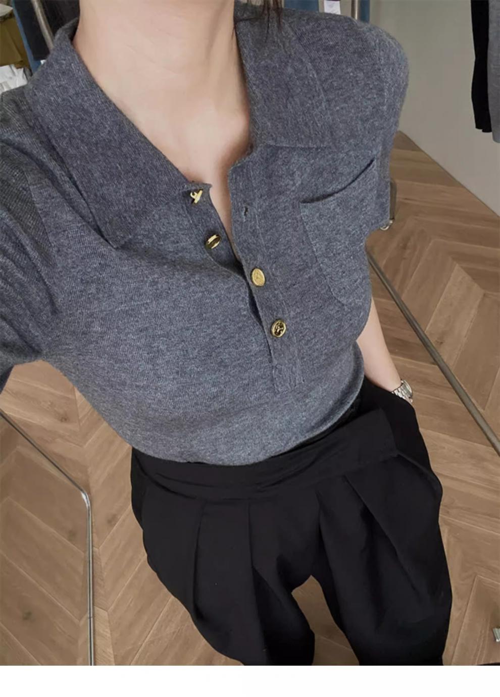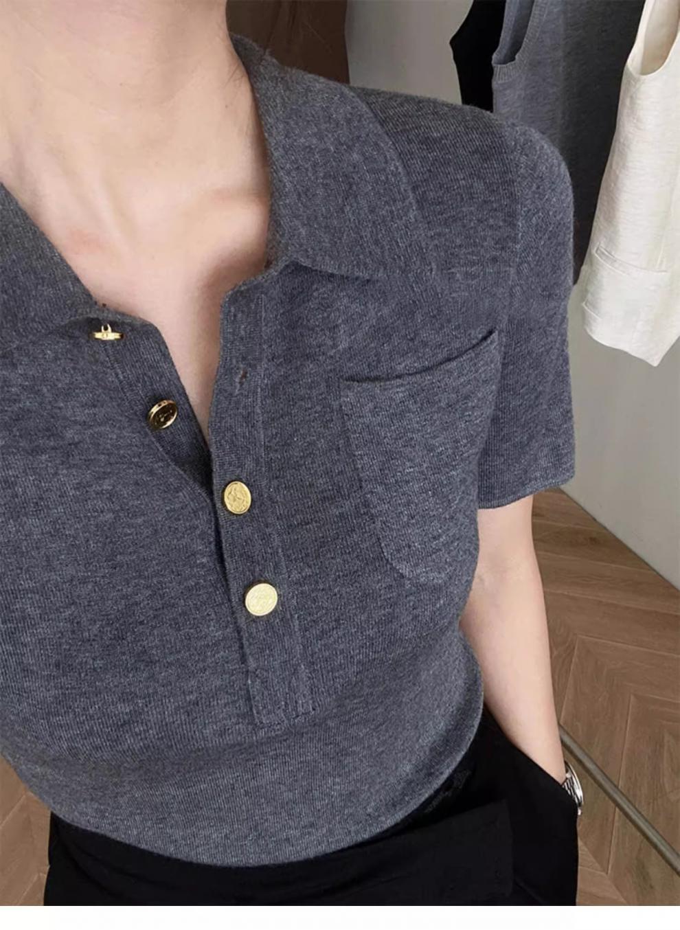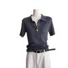 Polo Francés Cuello Gris Manga Corta Top de Punto Mujer Verano Estilo Corto Temperamento de Alta Gama Seda de Hielo Camiseta Hombro Recto A5533