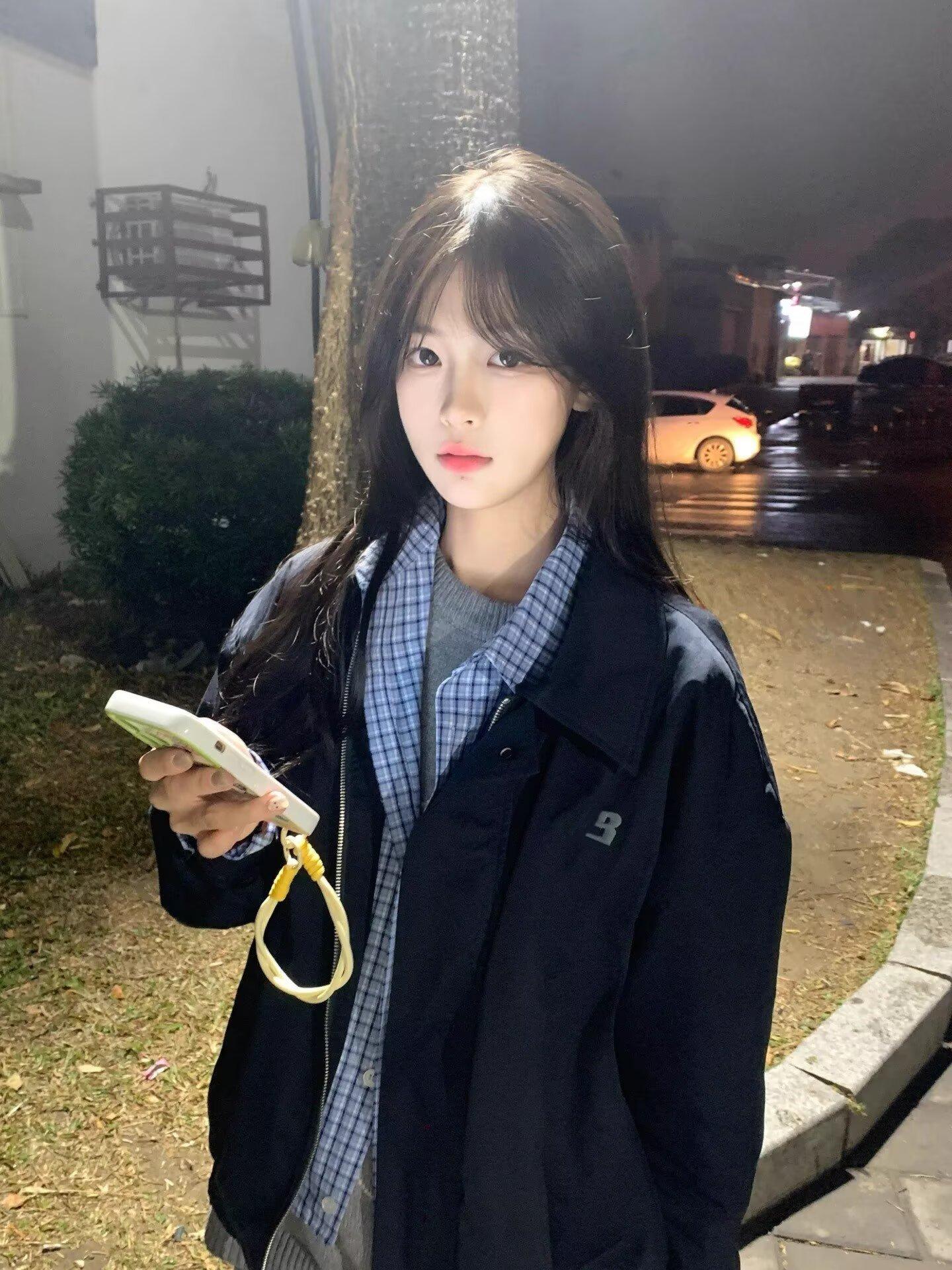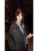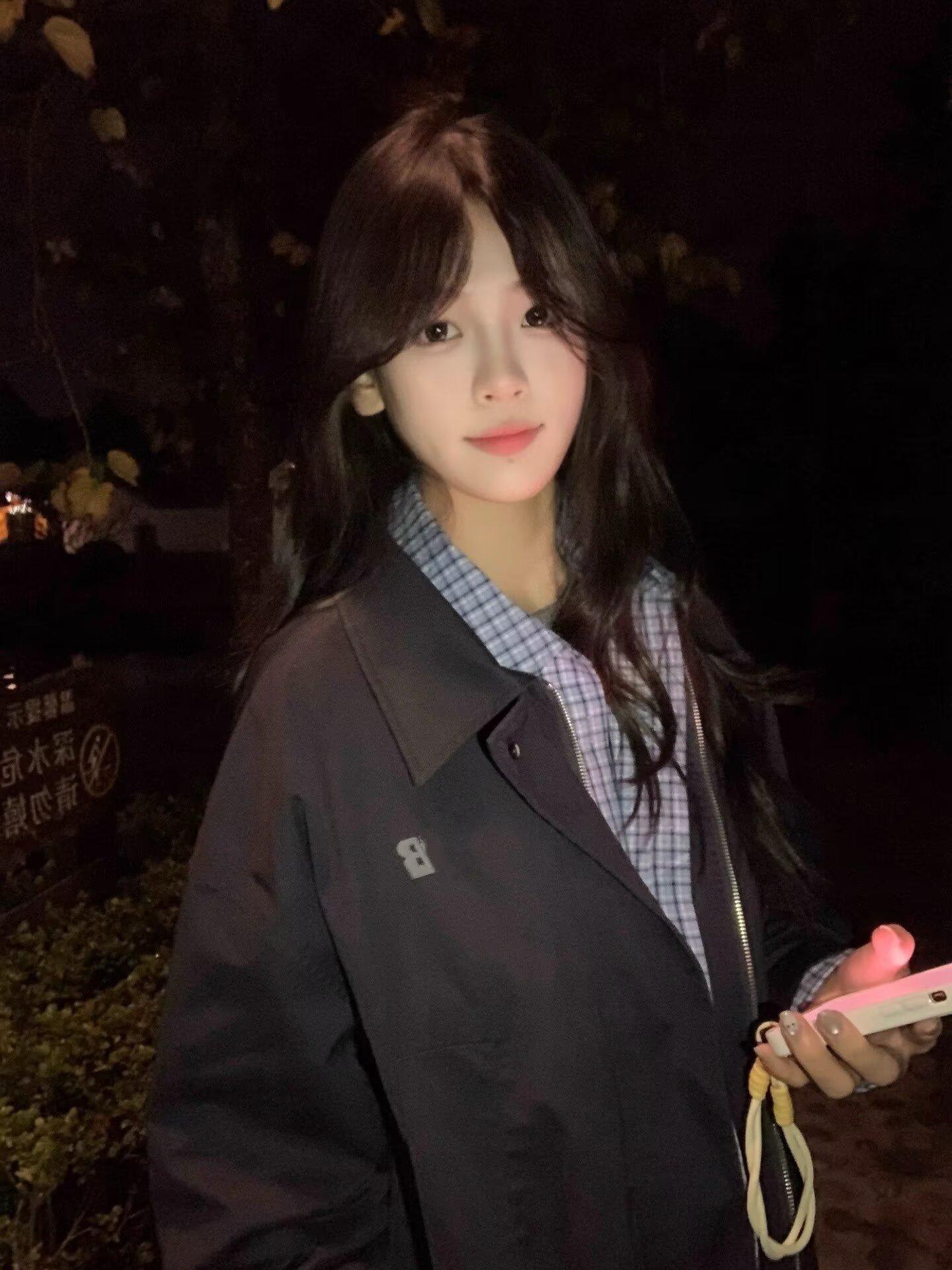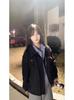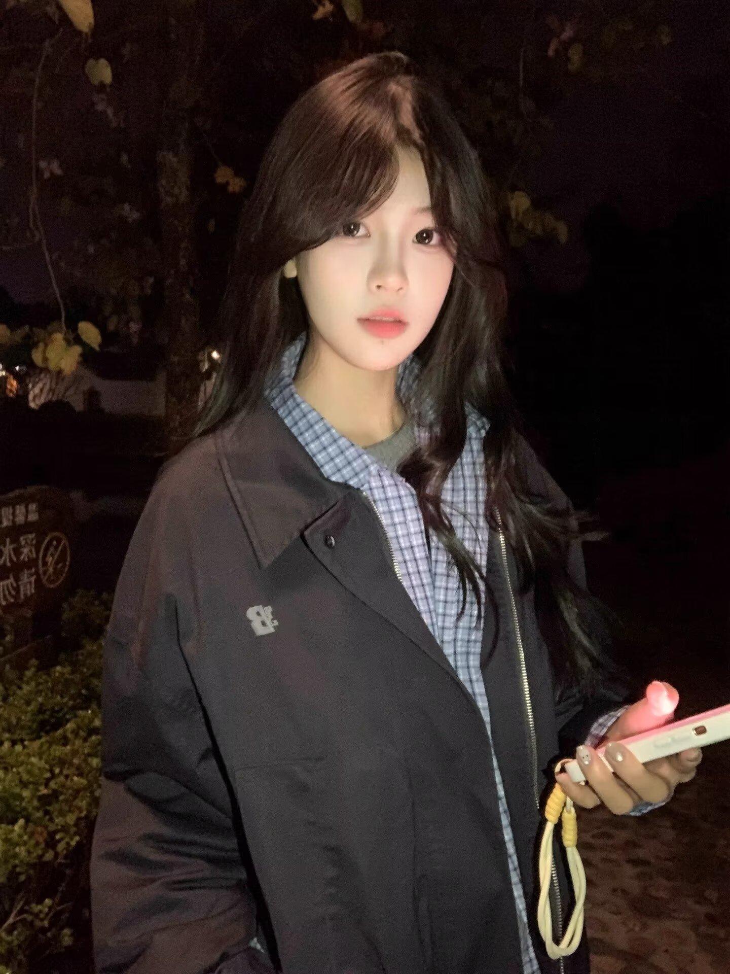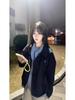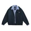 Foto Real Nueva Primavera y Otoño Azul y Blanco a Cuadros Bloque de Color Cuello Vuelto Falso Dos Piezas Bordado Suelto Casual Chaqueta Ropa Exterior para Mujer