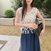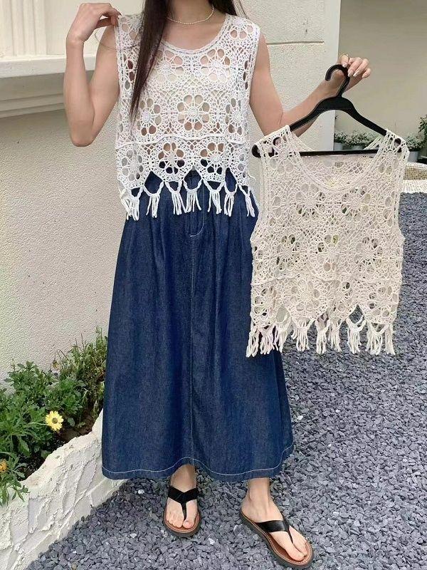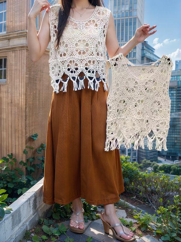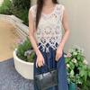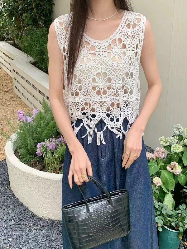 Camisola de Borlas Dulce y Juvenil para Mujer, Estilo Francés Verano Crochet Calado Chic sin Mangas Top Corto Trendy
