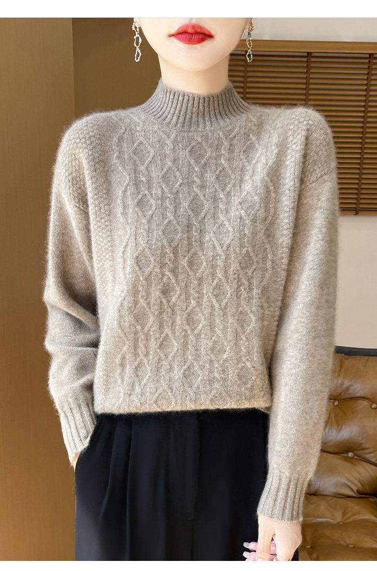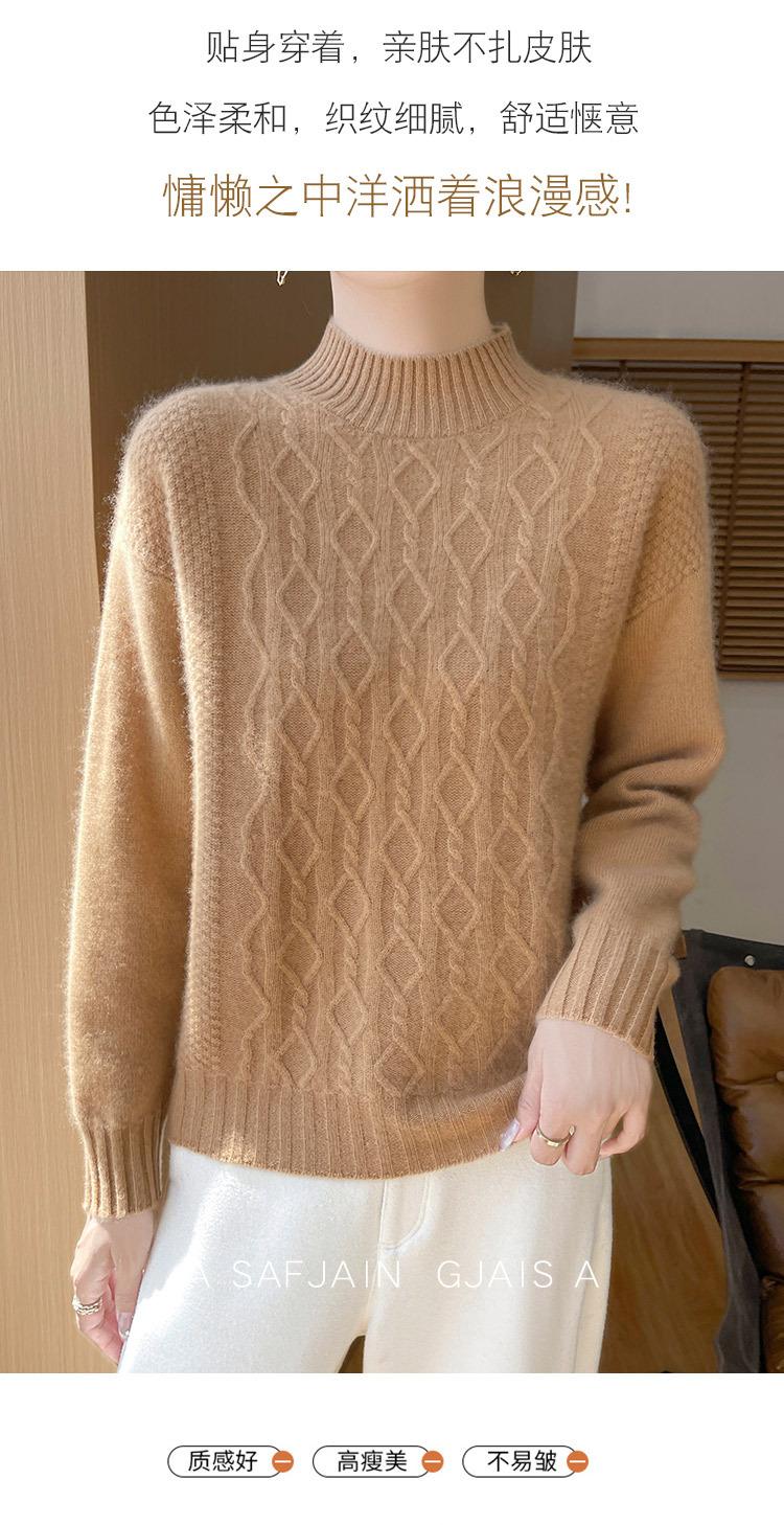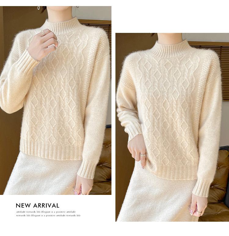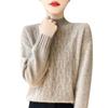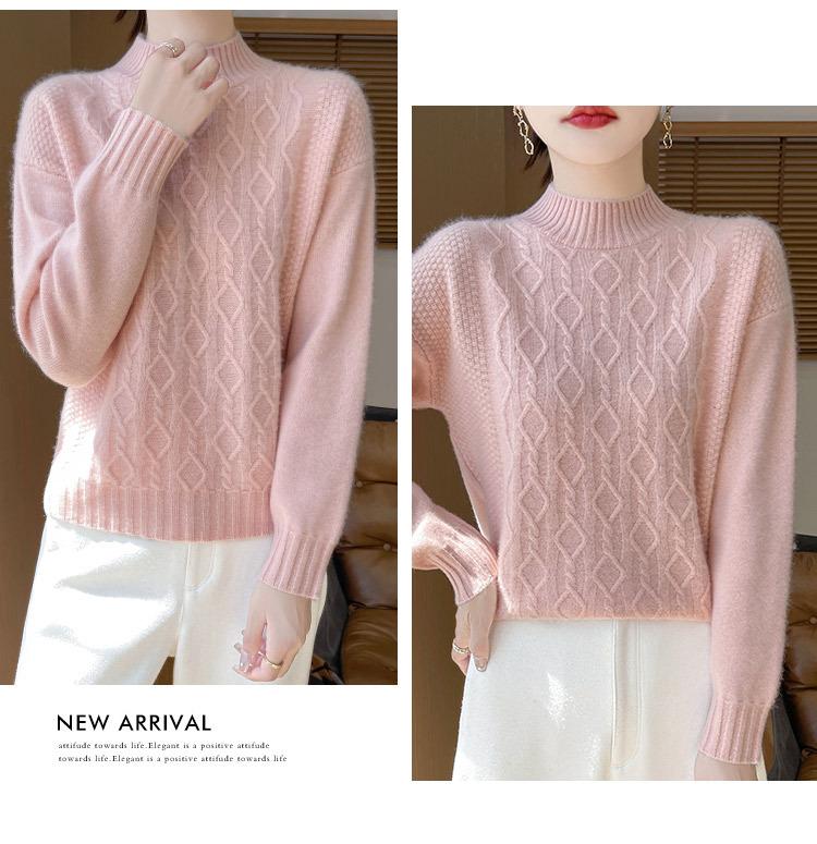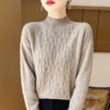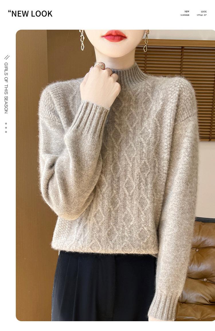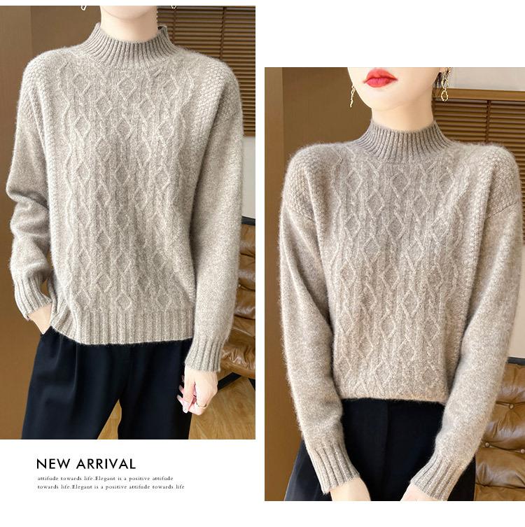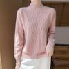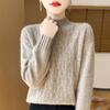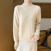 Otoño e invierno 2024 nuevo suéter de lana pura con cuello semi alto, tejido de punto trenzado de rombos de alta resistencia, jersey cálido de base para mujer