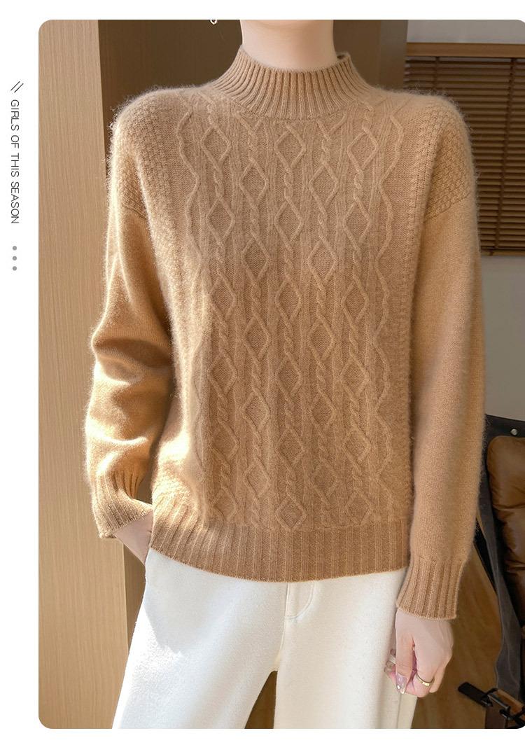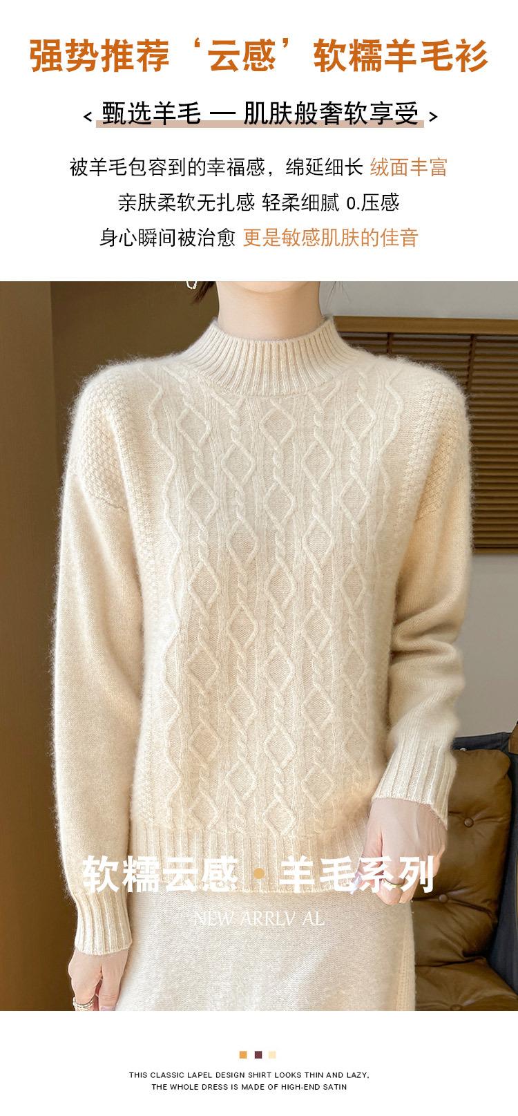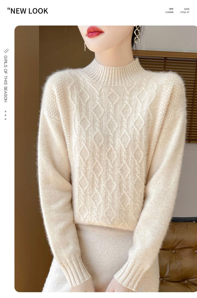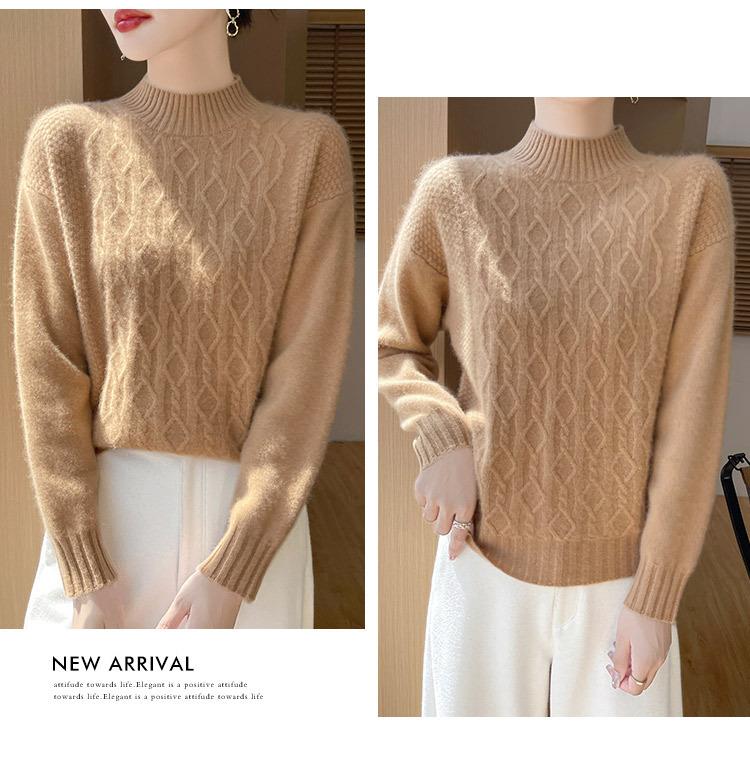 Otoño e invierno 2024 nuevo suéter de lana pura con cuello semi alto, tejido de punto trenzado de rombos de alta resistencia, jersey cálido de base para mujer