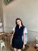 Traje Estilo Universitario Falso Dos Piezas Empalmado Camiseta de Manga Corta Falda Plisada de Verano para Mujer Falda Línea A Conjunto de Moda de Dos Piezas