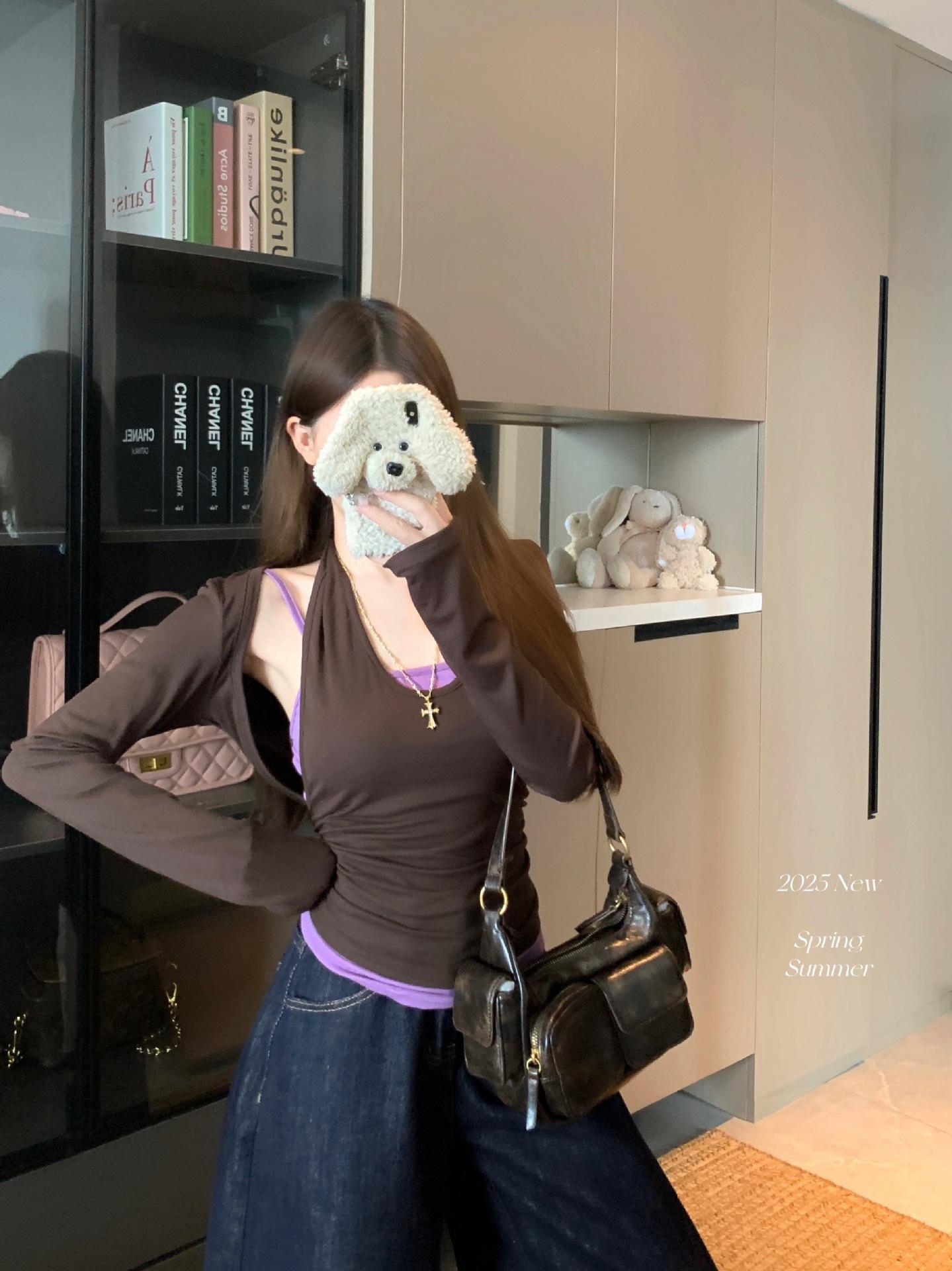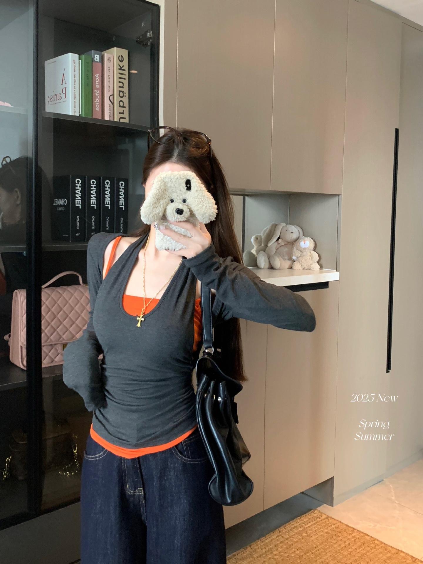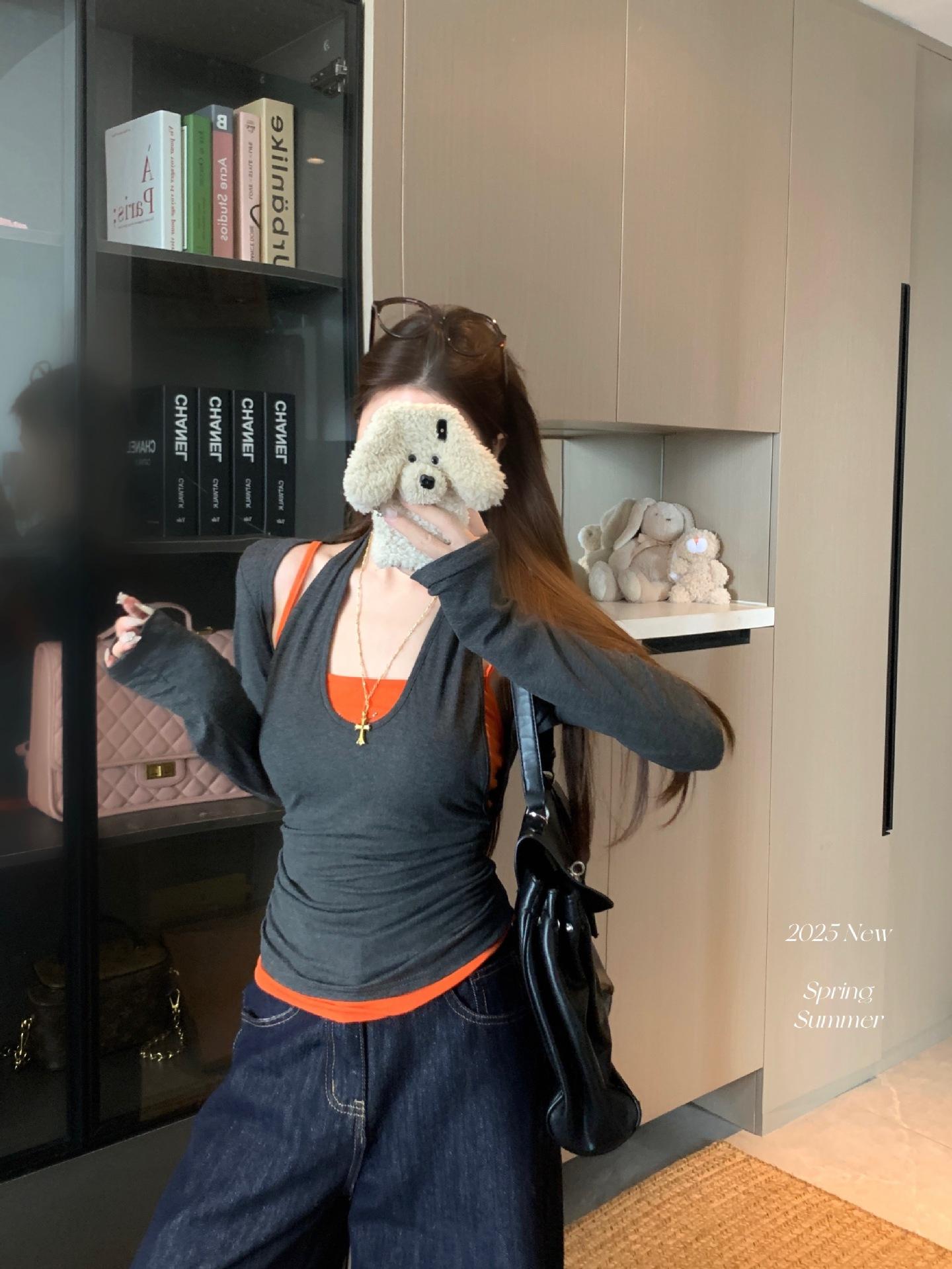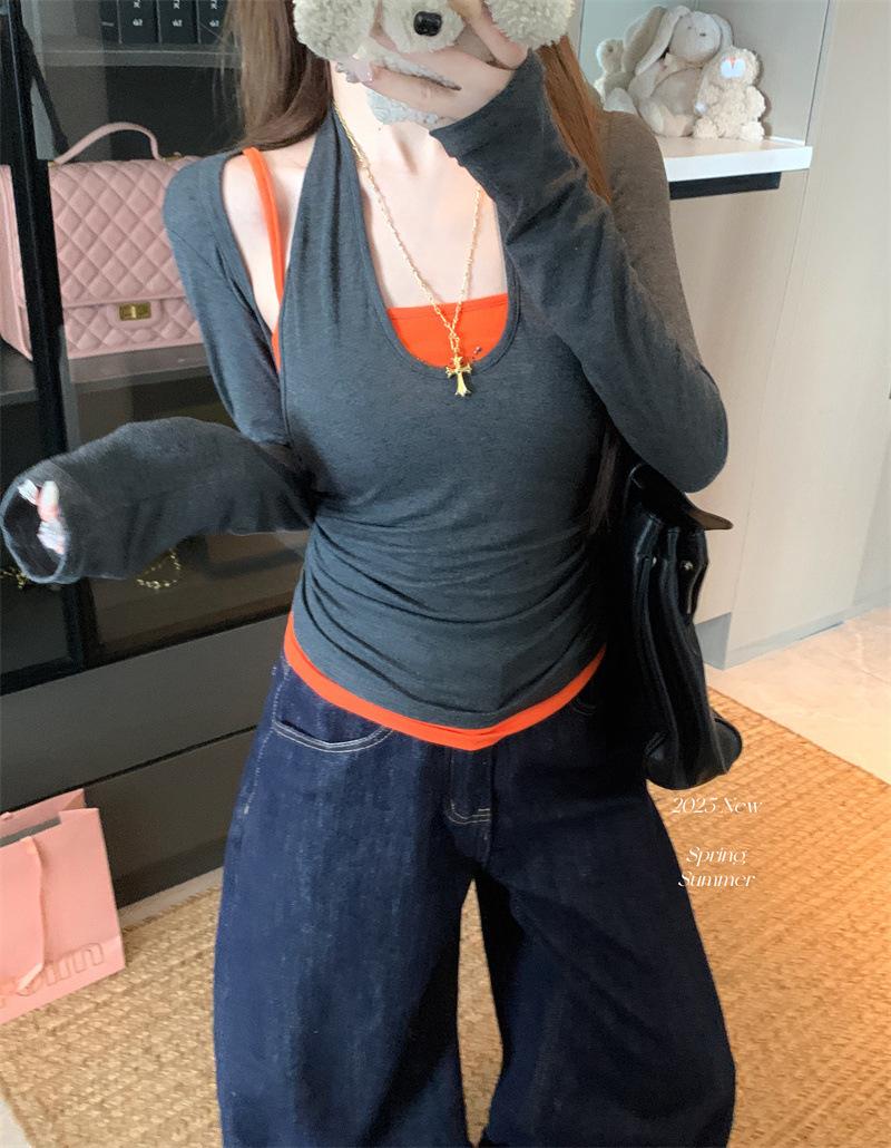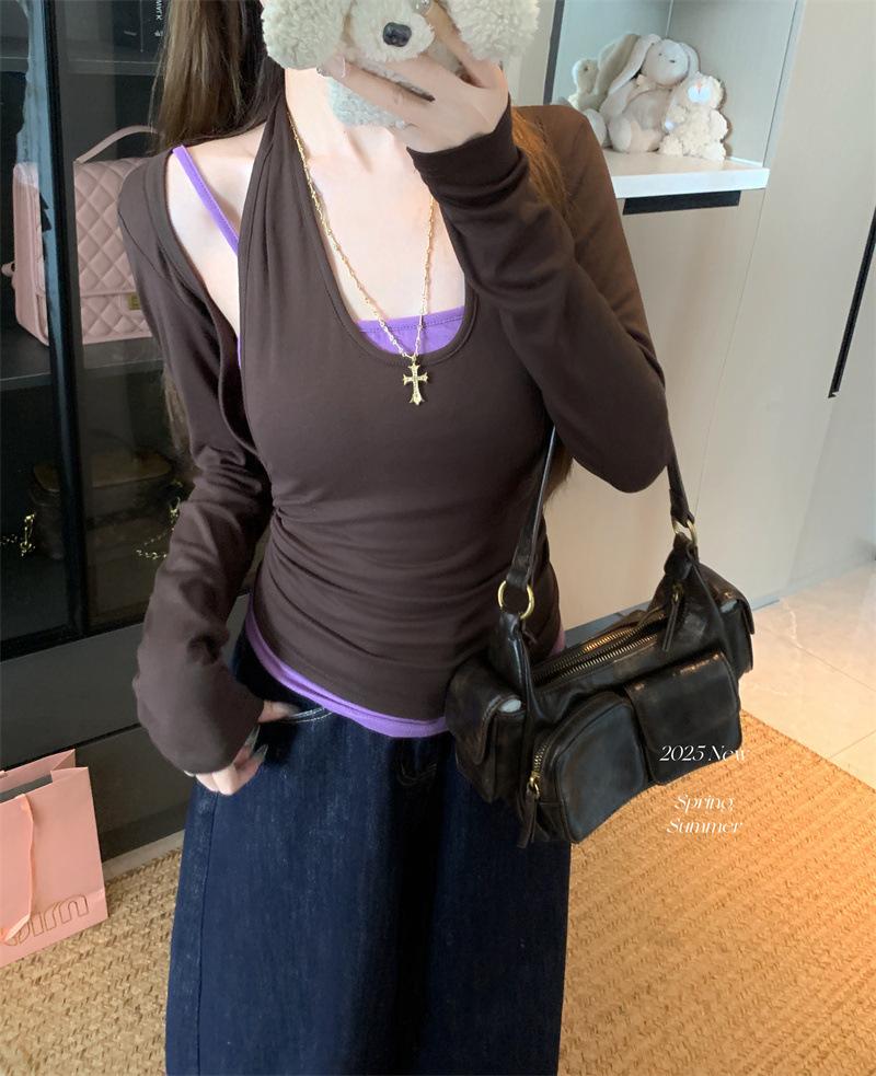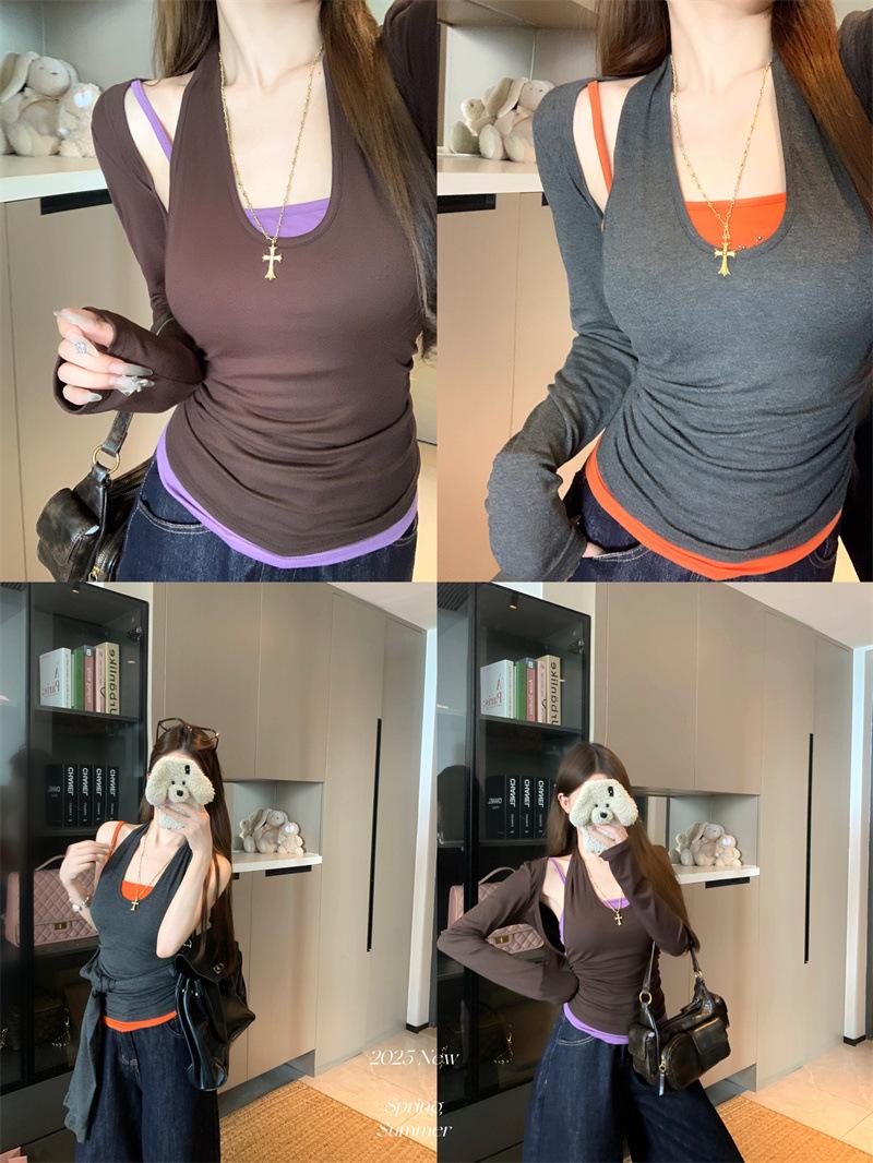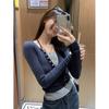 Playera de manga larga de dos piezas falsas para mujer, diseño nicho con sentido del diseño de principios de otoño, corte ajustado entallado, estilo corto de chica caliente, capa interior, top camisa básica