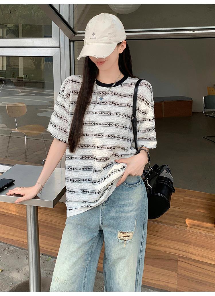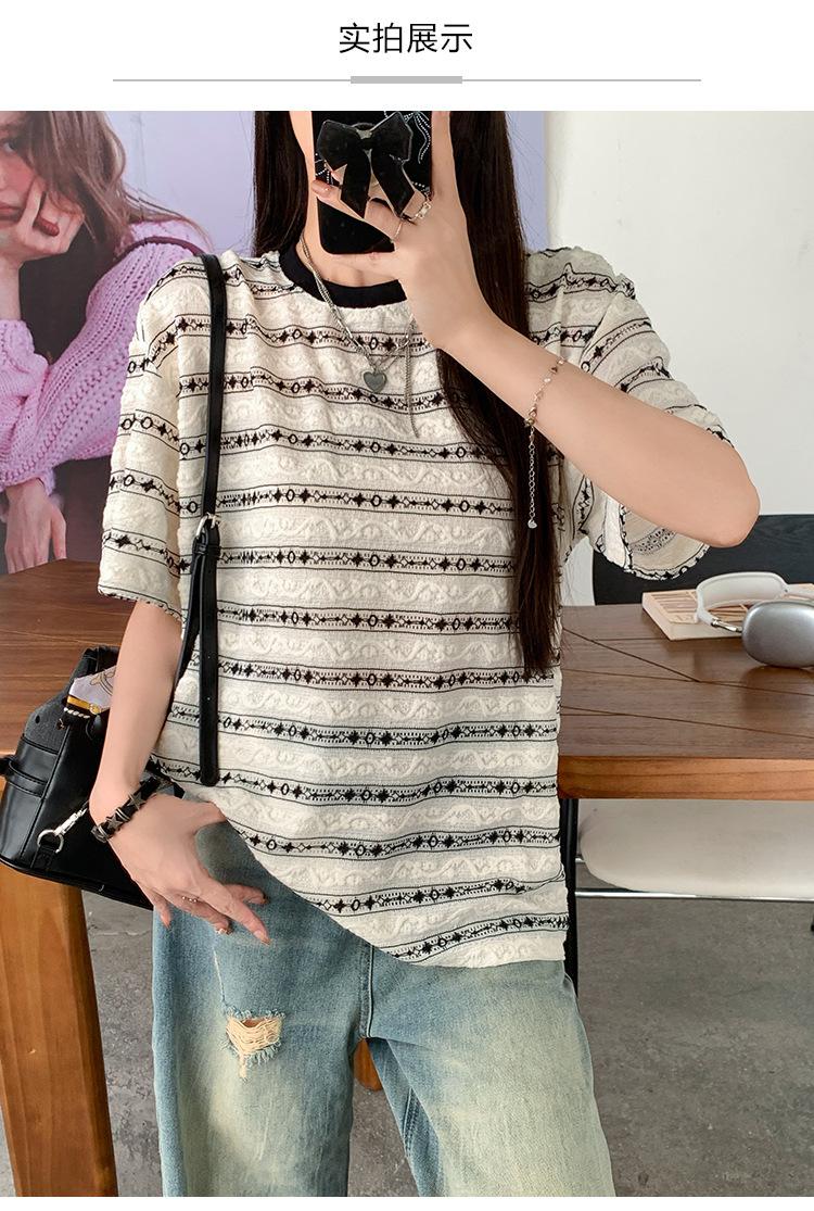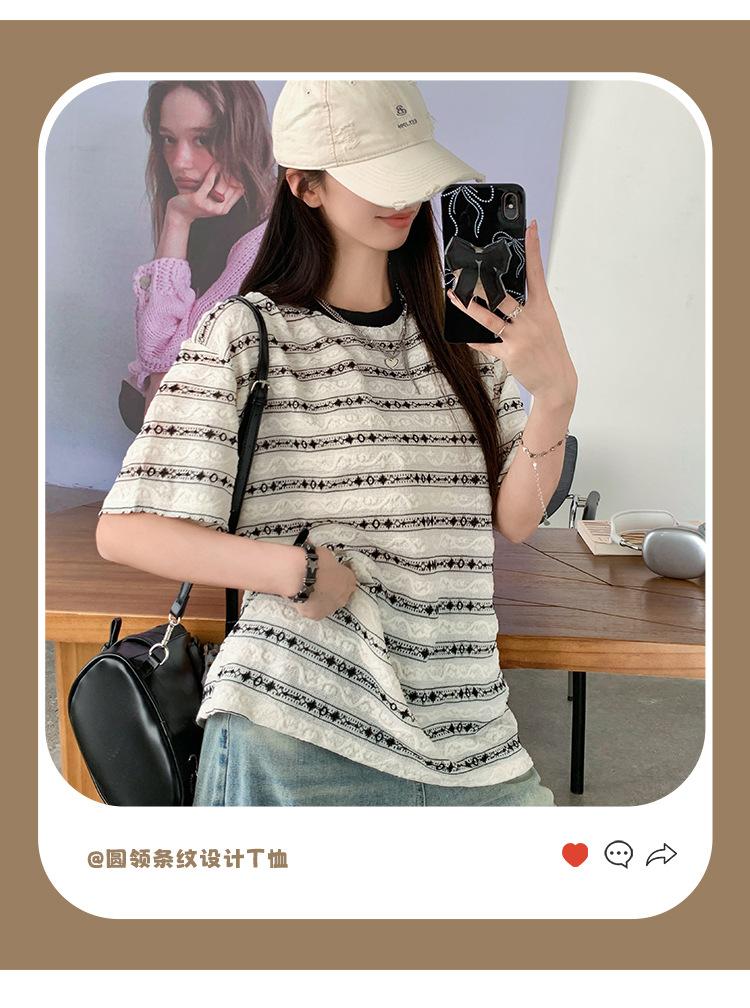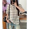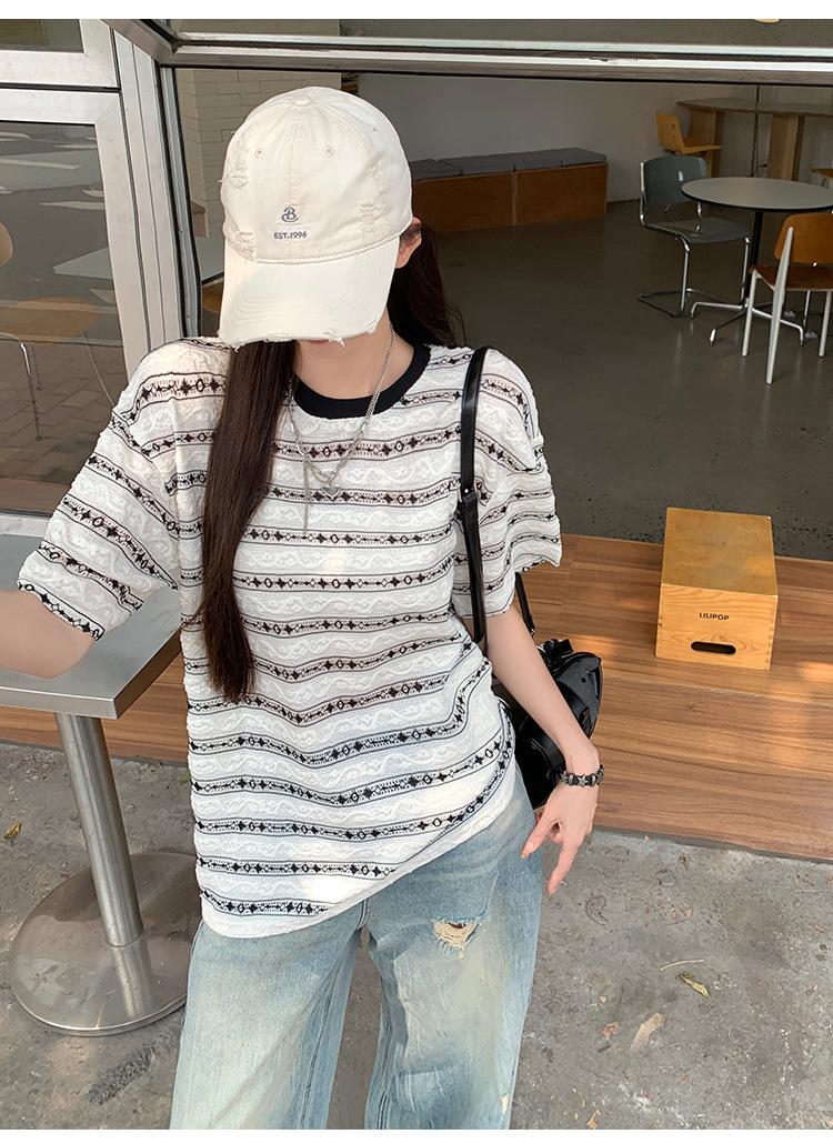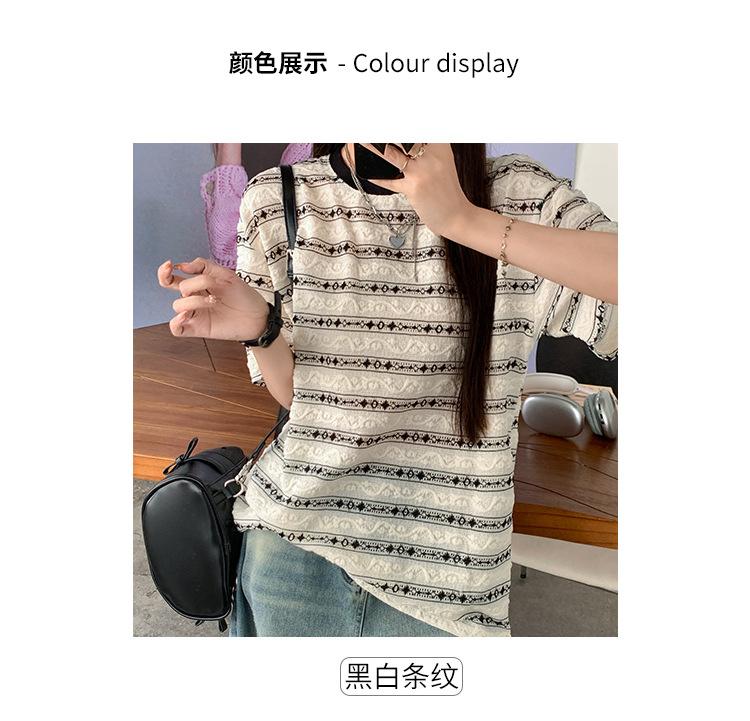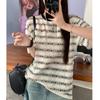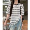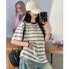 Foto Real de Camiseta de Manga Corta con Hombro Derecho a Rayas con Bloque de Color para Mujer Verano 2025 Nuevo Diseño Top Suelto de Media Manga