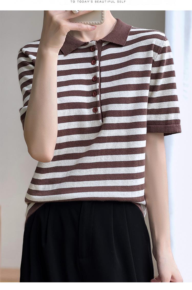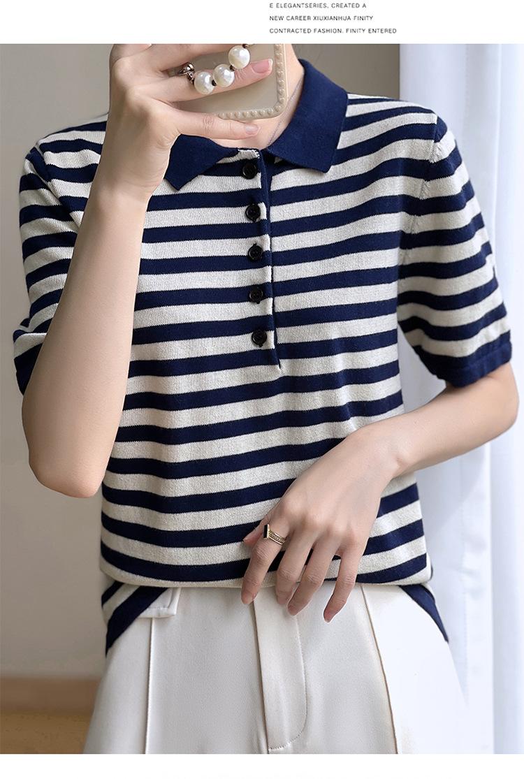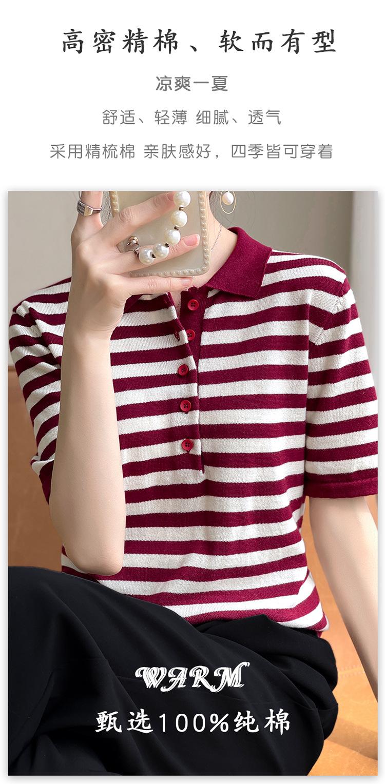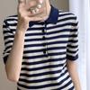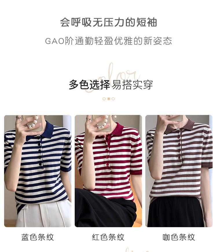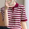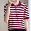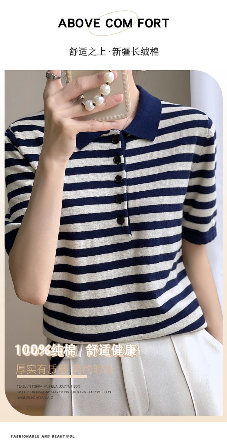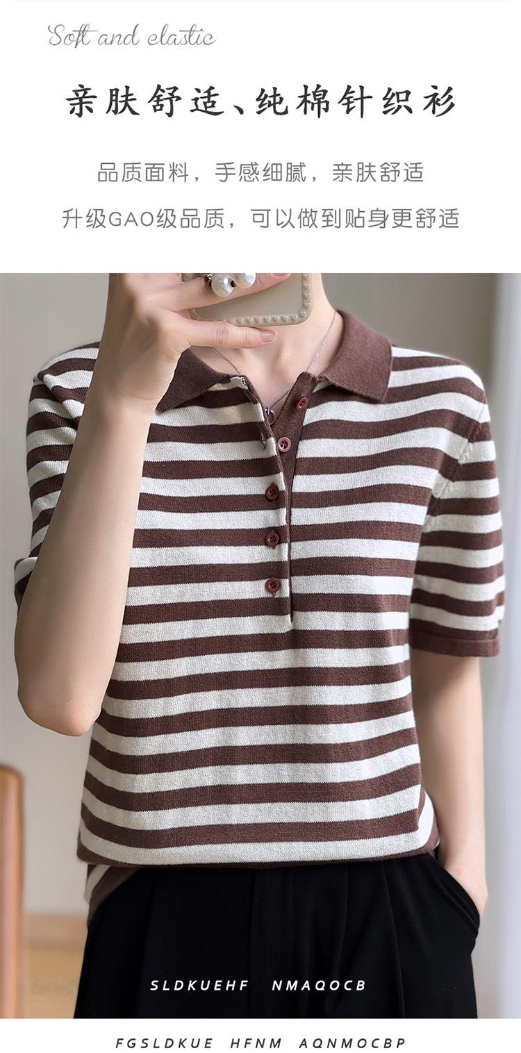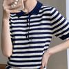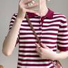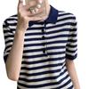 2025 Nuevo Verano Algodón Puro Polo Cuello Tejido Camiseta de Manga Corta para Mujer Simple a Rayas con Bloques de Color Camiseta Básica