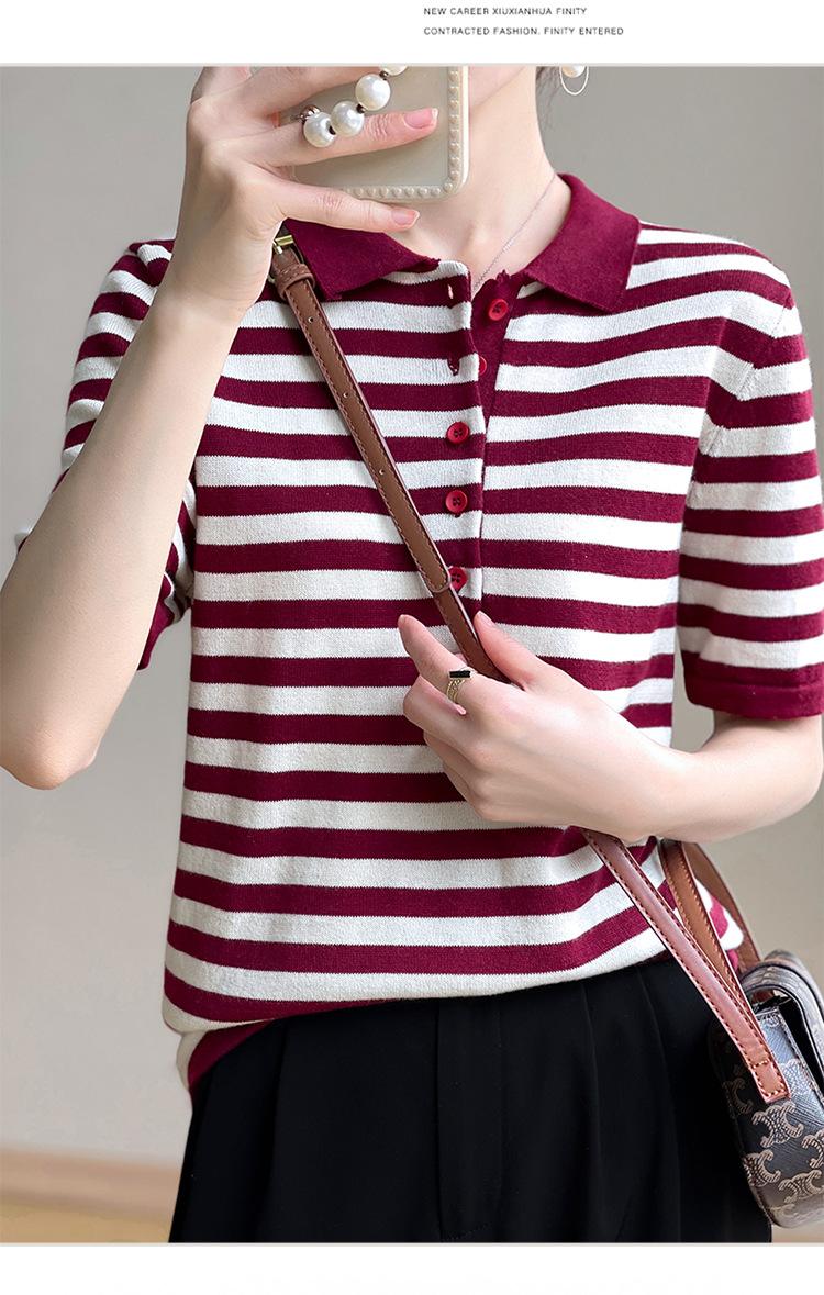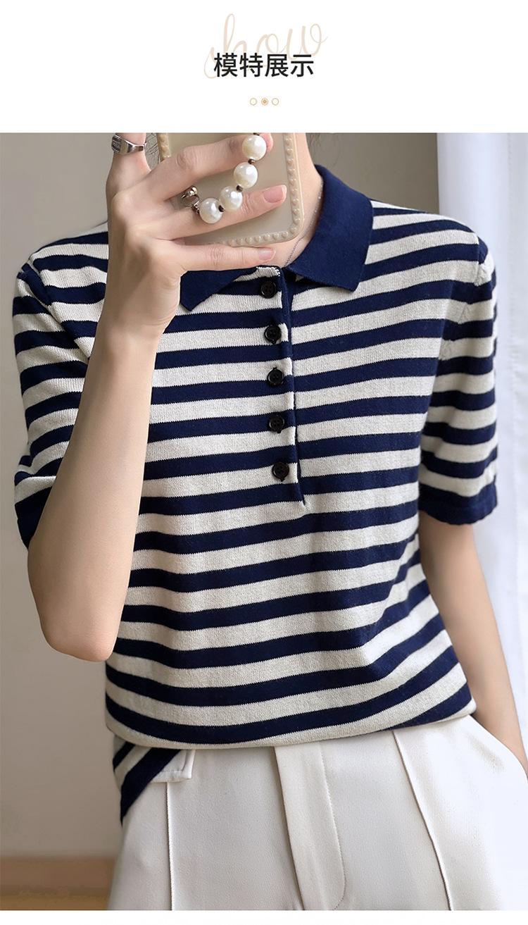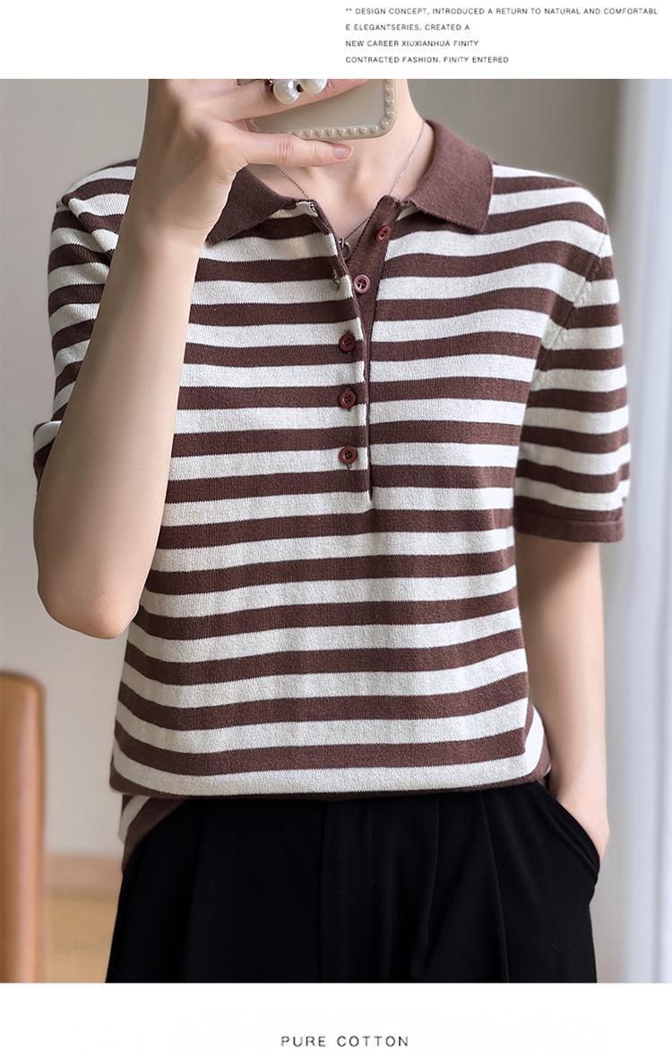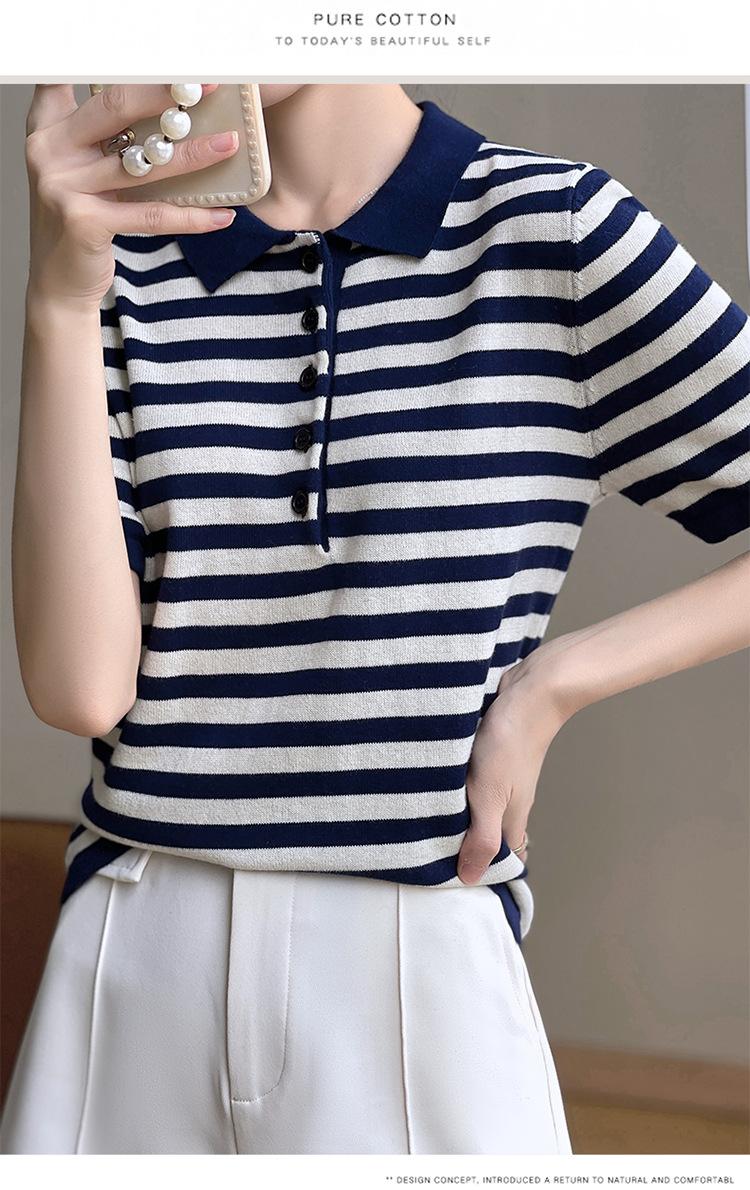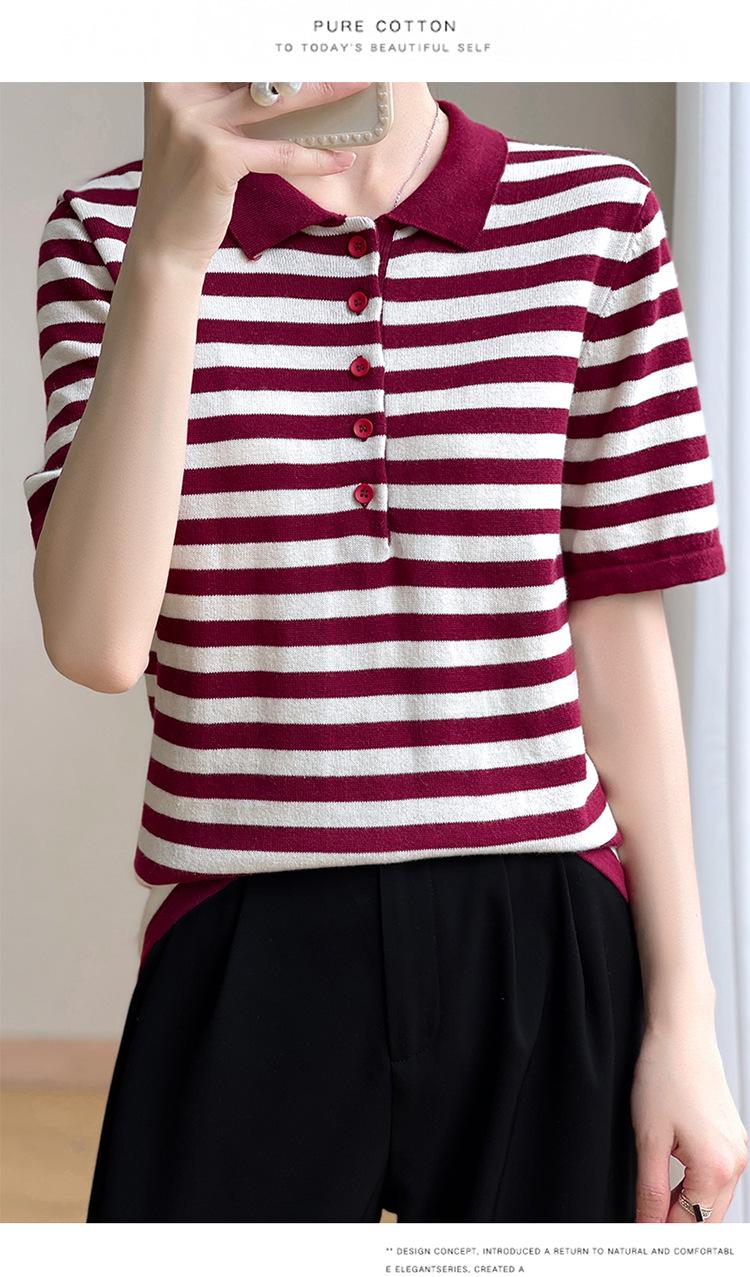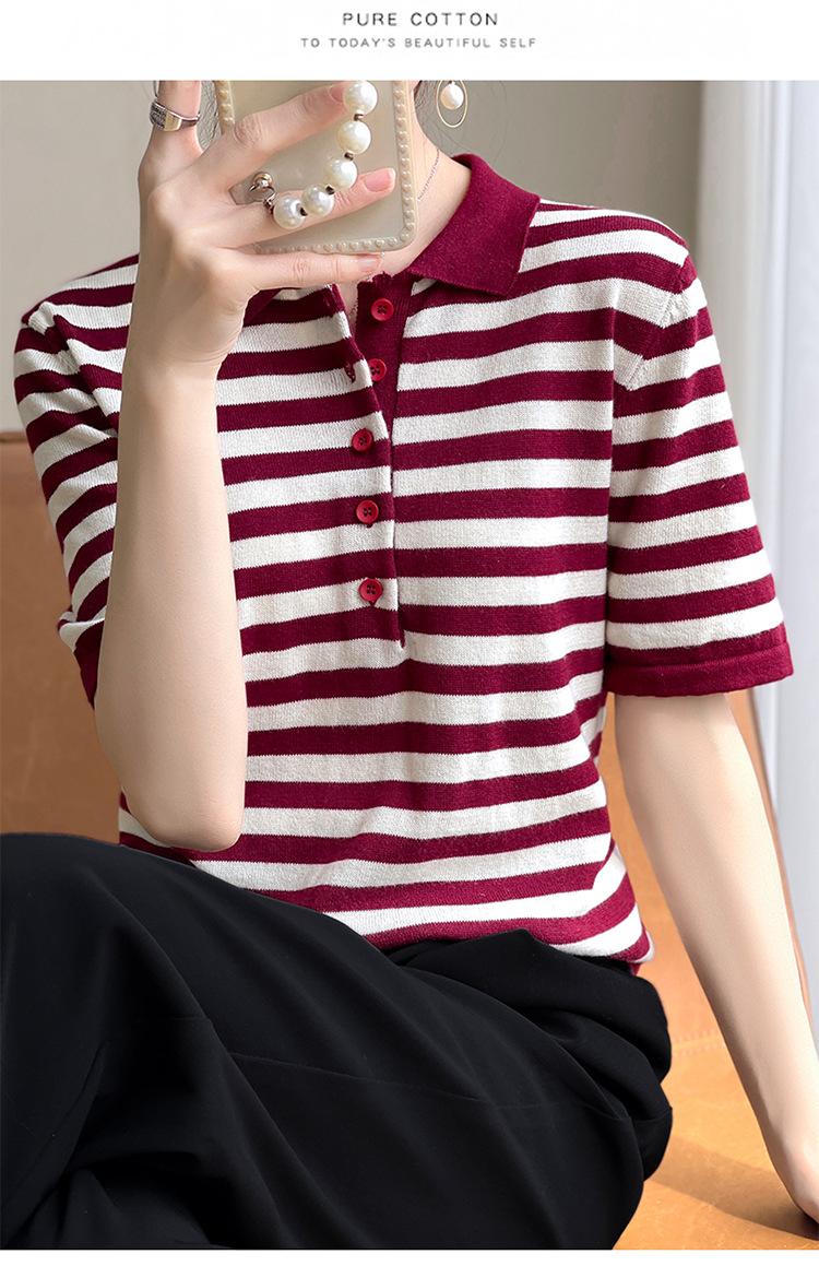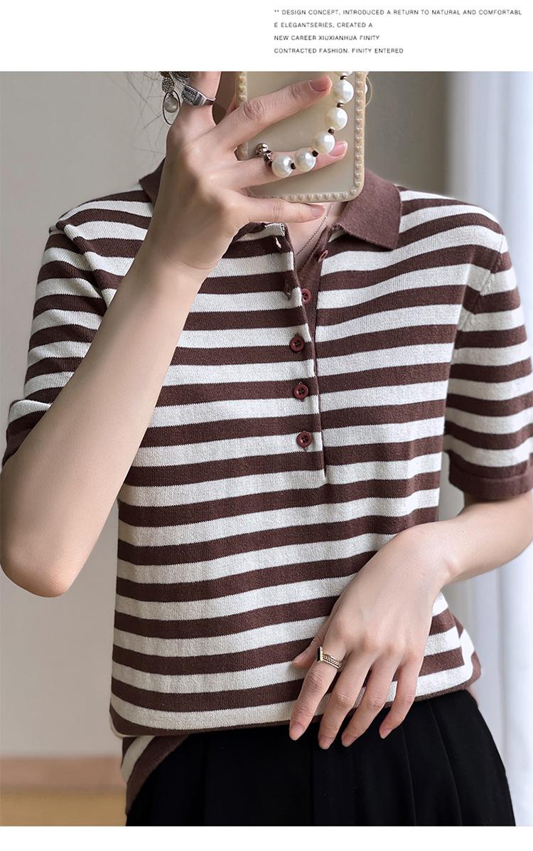 2025 Nuevo Verano Algodón Puro Polo Cuello Tejido Camiseta de Manga Corta para Mujer Simple a Rayas con Bloques de Color Camiseta Básica