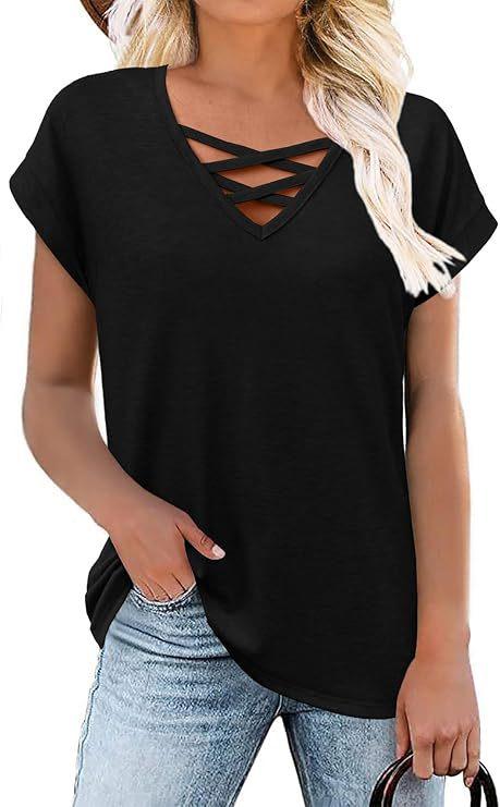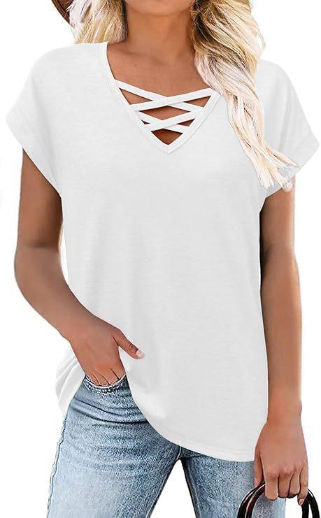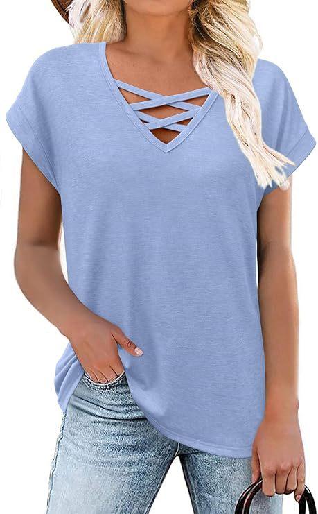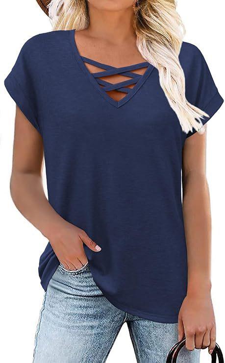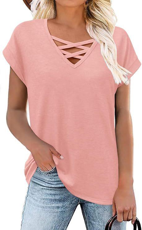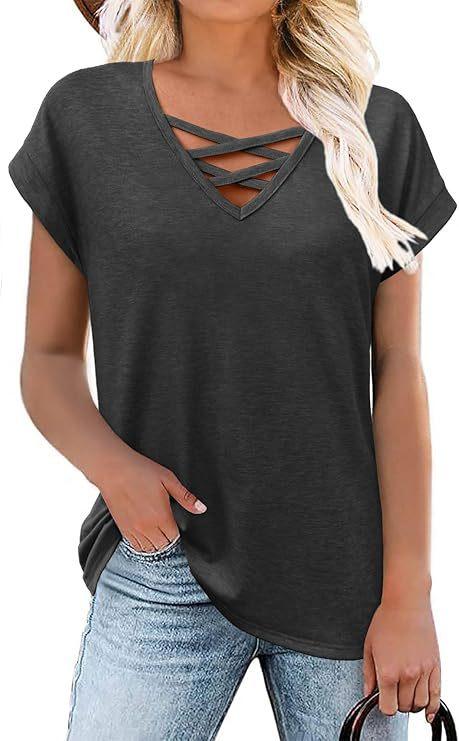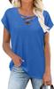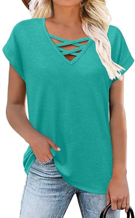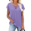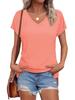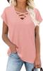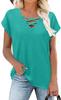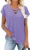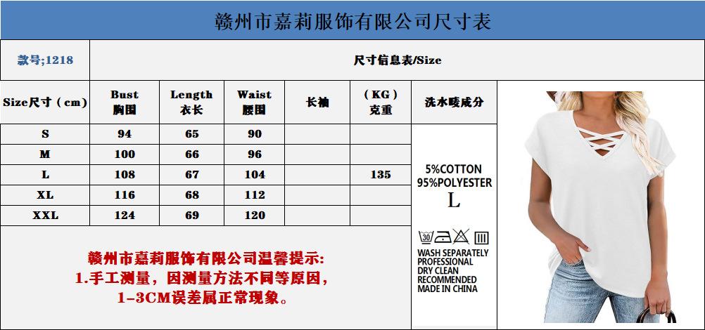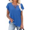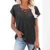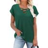 2025 Europeo y Americano Transfronterizo Nuevo Verano para Mujer Casual Suelto Color Puro Cruz Cuello en V Camiseta de Manga Corta