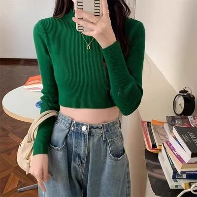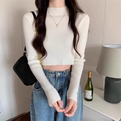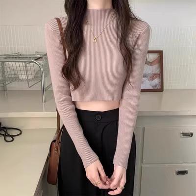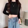 Top de Punto Corto para Mujer Ajustado Crop Top Estilo Otoño Primavera Cuello Semi Alto Capa Base Ropa Interior Hombro Recto Chica Picante Camiseta de Manga Larga