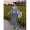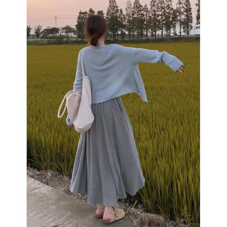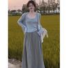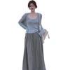 Otoño e invierno usar tirantes engrosados que reducen la edad encaje suave conjunto completo de tres piezas falda midi chaleco con cárdigan estilo tejido