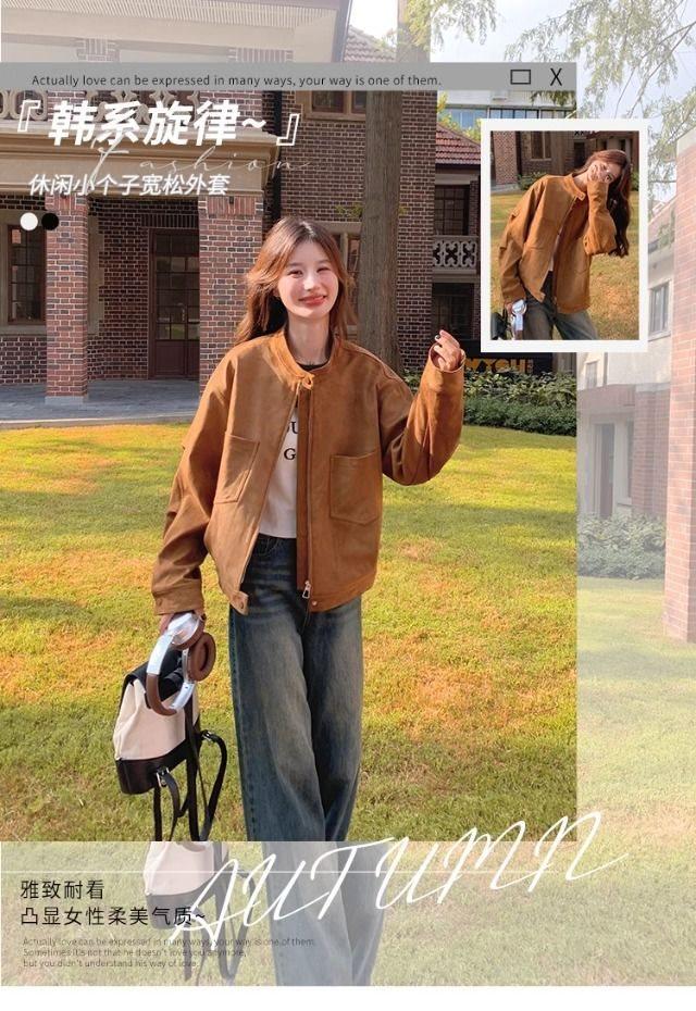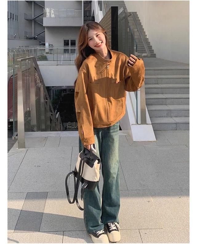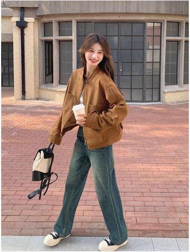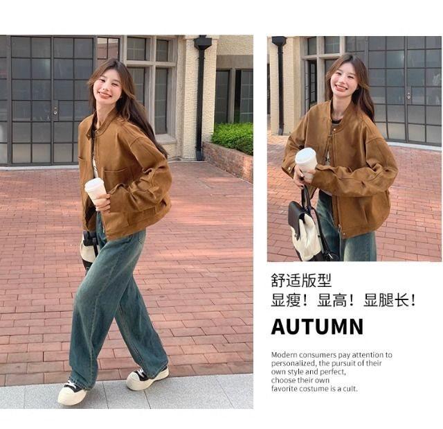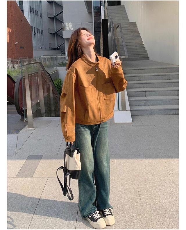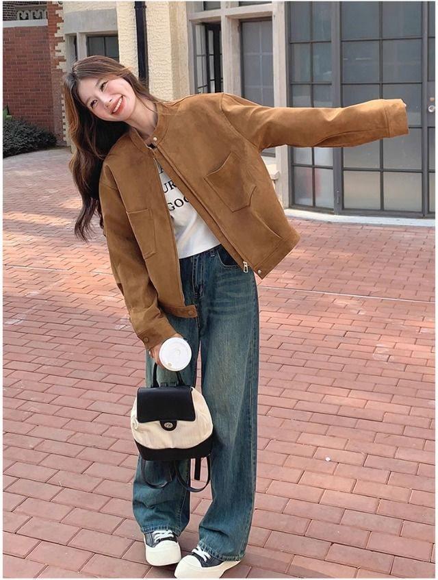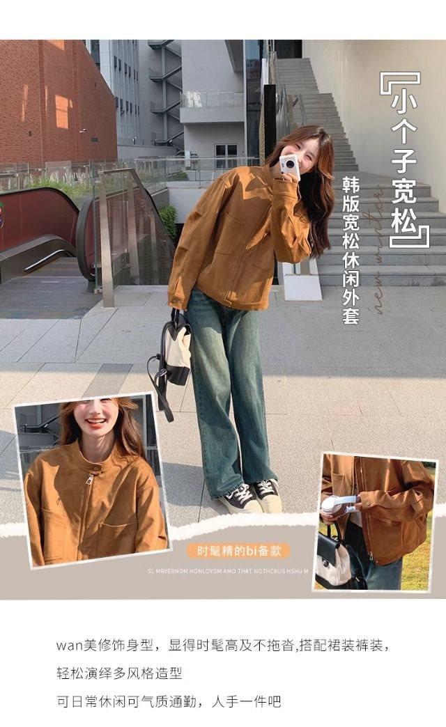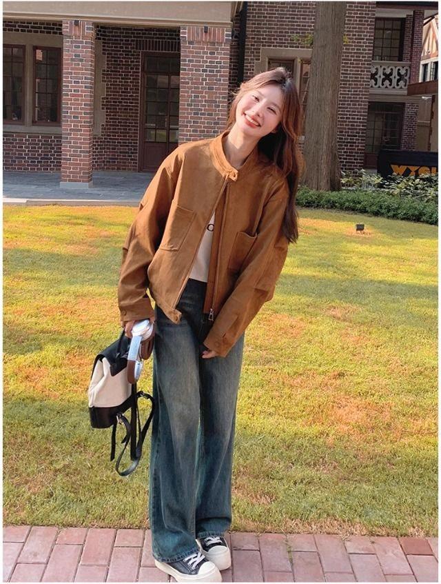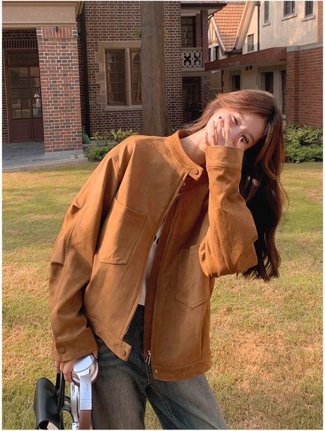 Maillard Chaqueta Marrón Mujer Gamuza Primavera Otoño Nuevo Estilo Coreano Suelta Casual Versátil Top Cuello Alto Marea