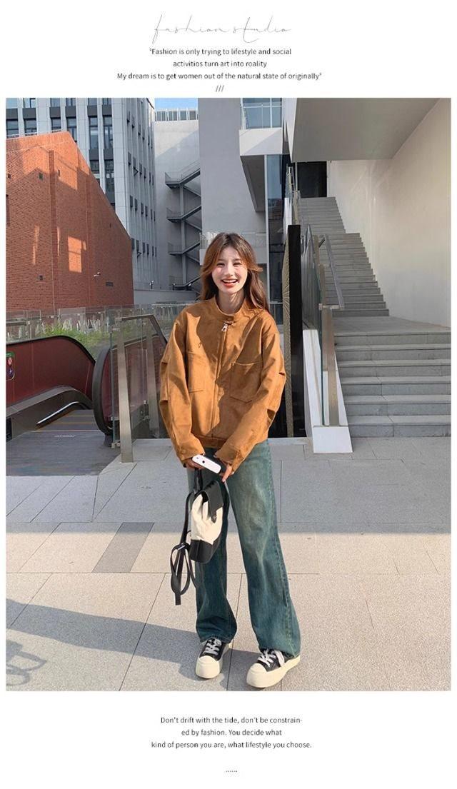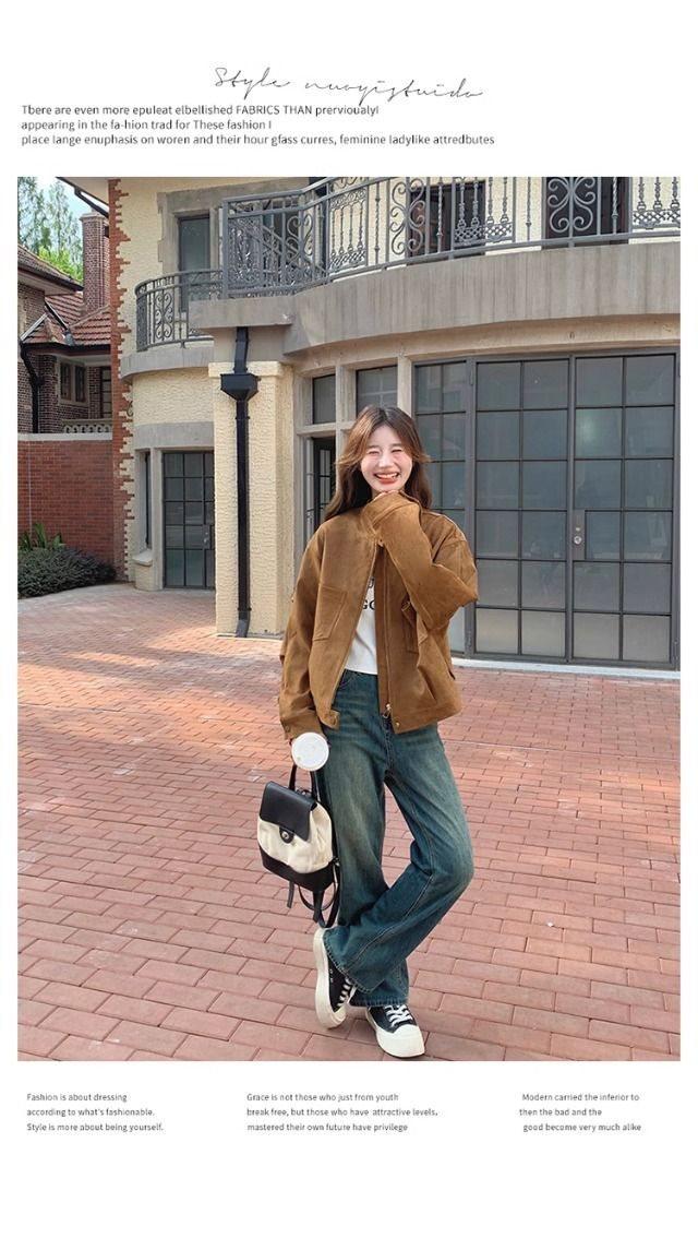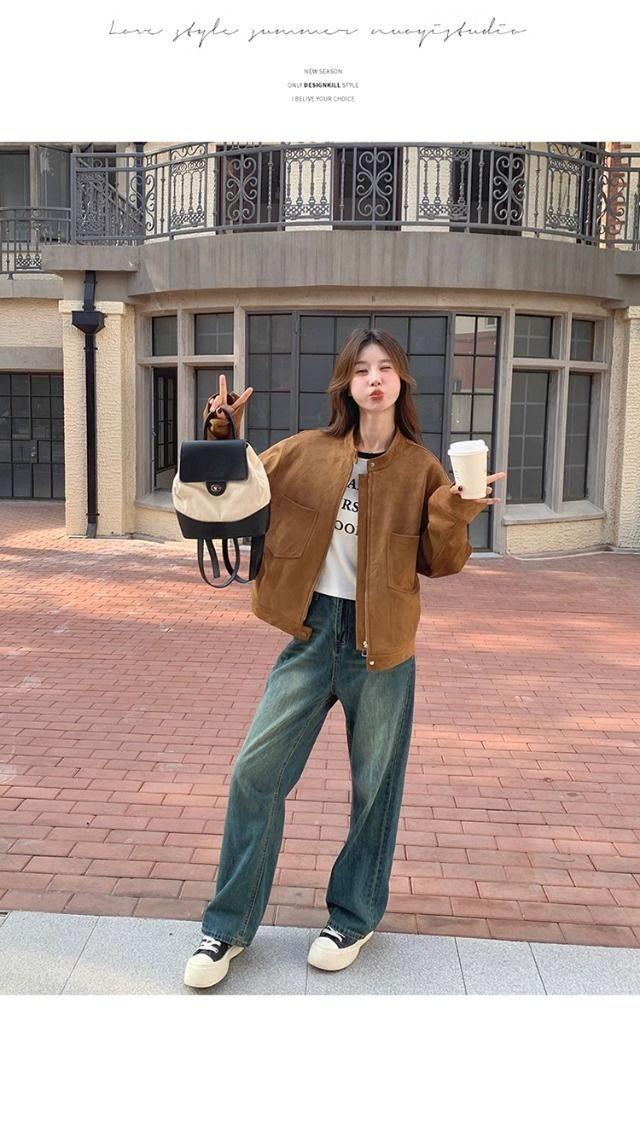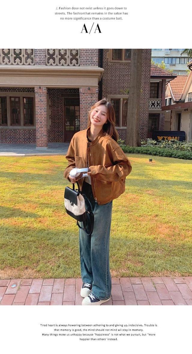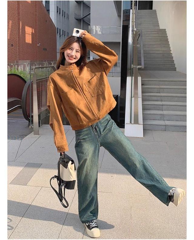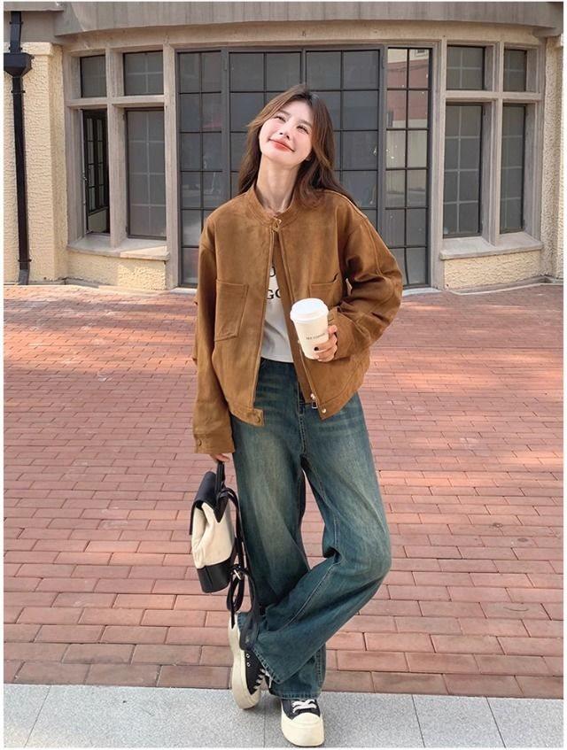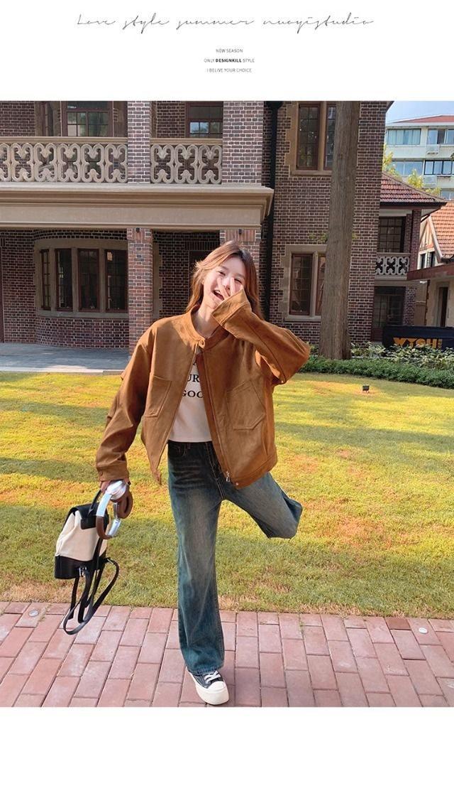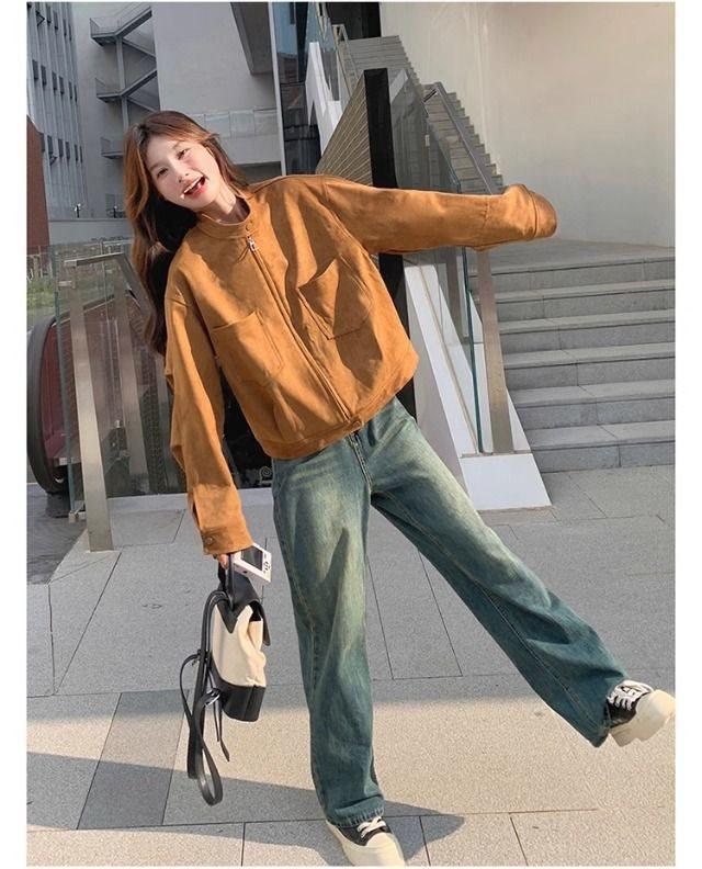 Maillard Chaqueta Marrón Mujer Gamuza Primavera Otoño Nuevo Estilo Coreano Suelta Casual Versátil Top Cuello Alto Marea