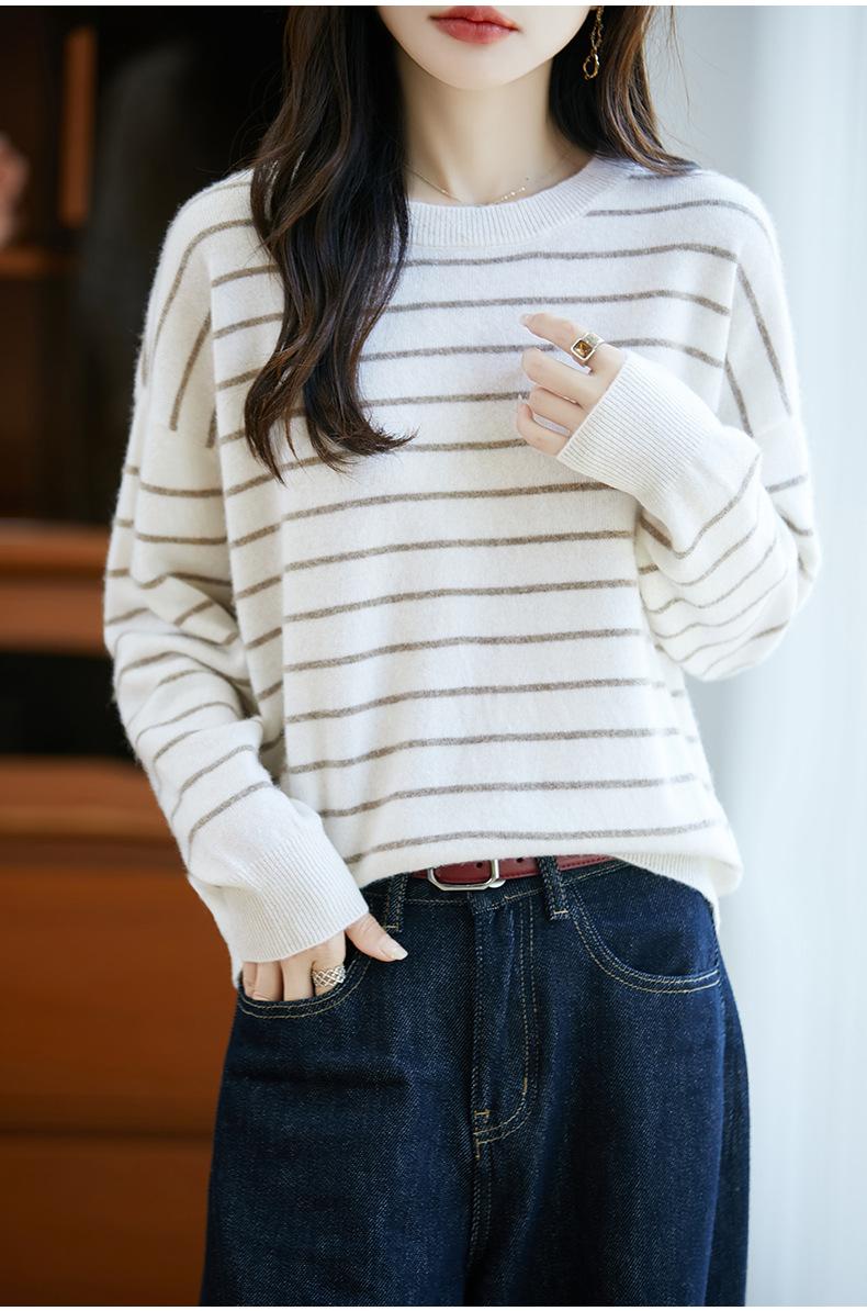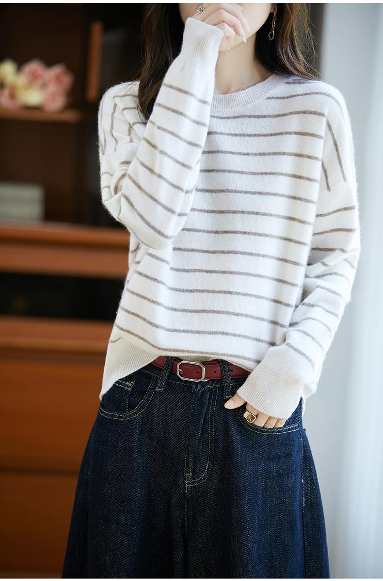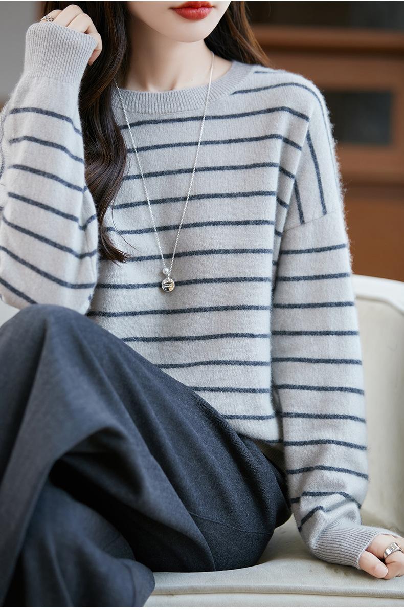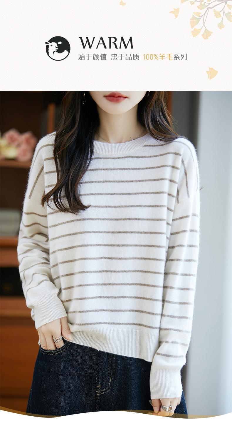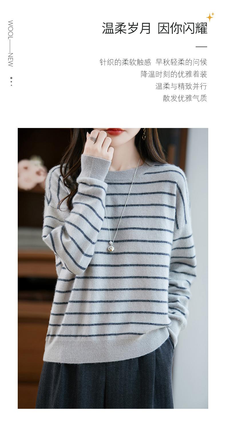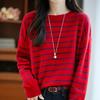 Suéter 100% Lana Pura Estilo Coreano Holgado 2025 Nuevo Cuello Redondo Bloque de Color a Rayas Manga Caída Suéter Básico