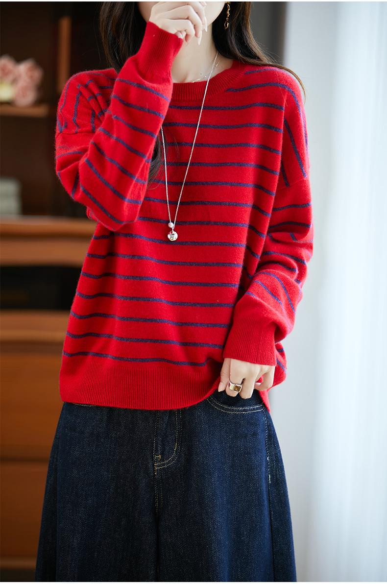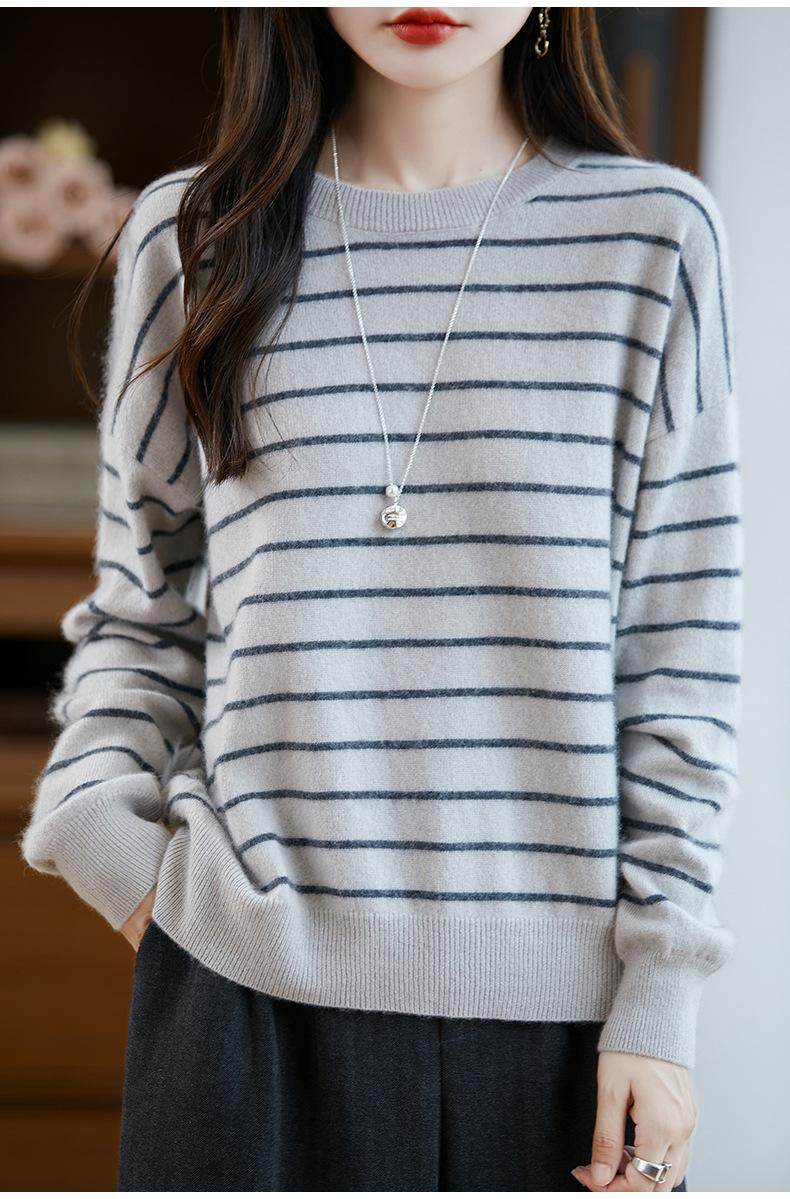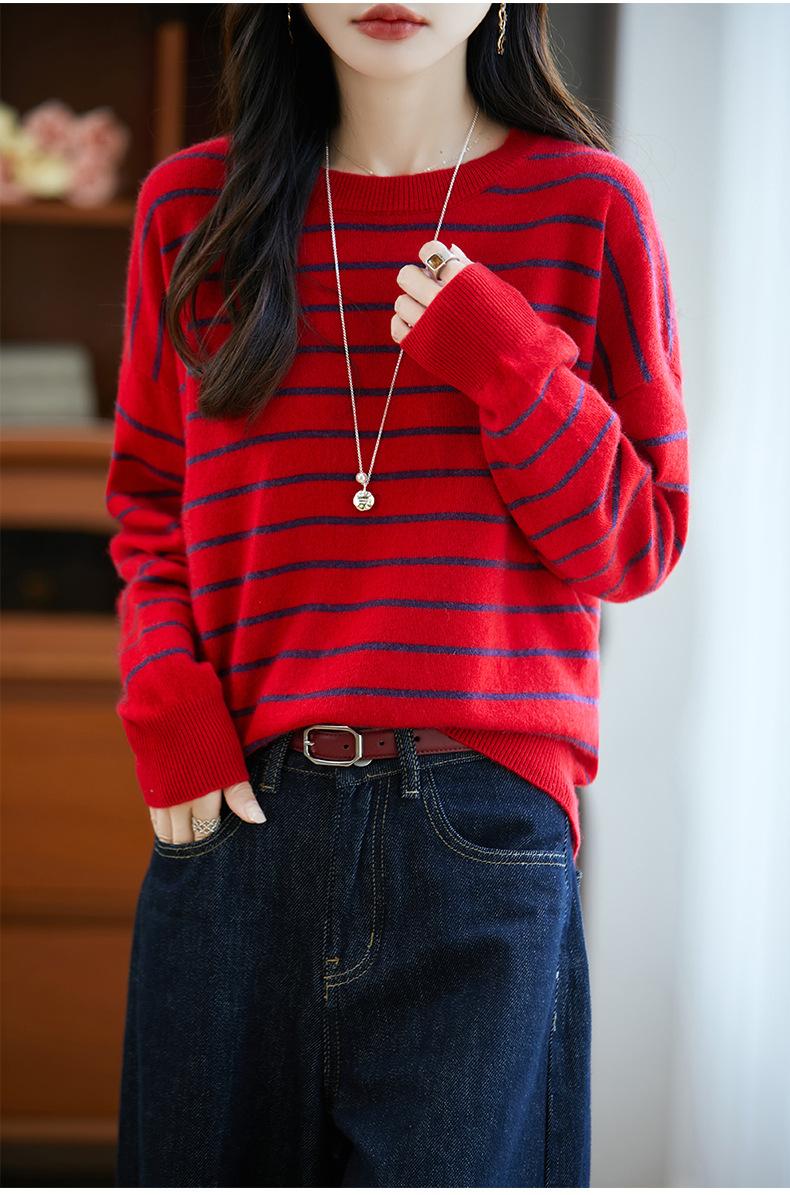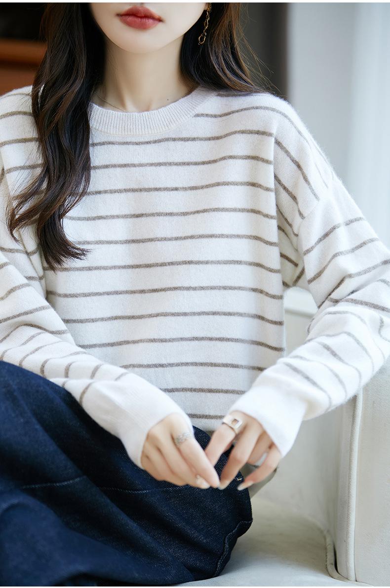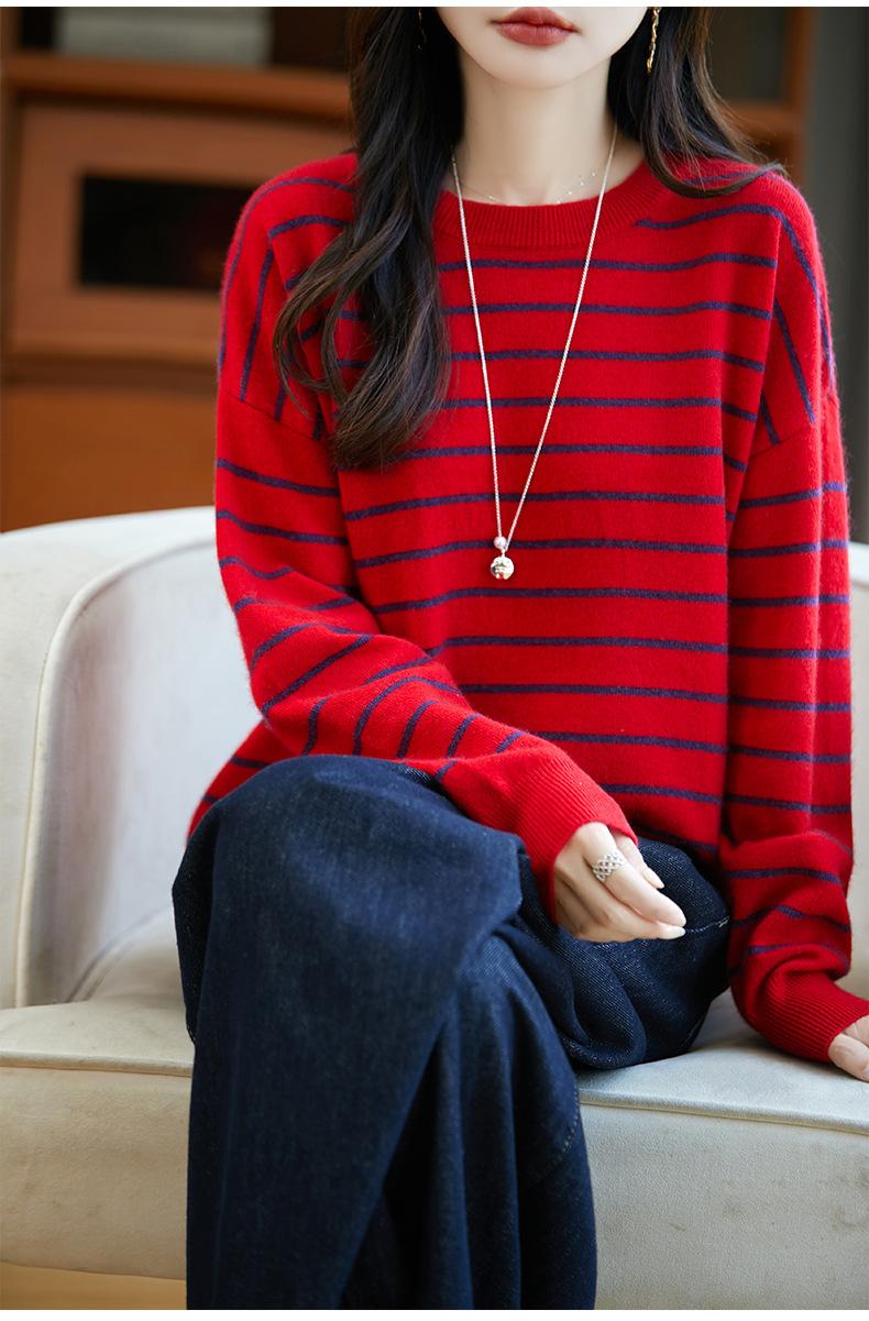 Suéter 100% Lana Pura Estilo Coreano Holgado 2025 Nuevo Cuello Redondo Bloque de Color a Rayas Manga Caída Suéter Básico