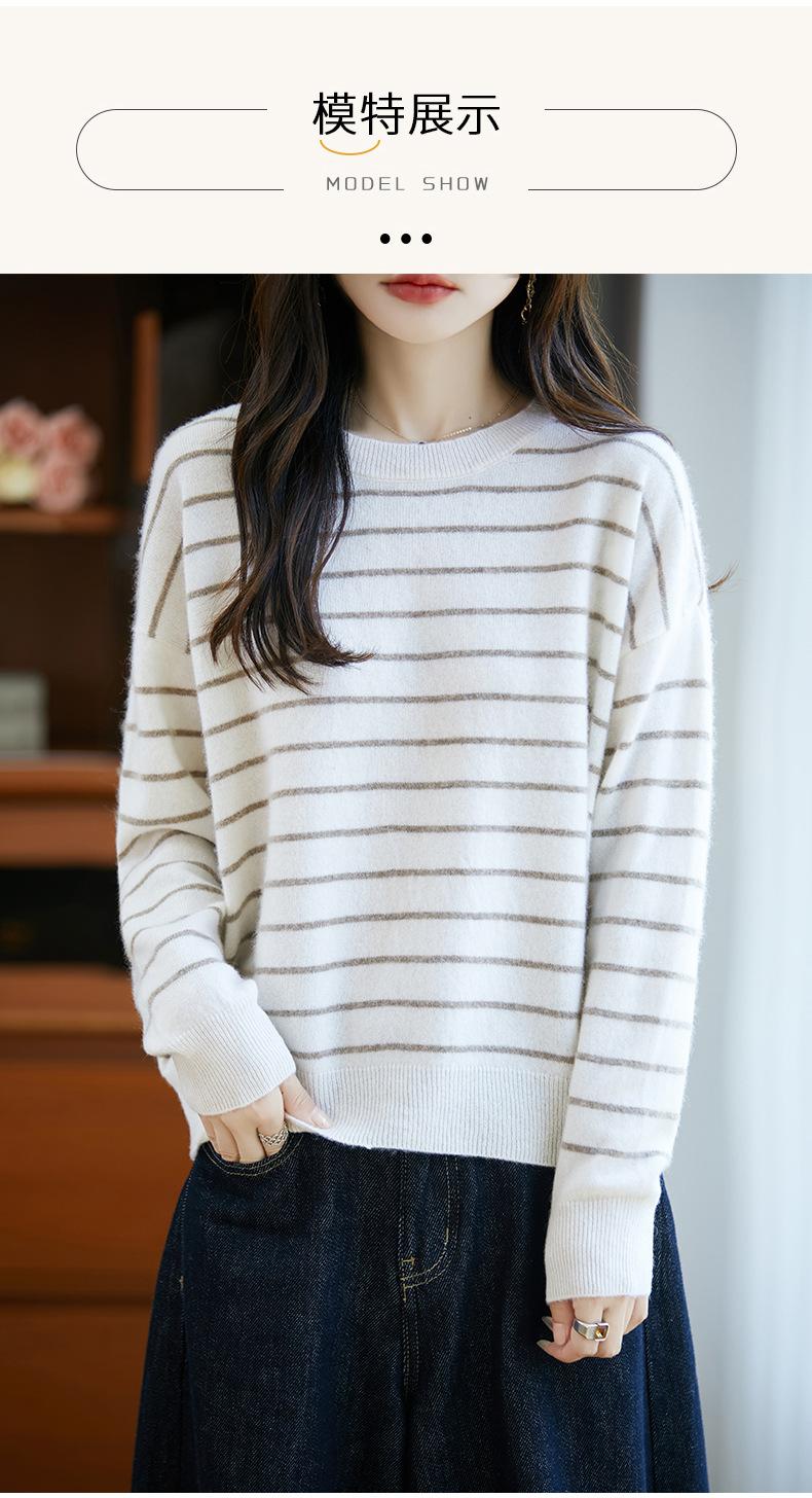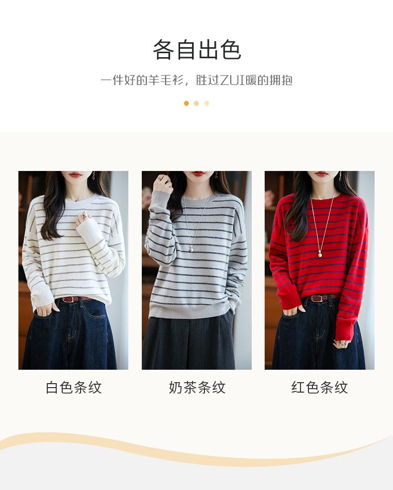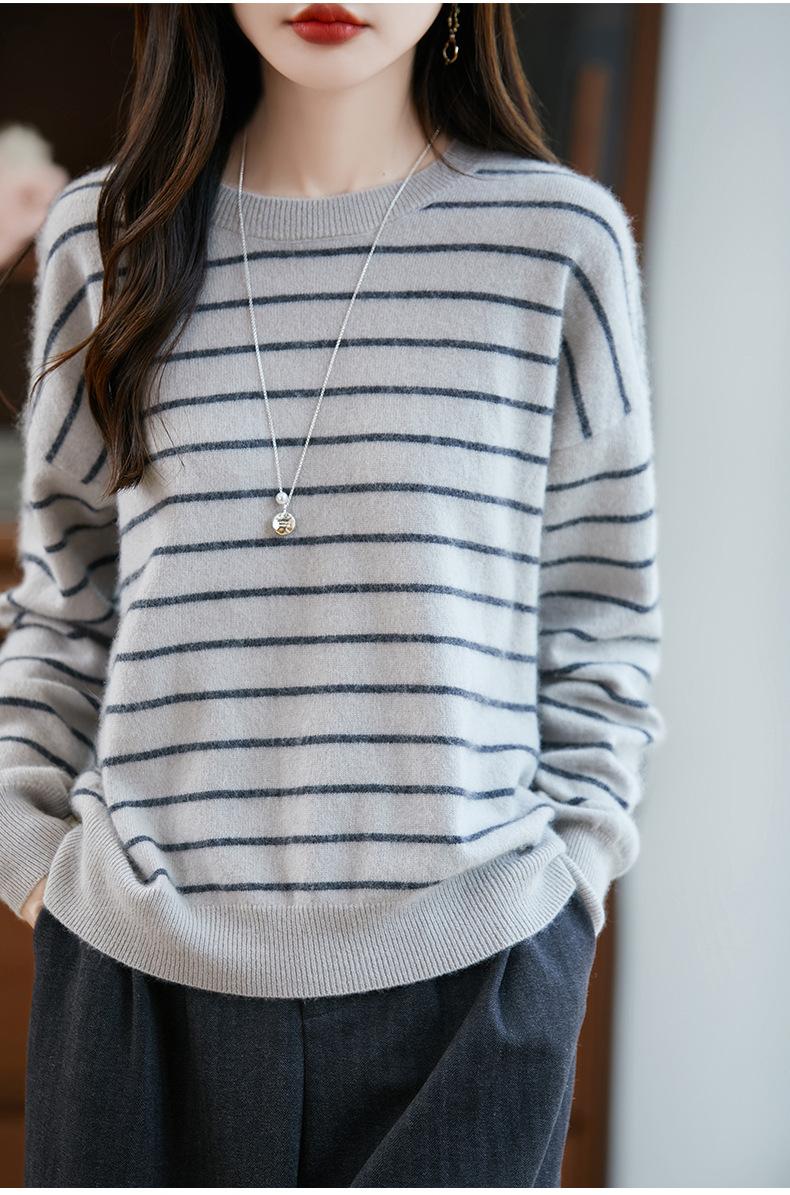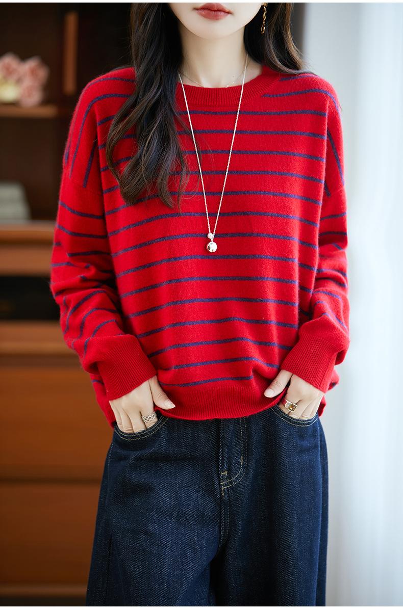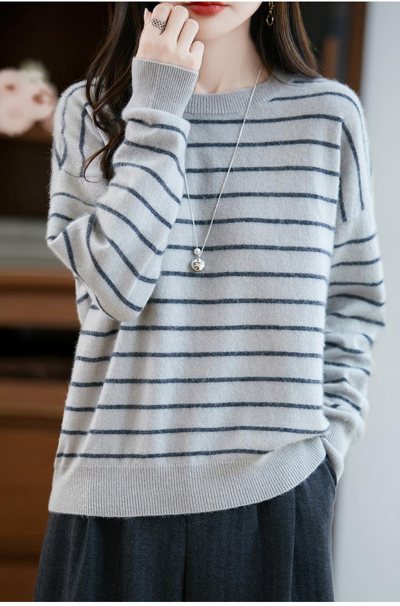 Suéter 100% Lana Pura Estilo Coreano Holgado 2025 Nuevo Cuello Redondo Bloque de Color a Rayas Manga Caída Suéter Básico