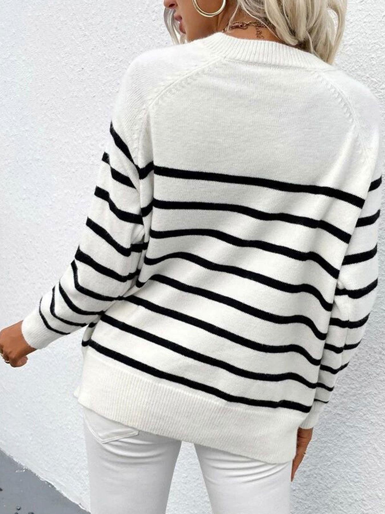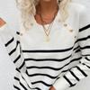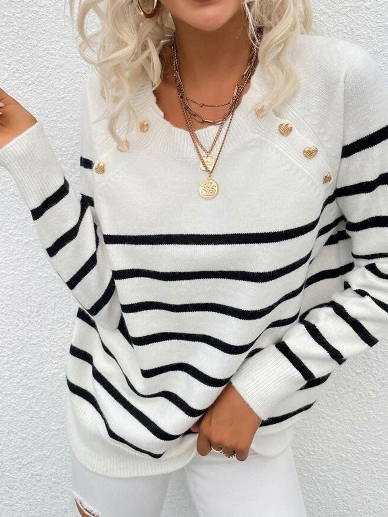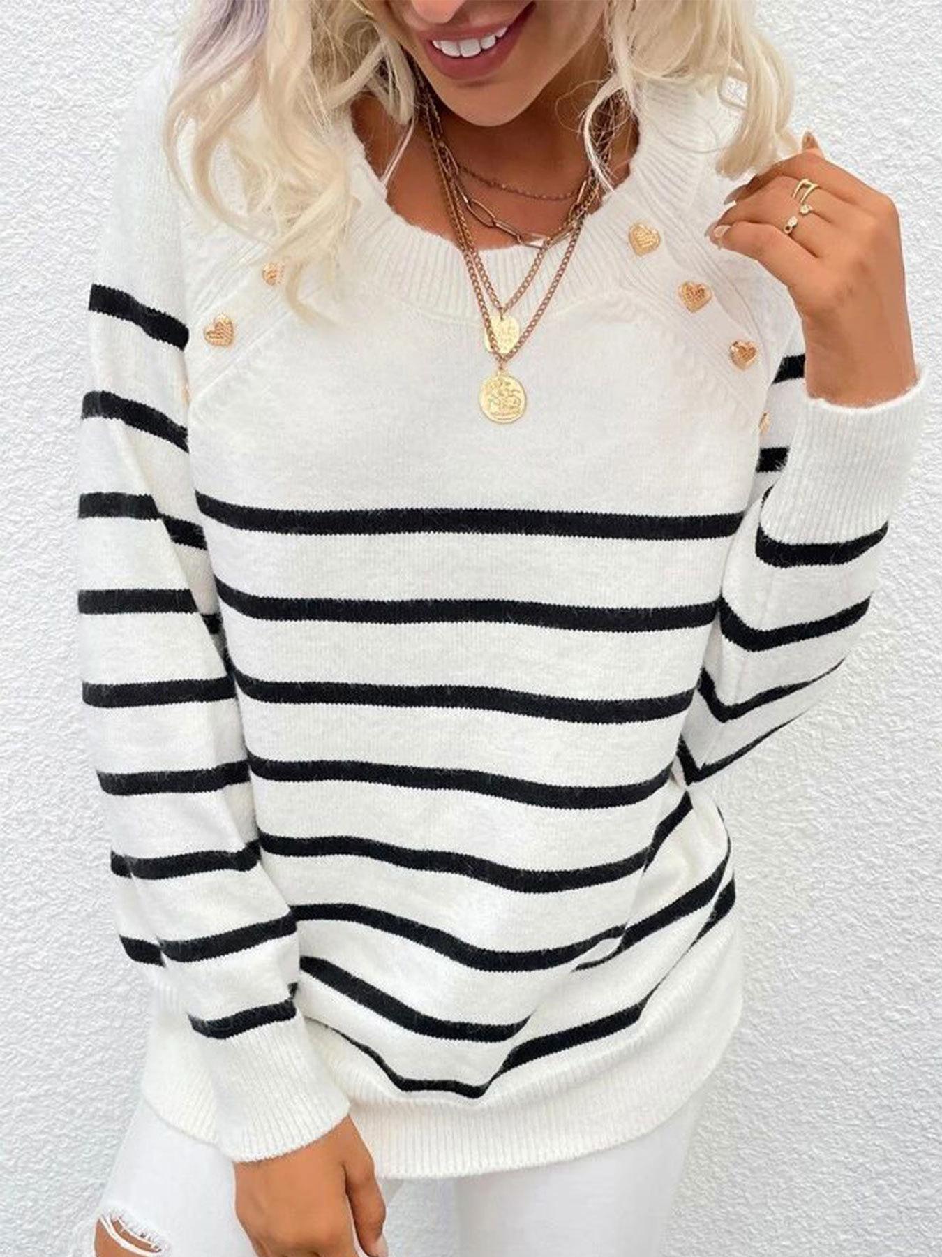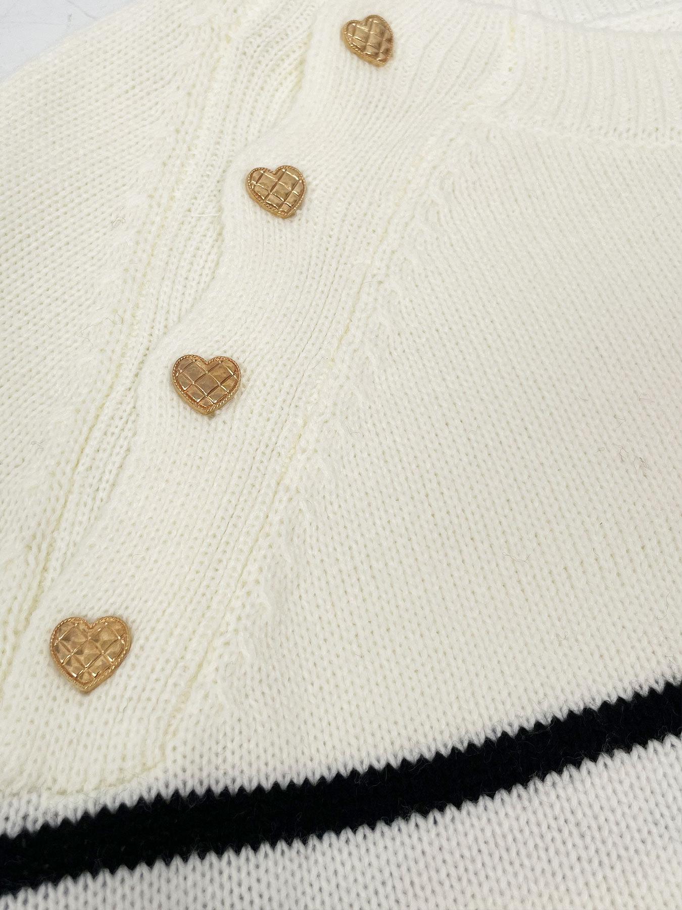 Suéter Pulóver Casual Versátil Estilo Europeo y Americano Nuevo de Punto con Contraste a Rayas Suelto con Botón de Corazón para Mujer Otoño e Invierno 2025