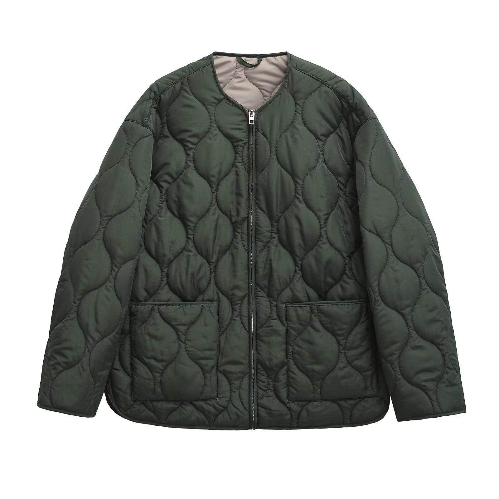 Europeo y Americano 2024 Otoño Nuevo Casual Cuello Redondo Cremallera Diamante Cuadros Cálido Bolsillo Grande Ligero Algodón Chaqueta