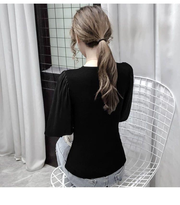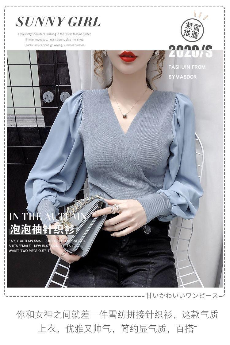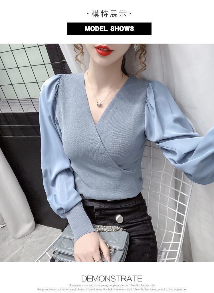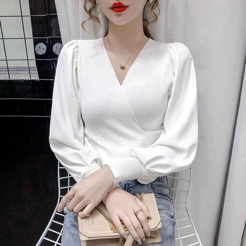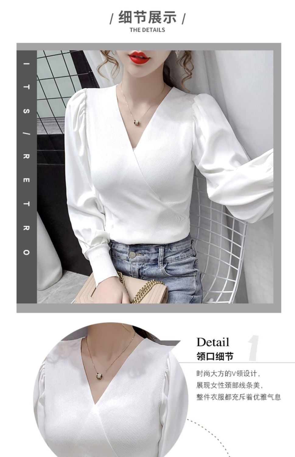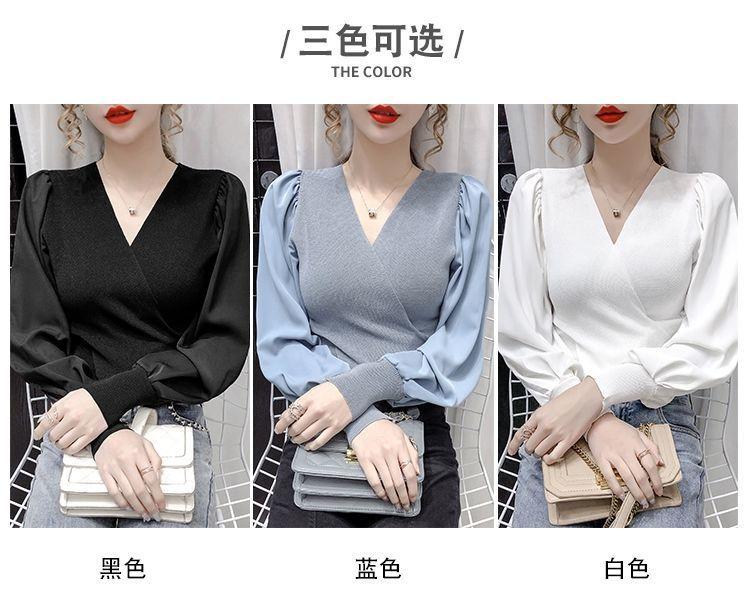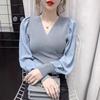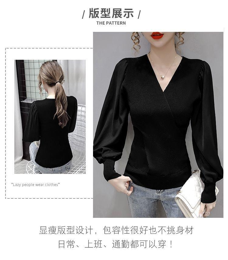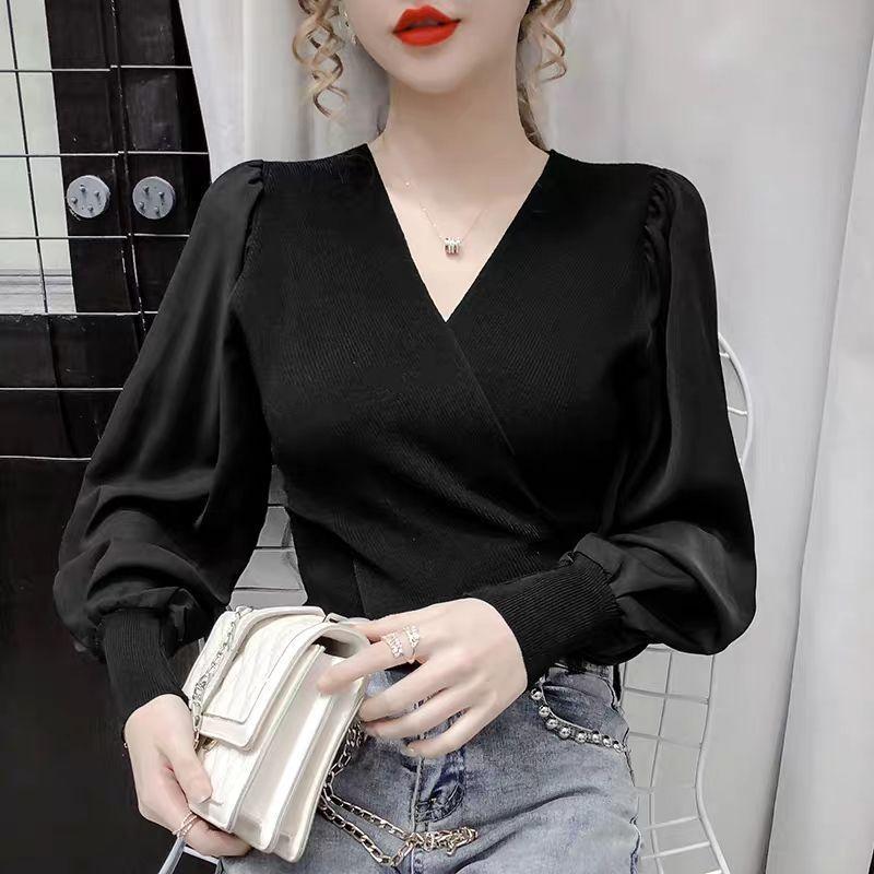 Camiseta básica de punto para mujer otoño e invierno ropa interior ropa de otoño 2025 nueva delgada cuello en V manga abullonada top de chifón camiseta de manga larga