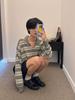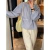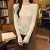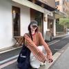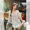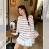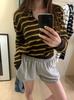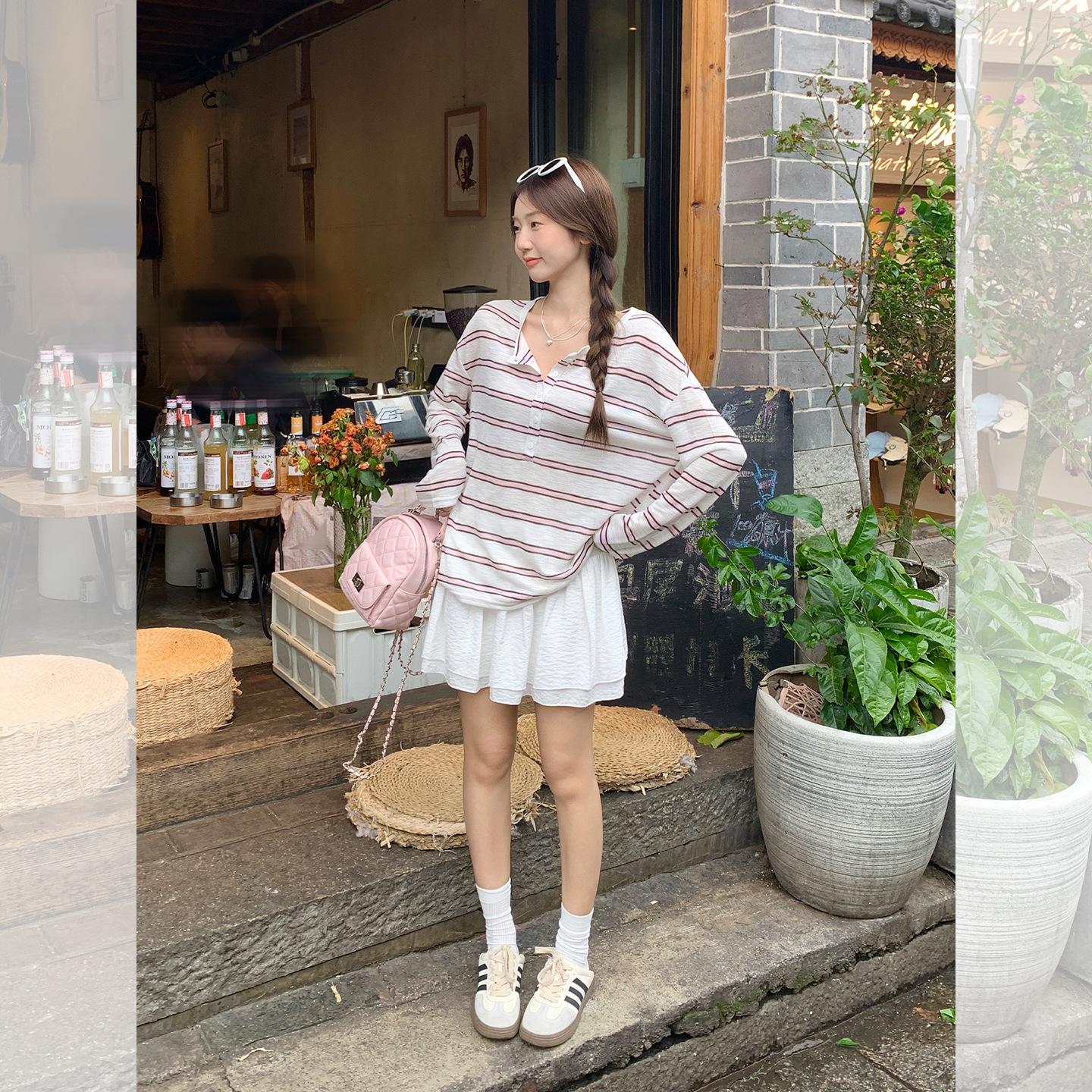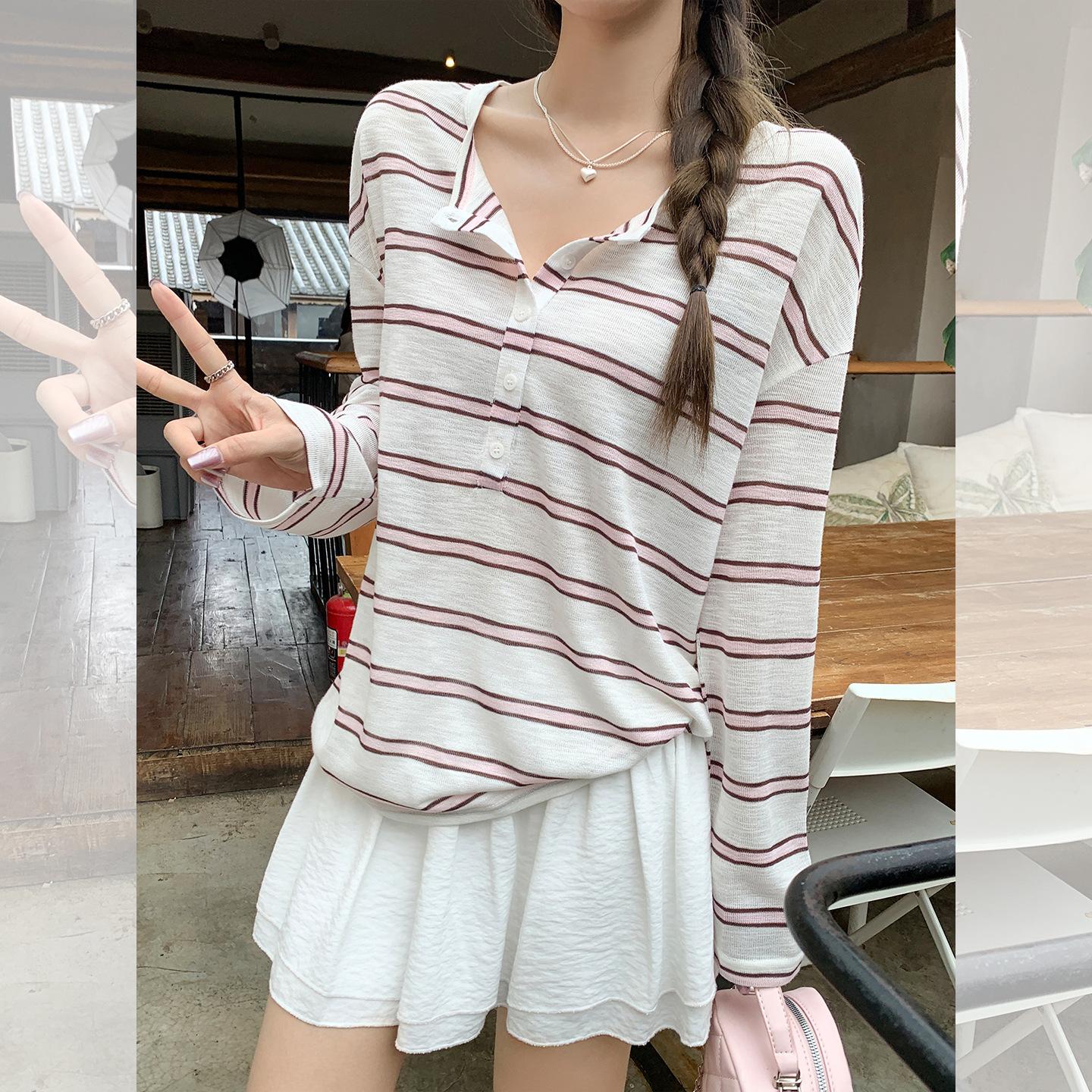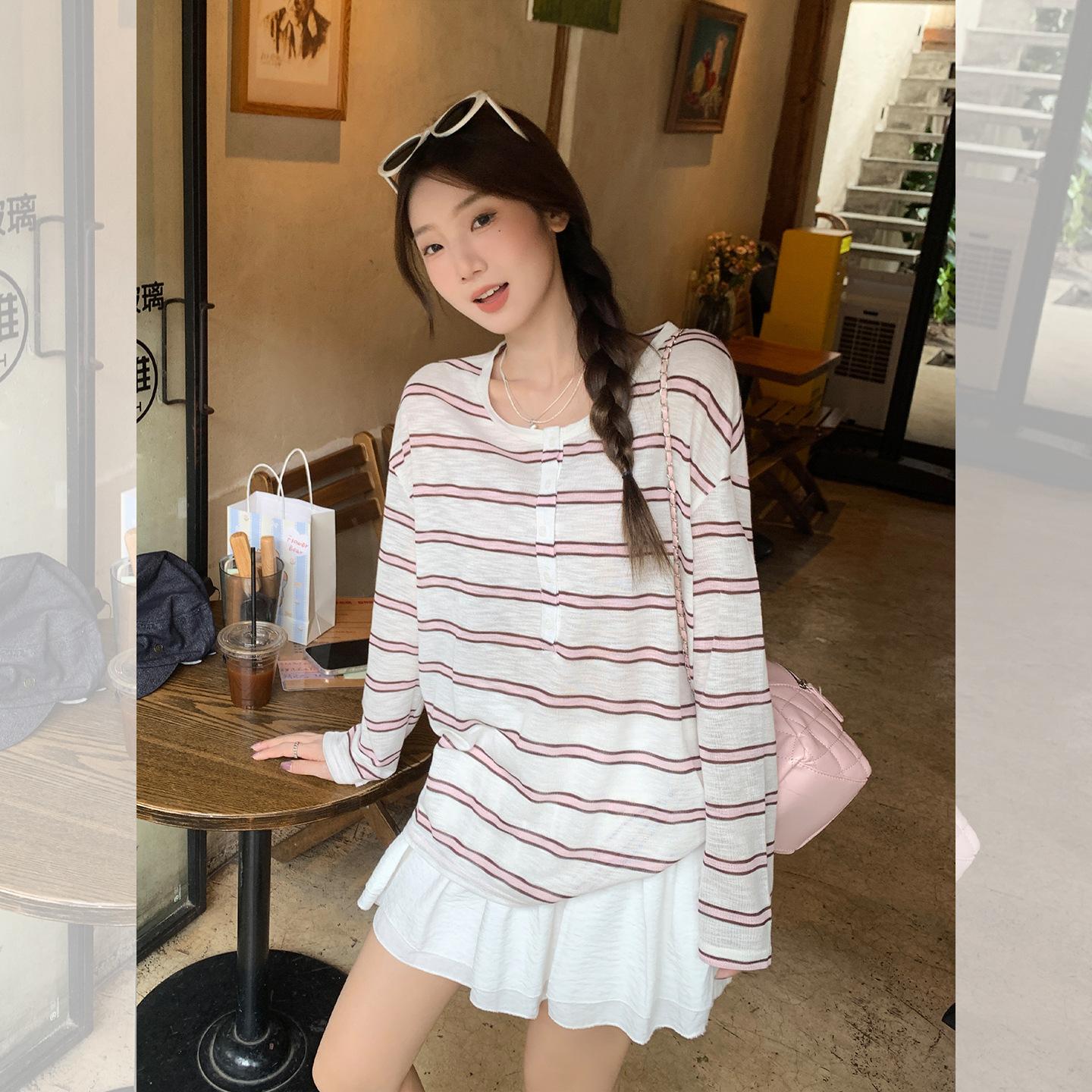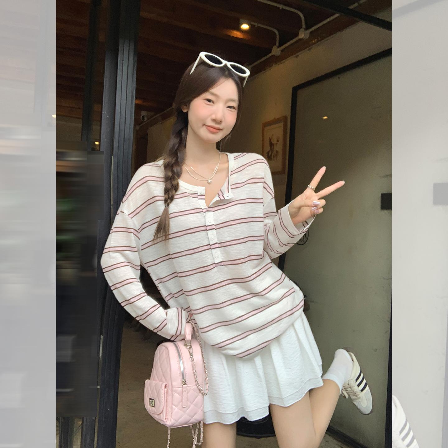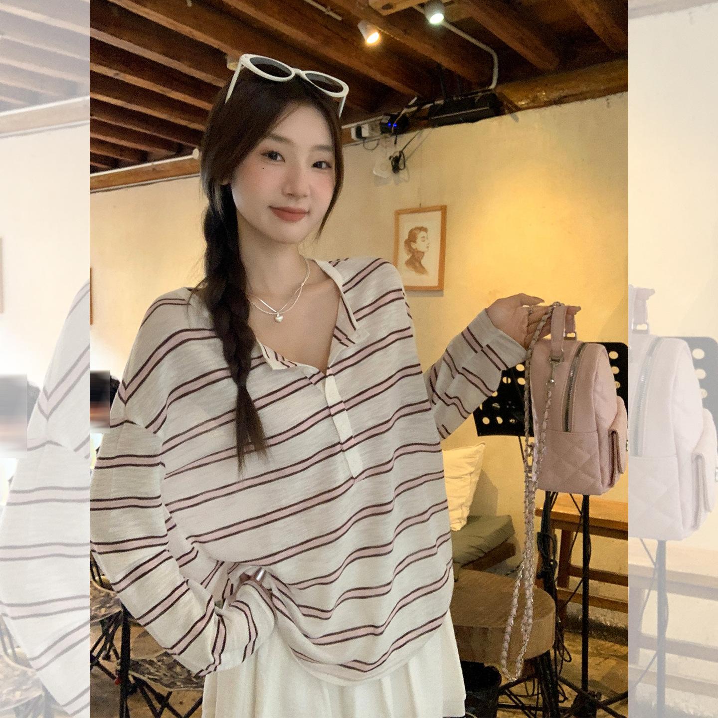 Foto real estilo coreano top de punto a rayas de manga larga mujer 2025 principios de otoño suelto holgado sentido relajado cárdigan camiseta 88200