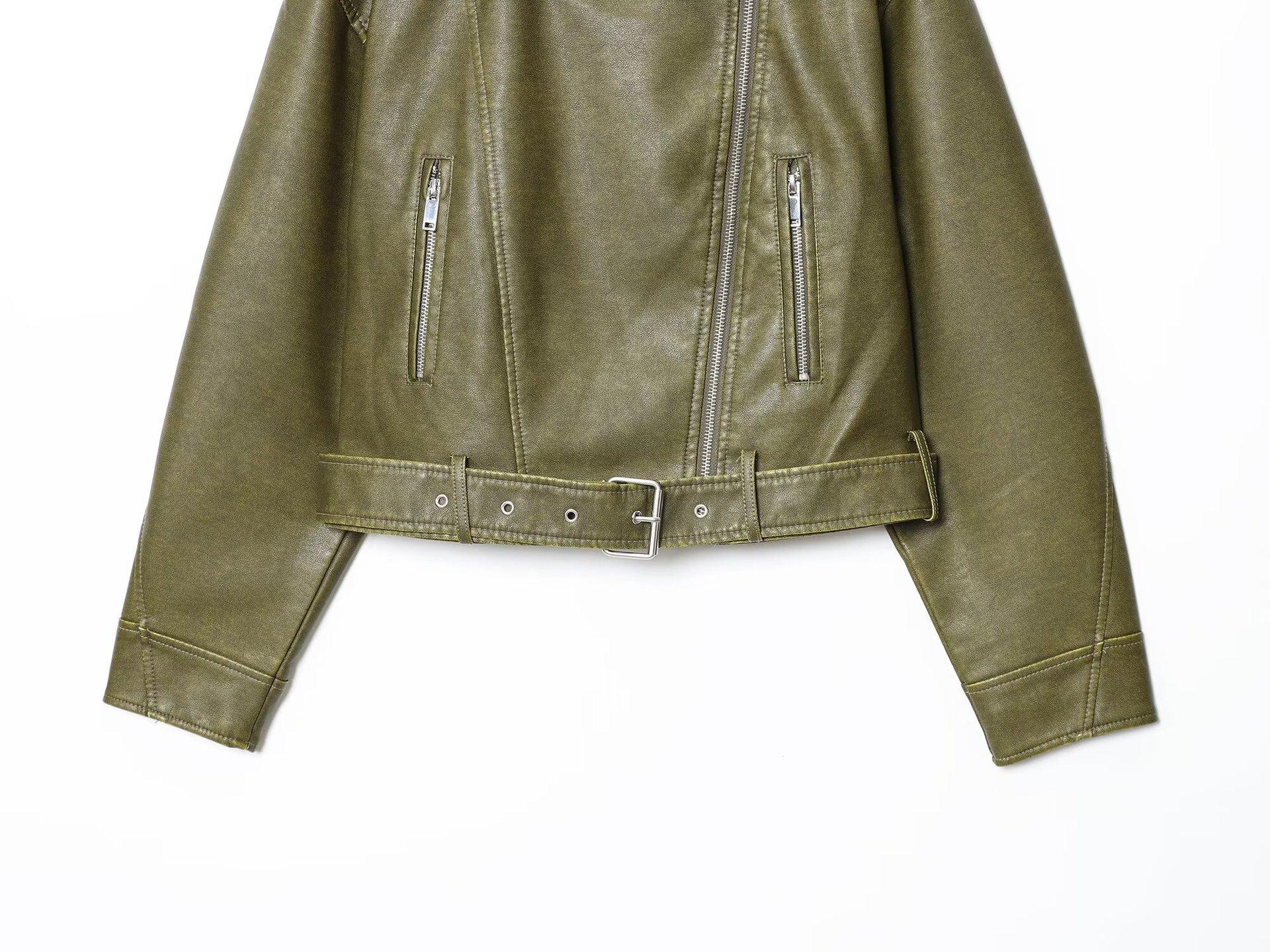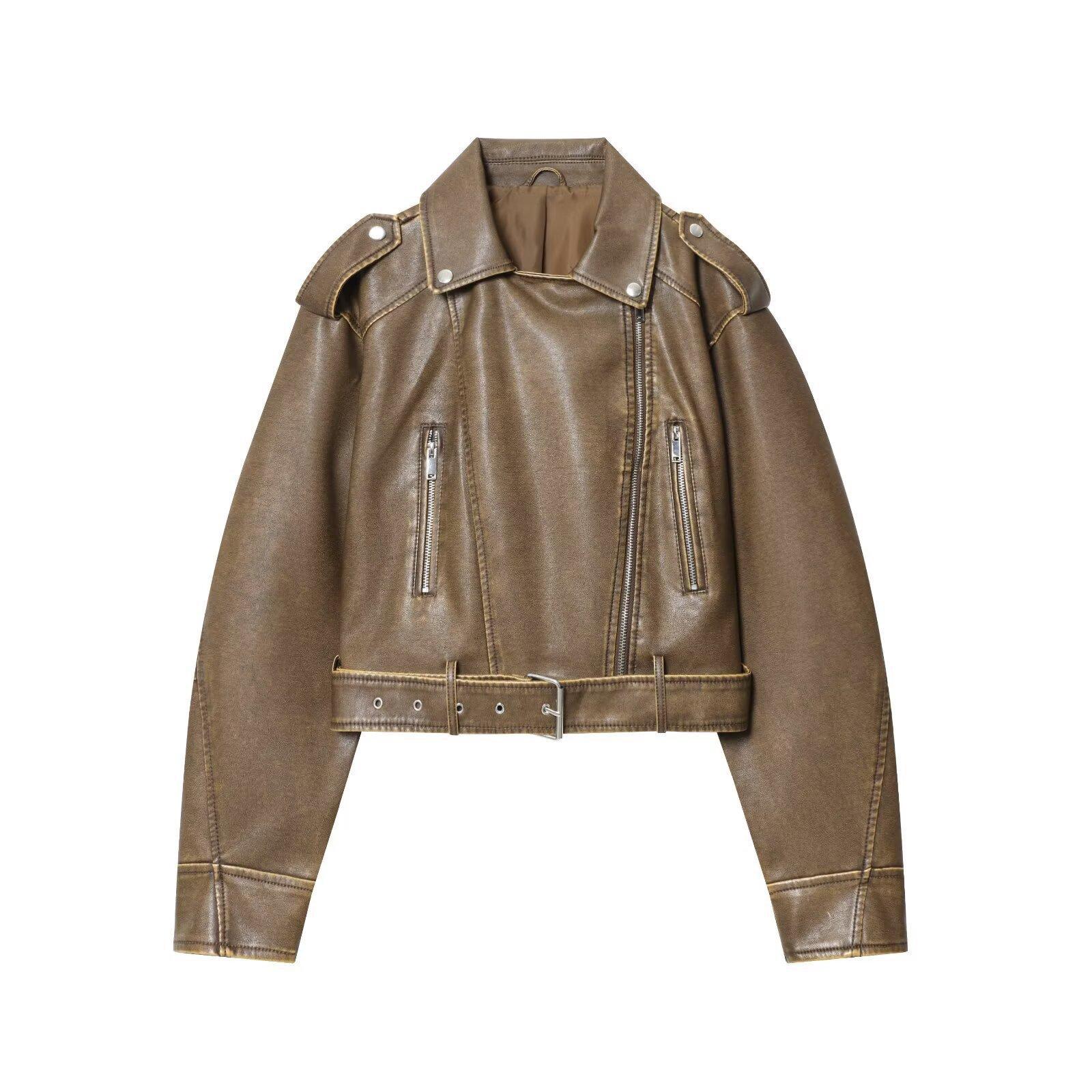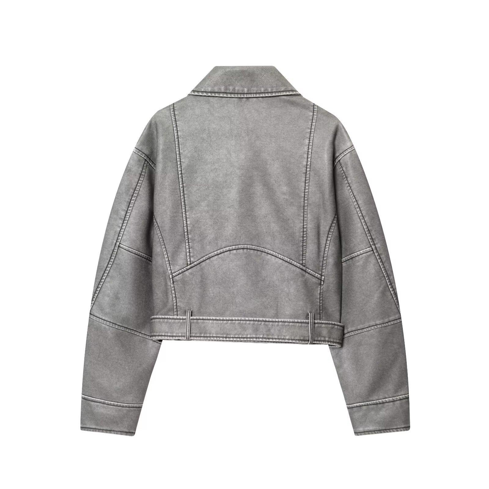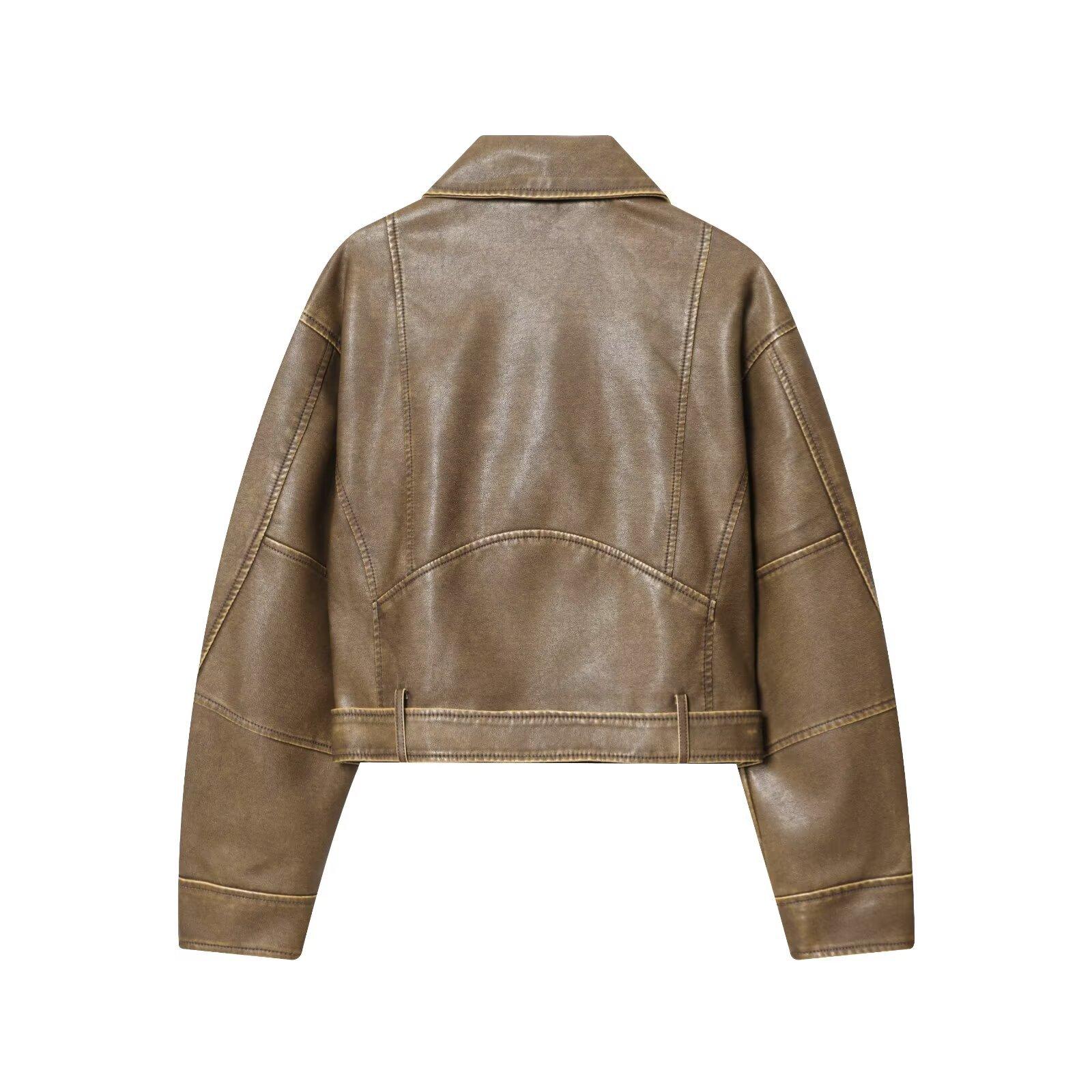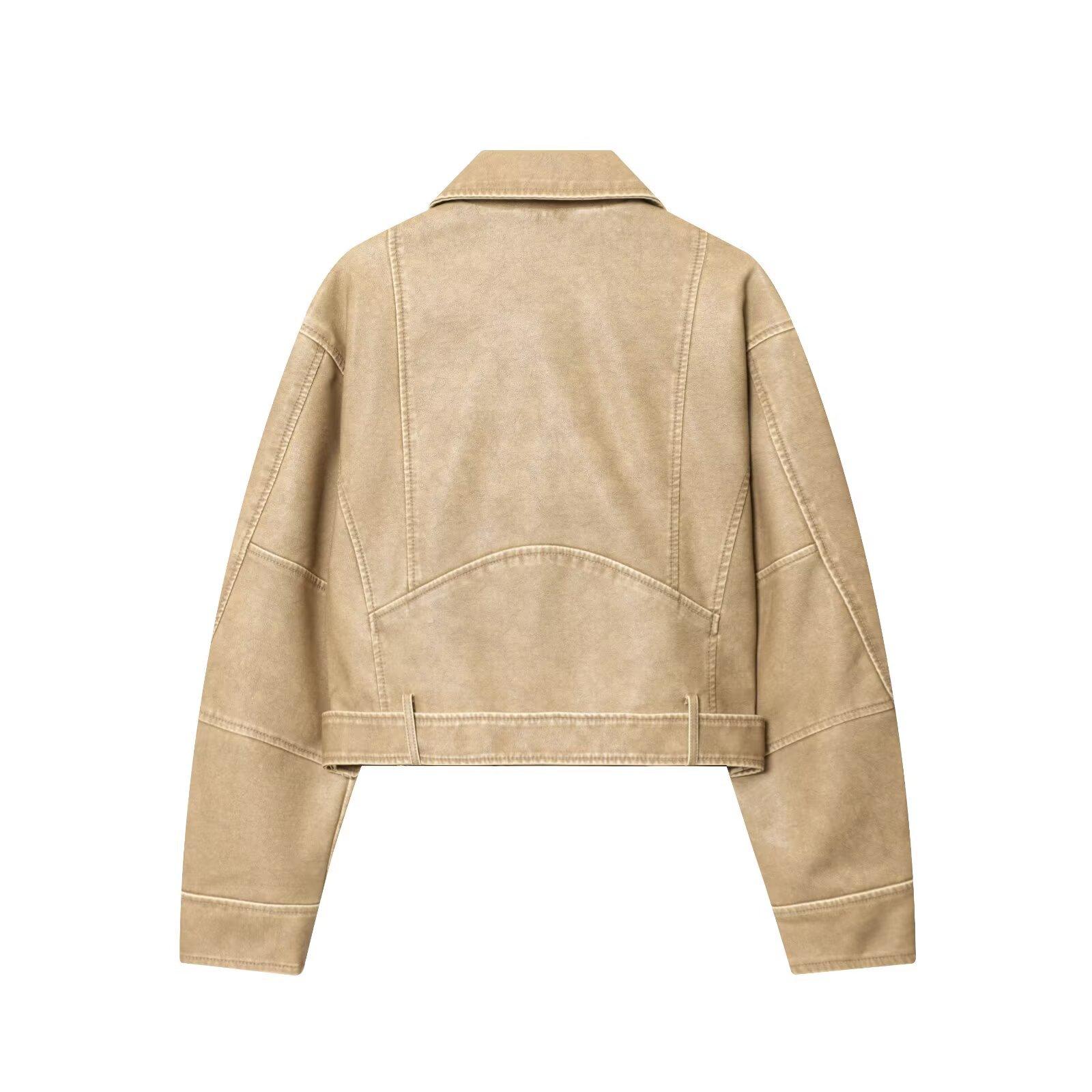 Moda Femenina Europea y Americana Transfronteriza AliExpress Chaqueta de Cuero Lavado Estilo Europeo y Americano Casual de Moda Más Vendida