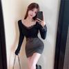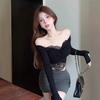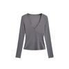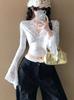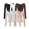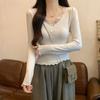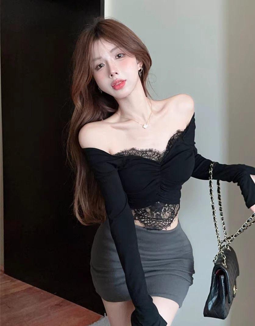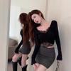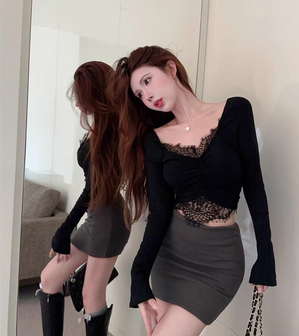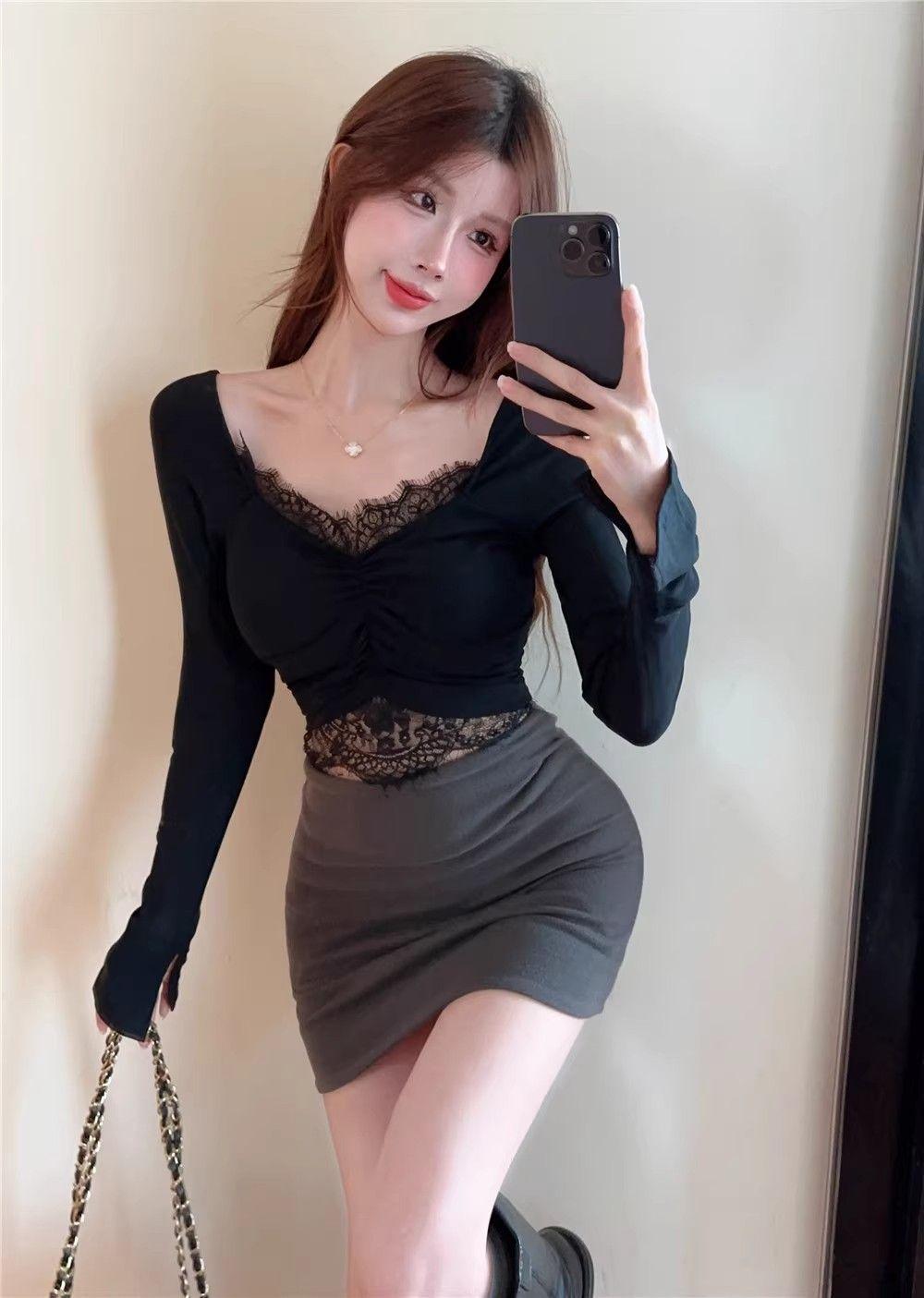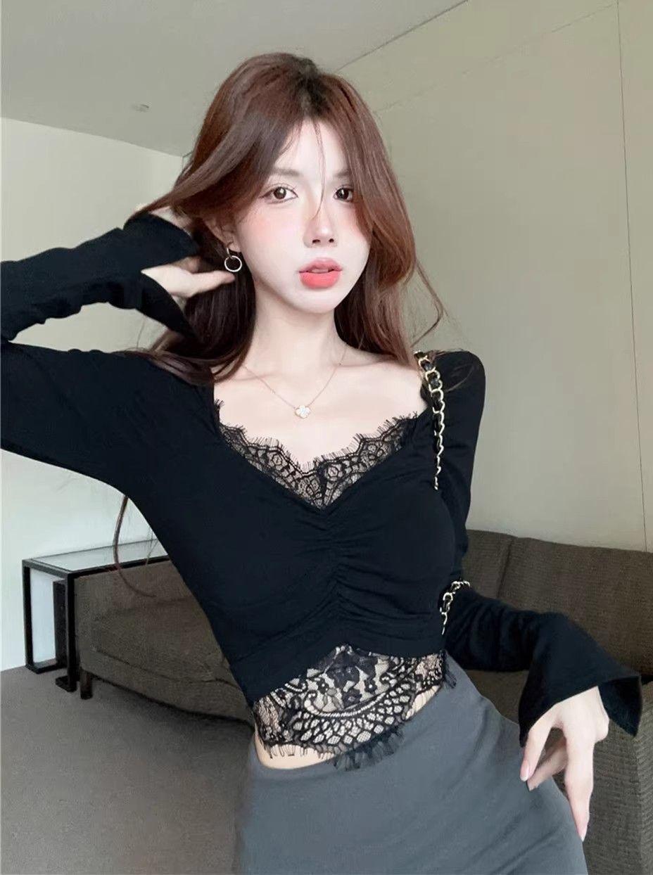 Camiseta básica de manga larga con cuello en V negra de estilo puro y sexy para mujer, otoño e invierno, chica caliente, sexy, encaje de retazos, top corto ajustado