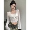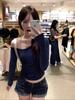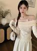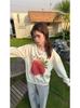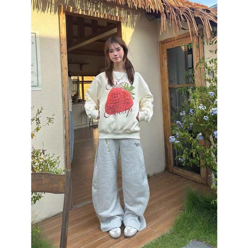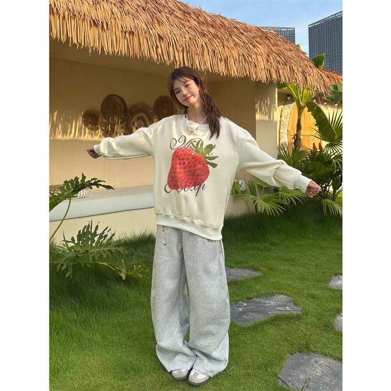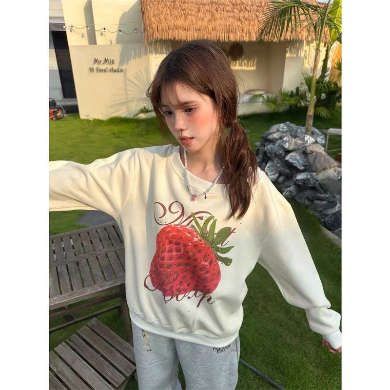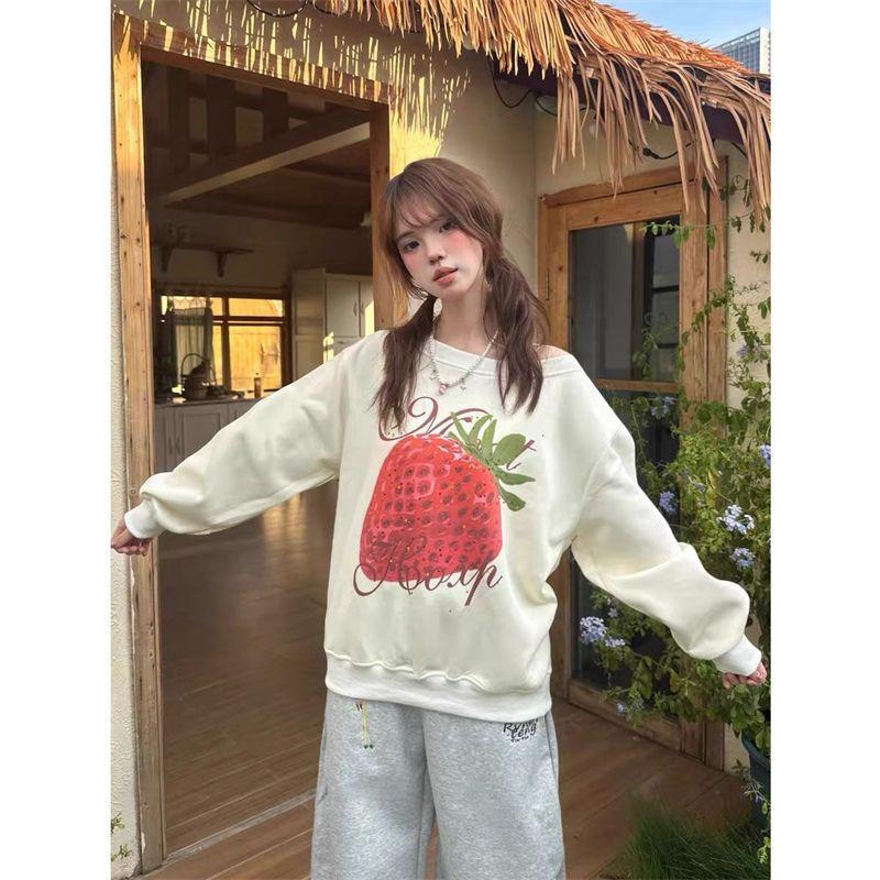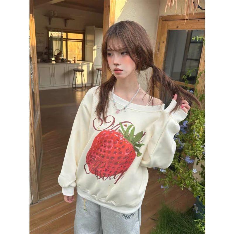 Sudadera Americana Estilo Chica Picante de un Hombro Manga Larga para Mujer Otoño e Invierno Nueva Estampado de Fresa Suelta Adelgazante Hombro Descubierto Top Blanco